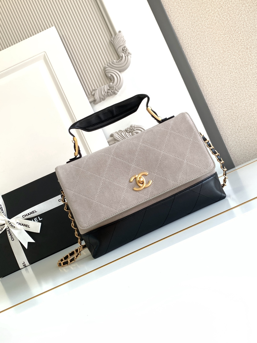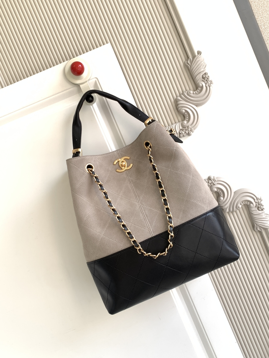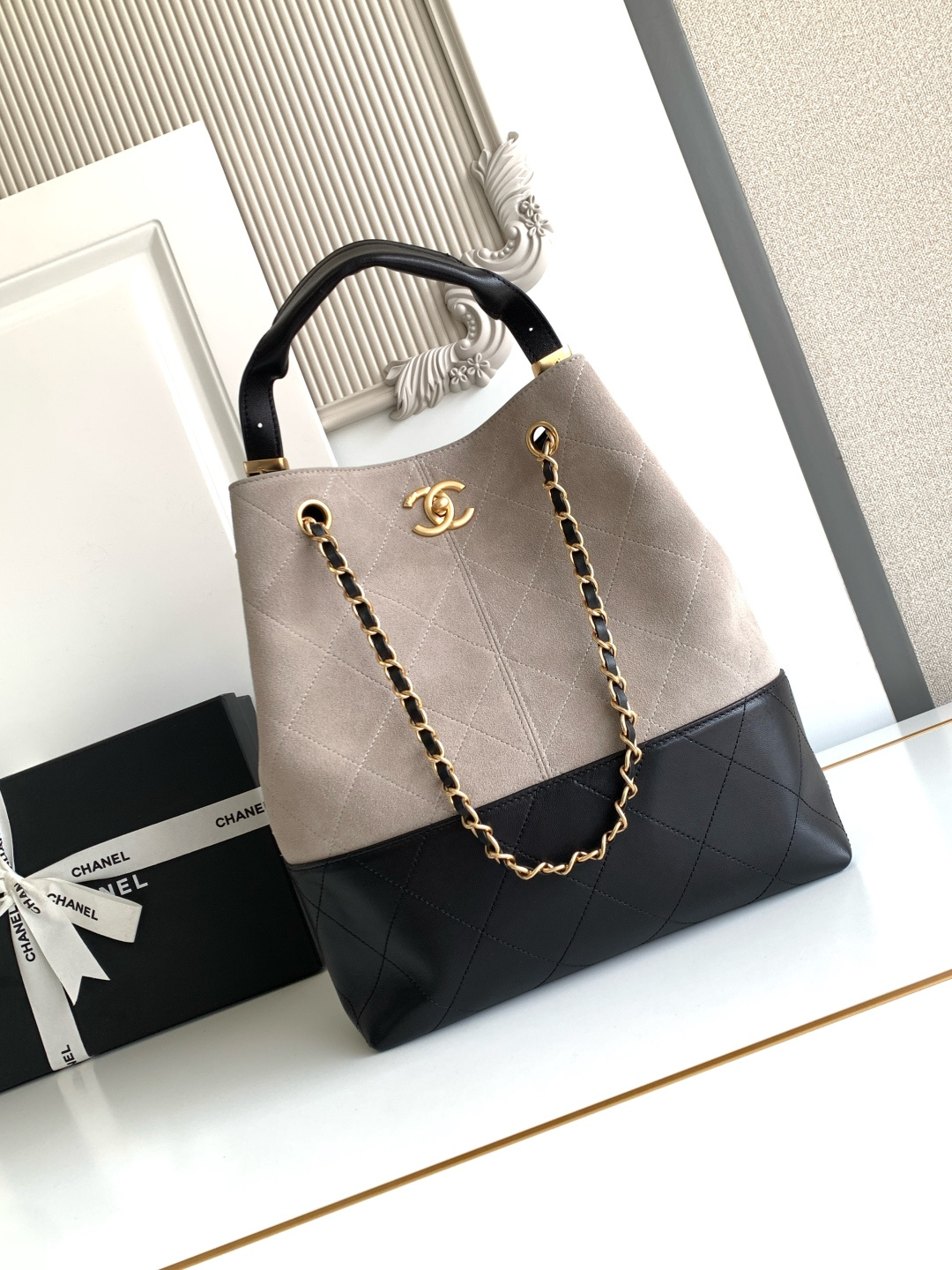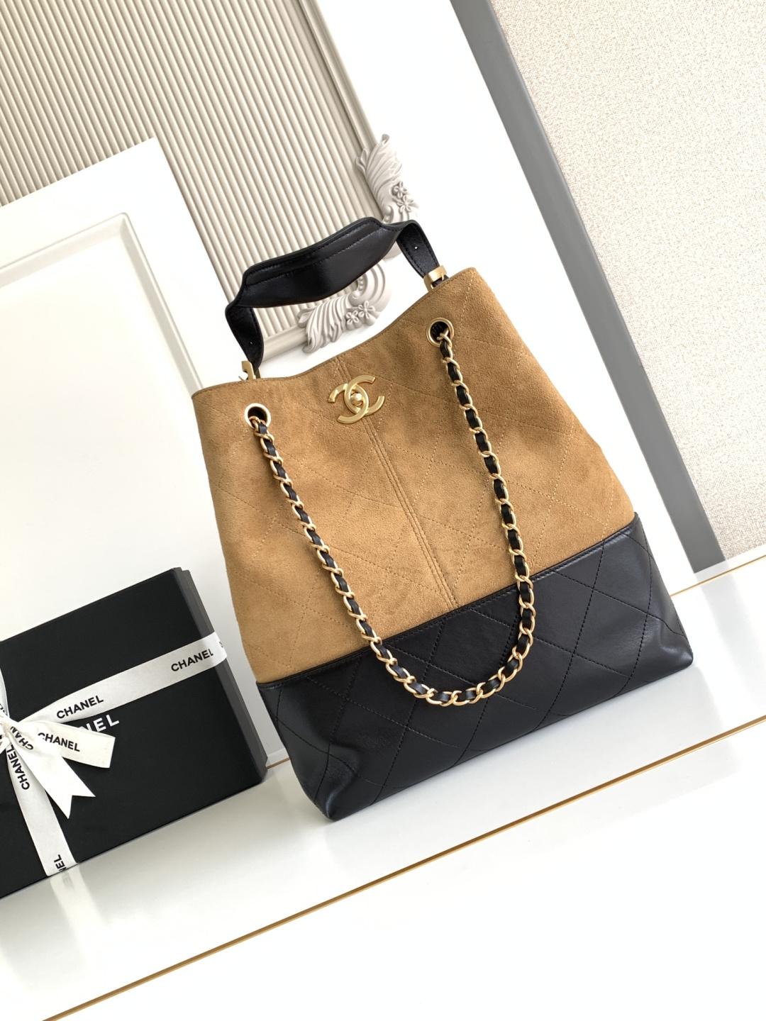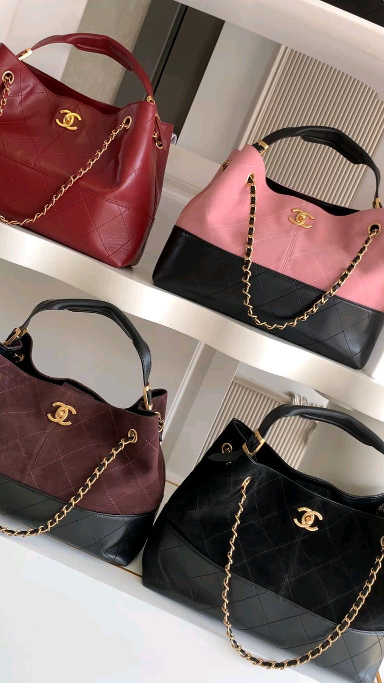 970 AS5634 CHEANL Chanel’s classic color-blocked tote bag, suede and leather collide, and the black gold chain adds sophistication. The