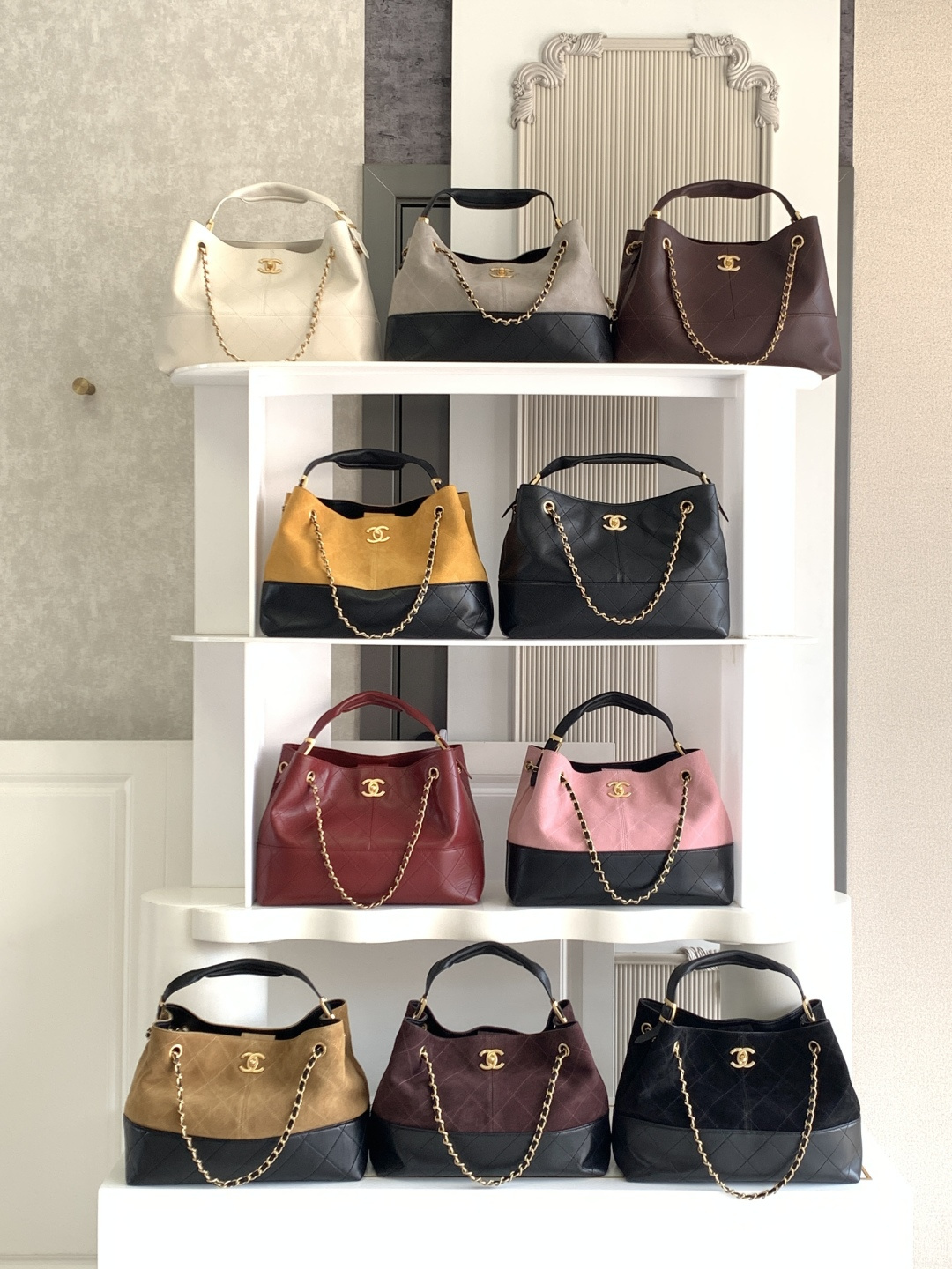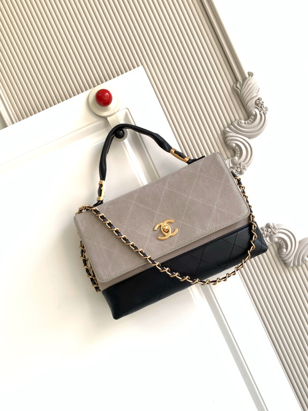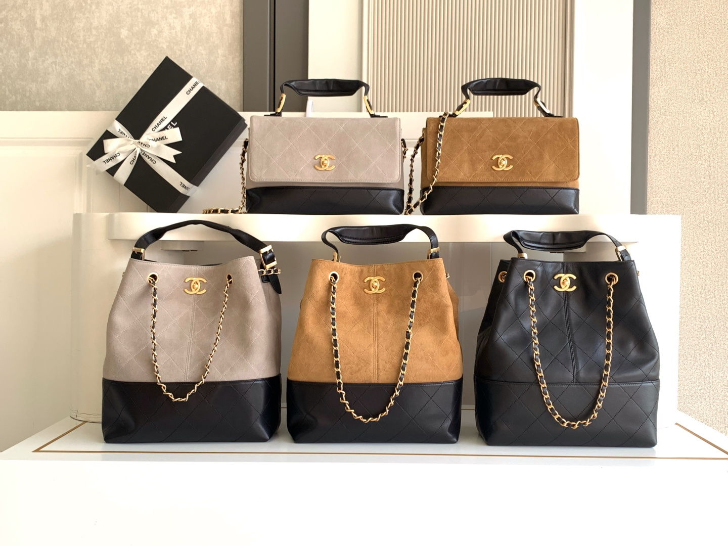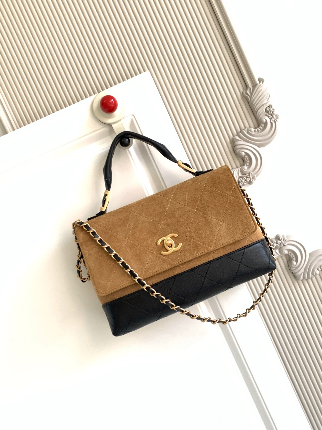 970 AS5634 CHEANL Chanel’s classic color-blocked tote bag, suede and leather collide, and the black gold chain adds sophistication. The