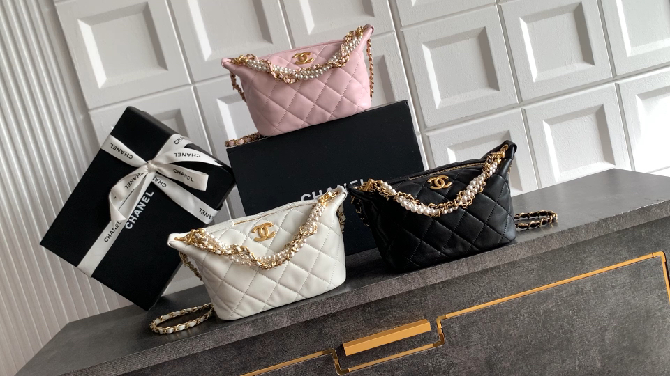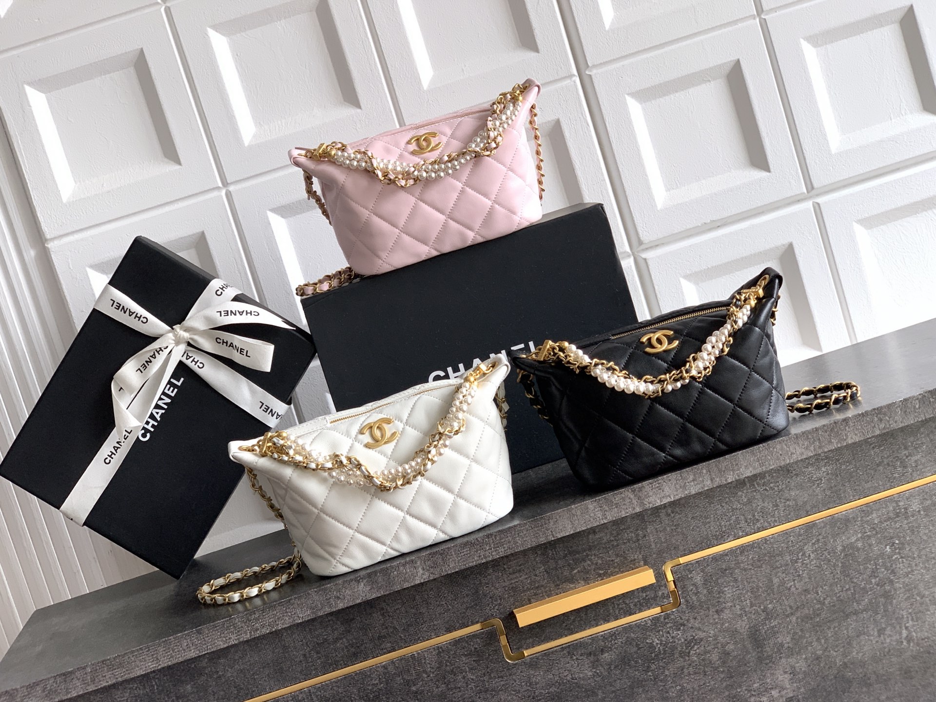 8 OHANEL26C series pearl chain lunch box bag, classic diamond pattern, lambskin, retro metal chain embellished with pearls, elegant and