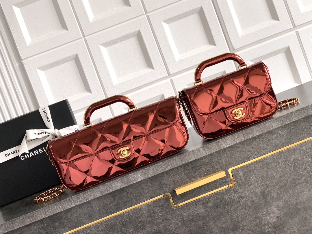 820 ️️️”Coffee Wine Red” small size same as OHANEL25k show ️gold patent leather handle flap bag patent leather mirror material
