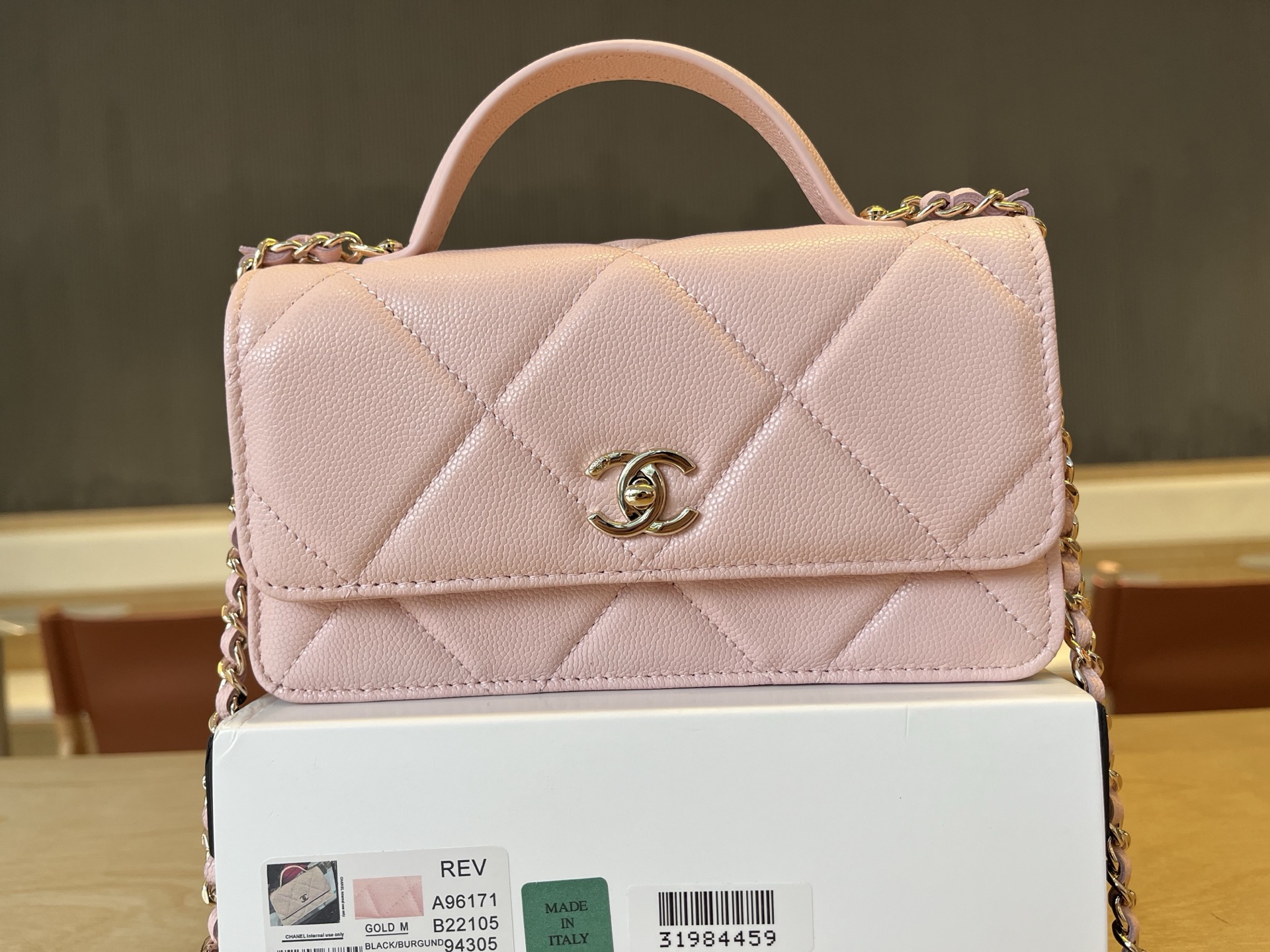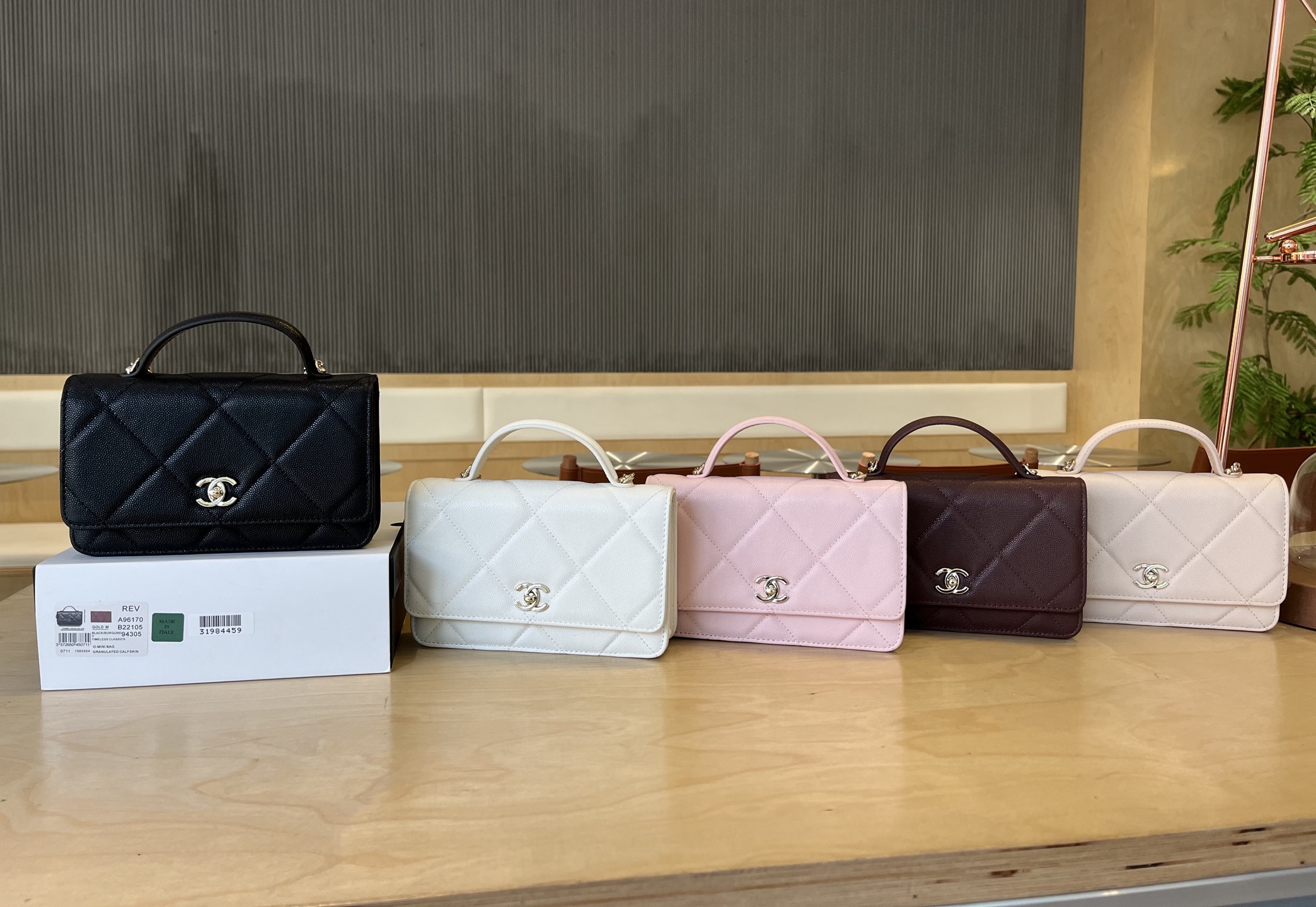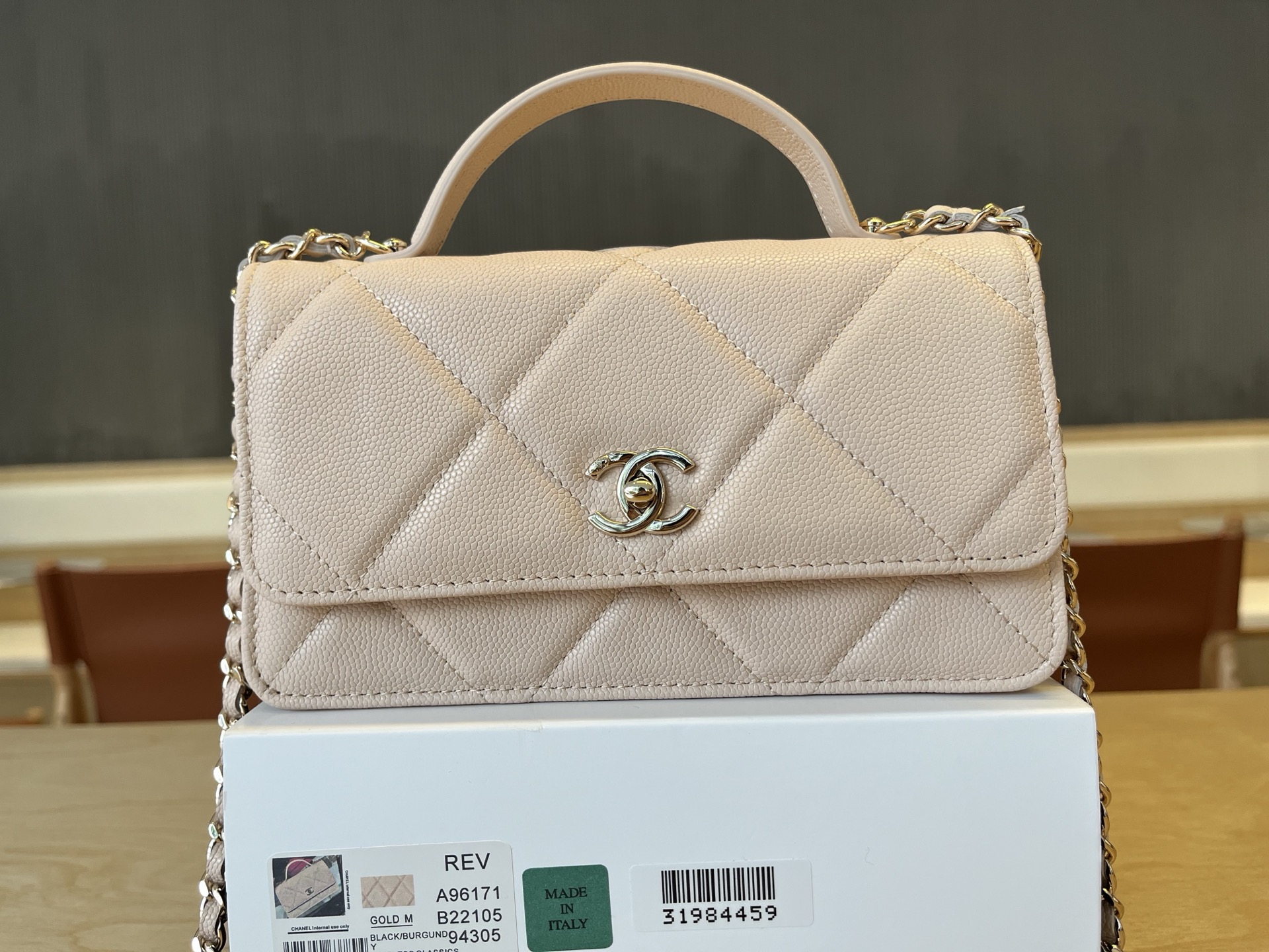750 A965B double C logo handle cosmetic case. Exquisite handle design is more fashionable. Grained cowhide with metal retro hardware.
