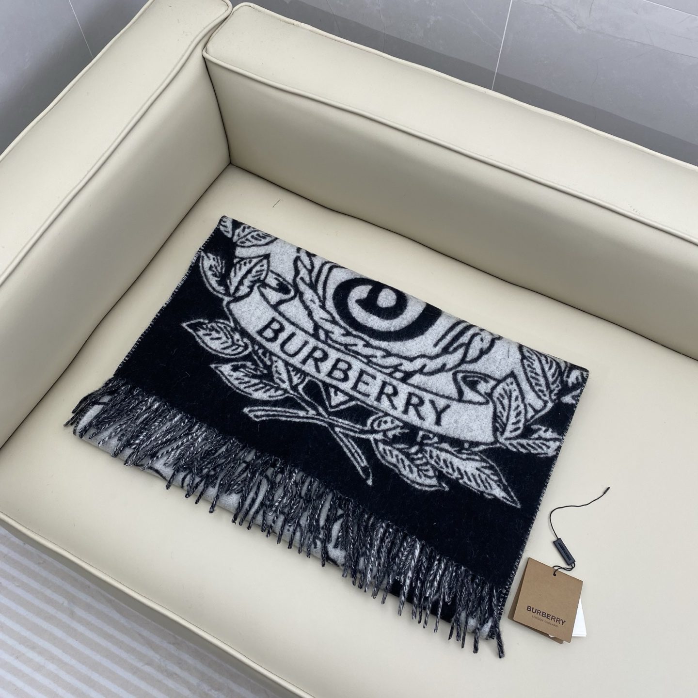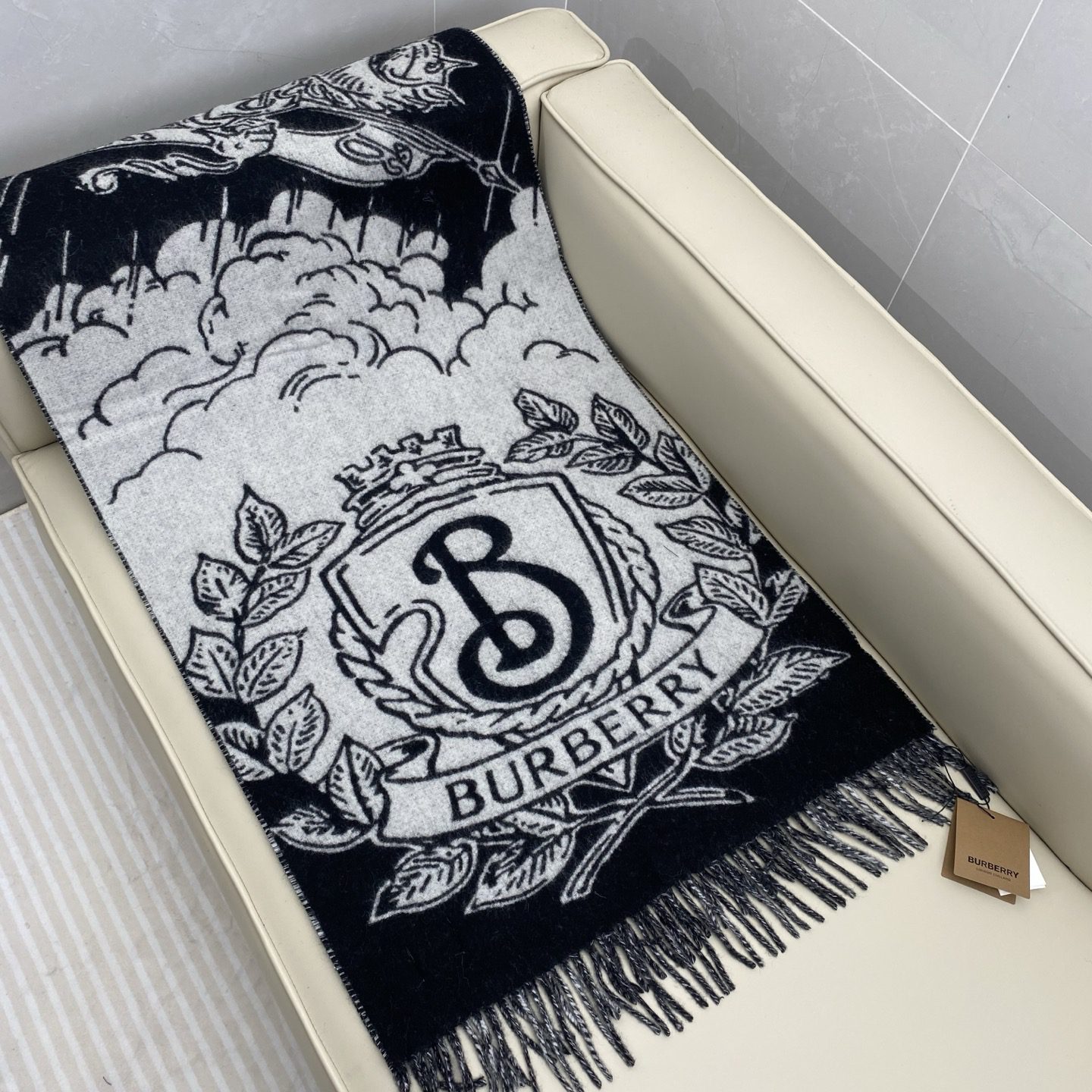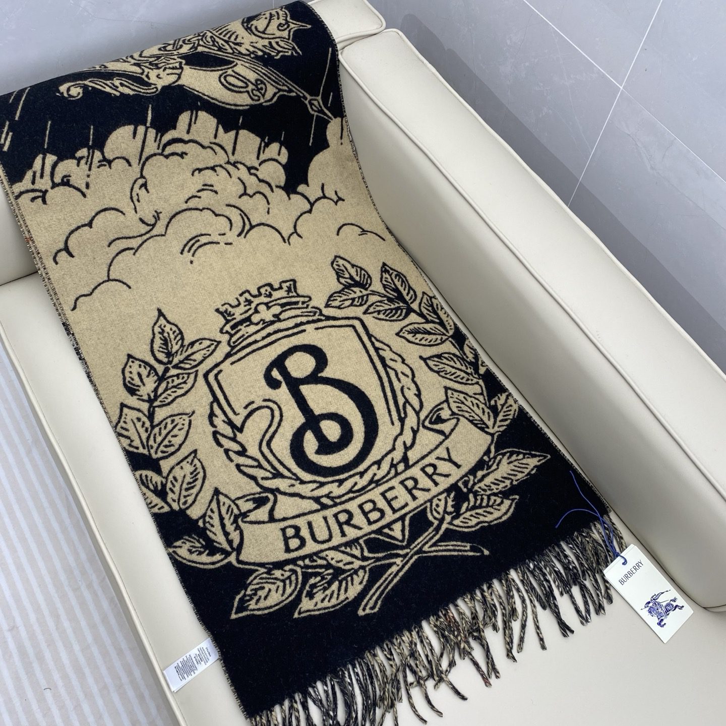 Bur cashmere scarf, crafted in Italian workshops. With the stormy night sky as the background, the equestrian knight logo (EKD)