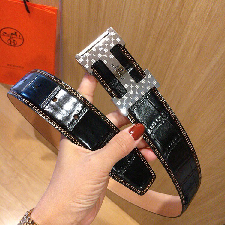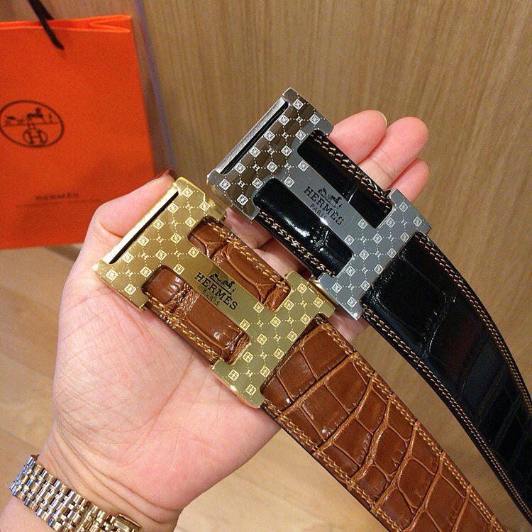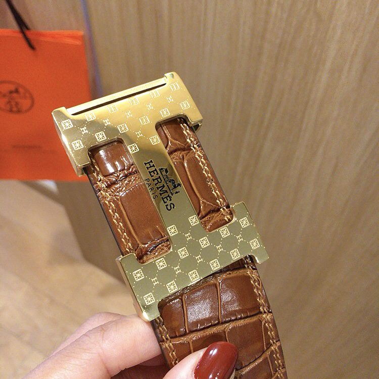 Belt Hermes (Hermes) cm double-sided original leather, double yellow line small crocodile pattern, Hermes