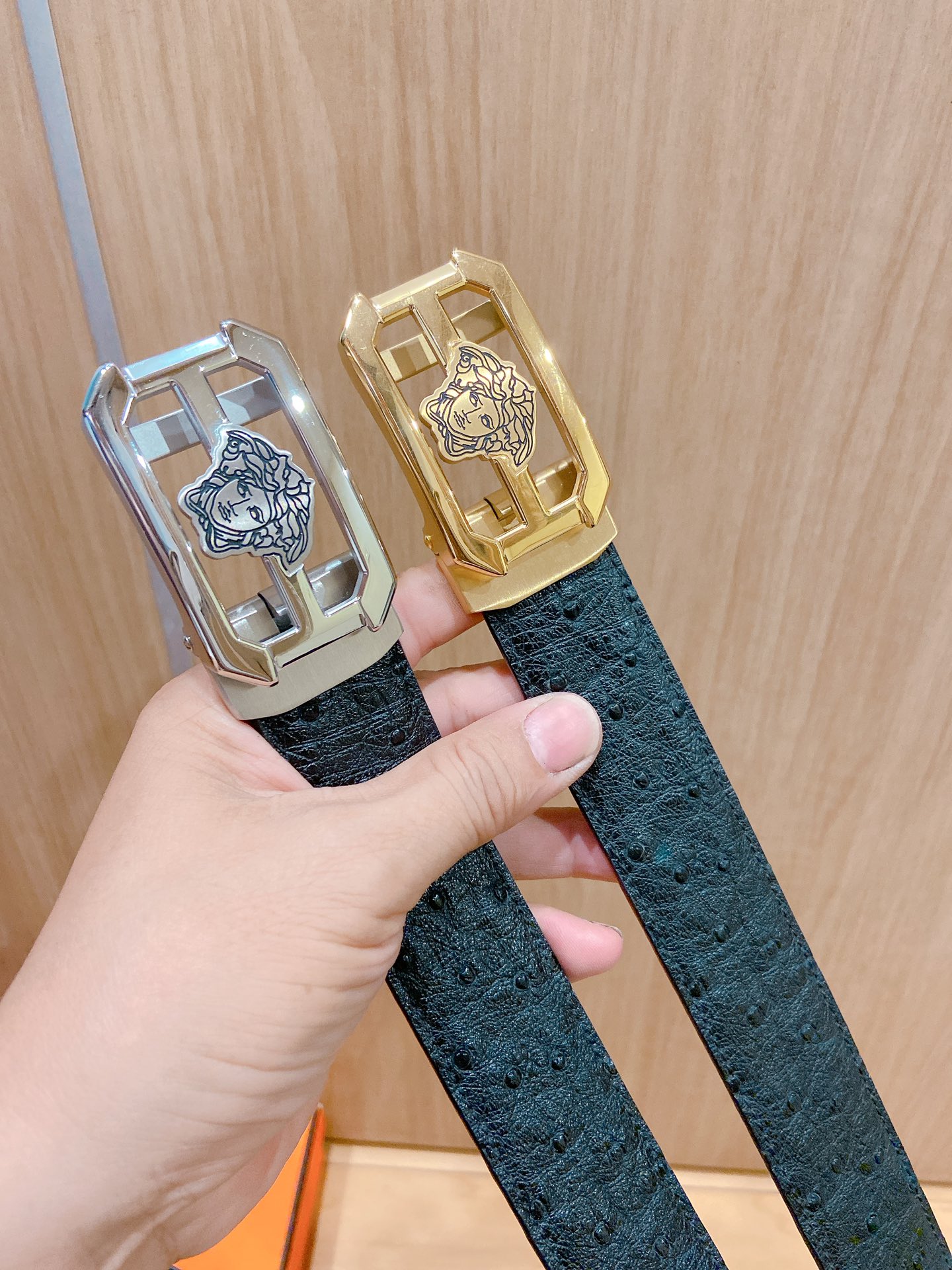 versace Versace automatic belt with steel buckle, ostrich leather, this Greek key embossed belt is equipped with an eye-catching Medusa