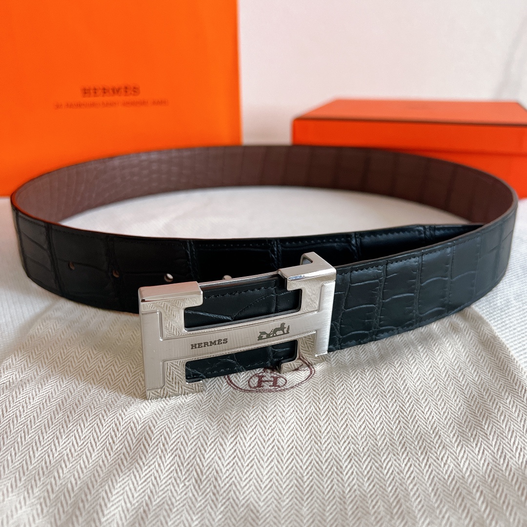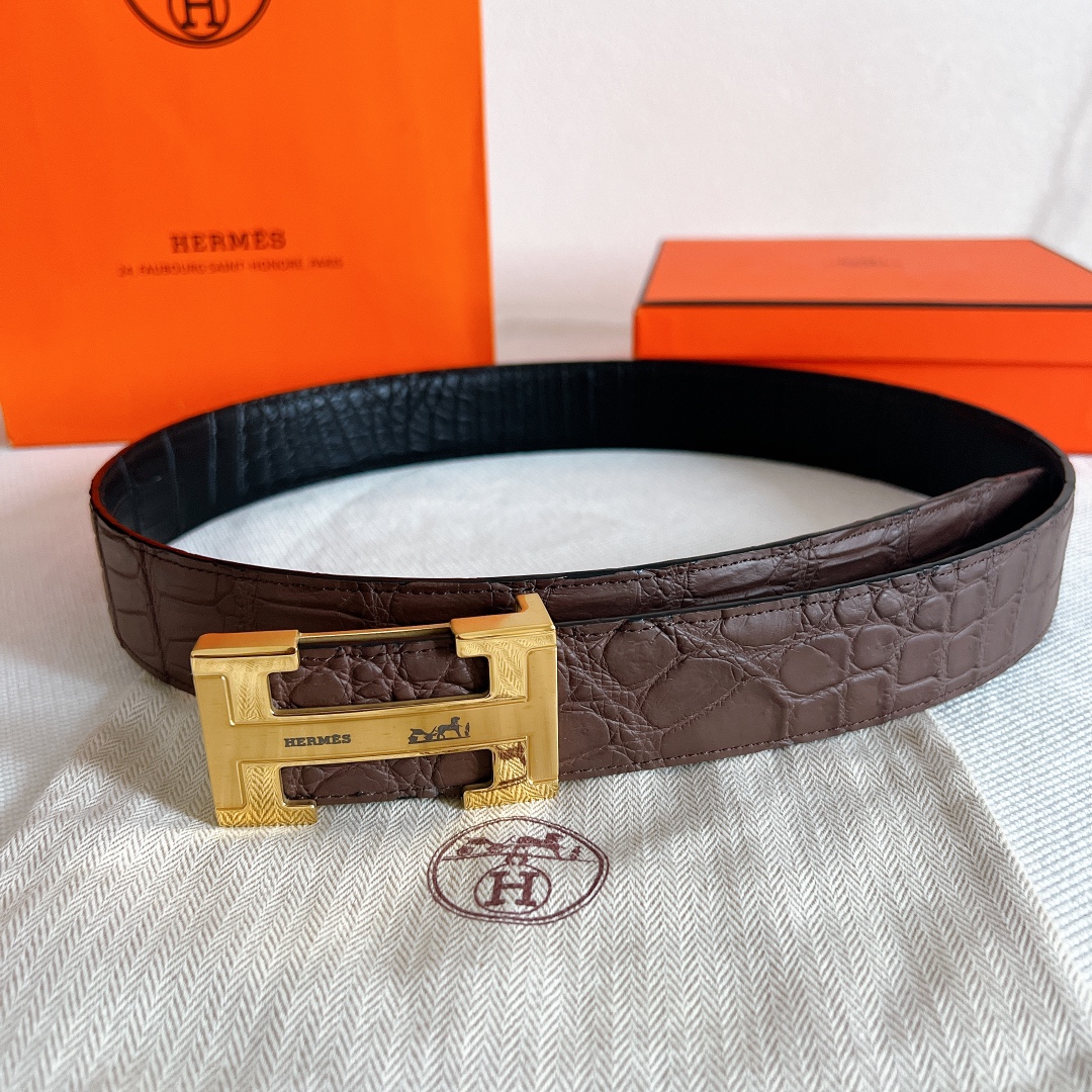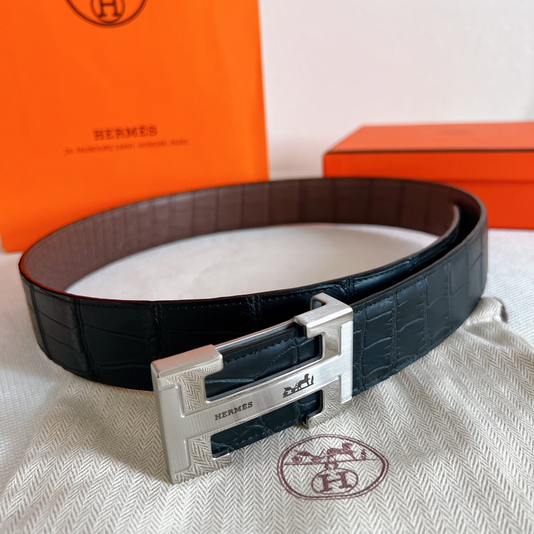 Belt Hermes cm double-sided crocodile leather pattern Hermès exclusive high-quality steel buckle with diamonds, with