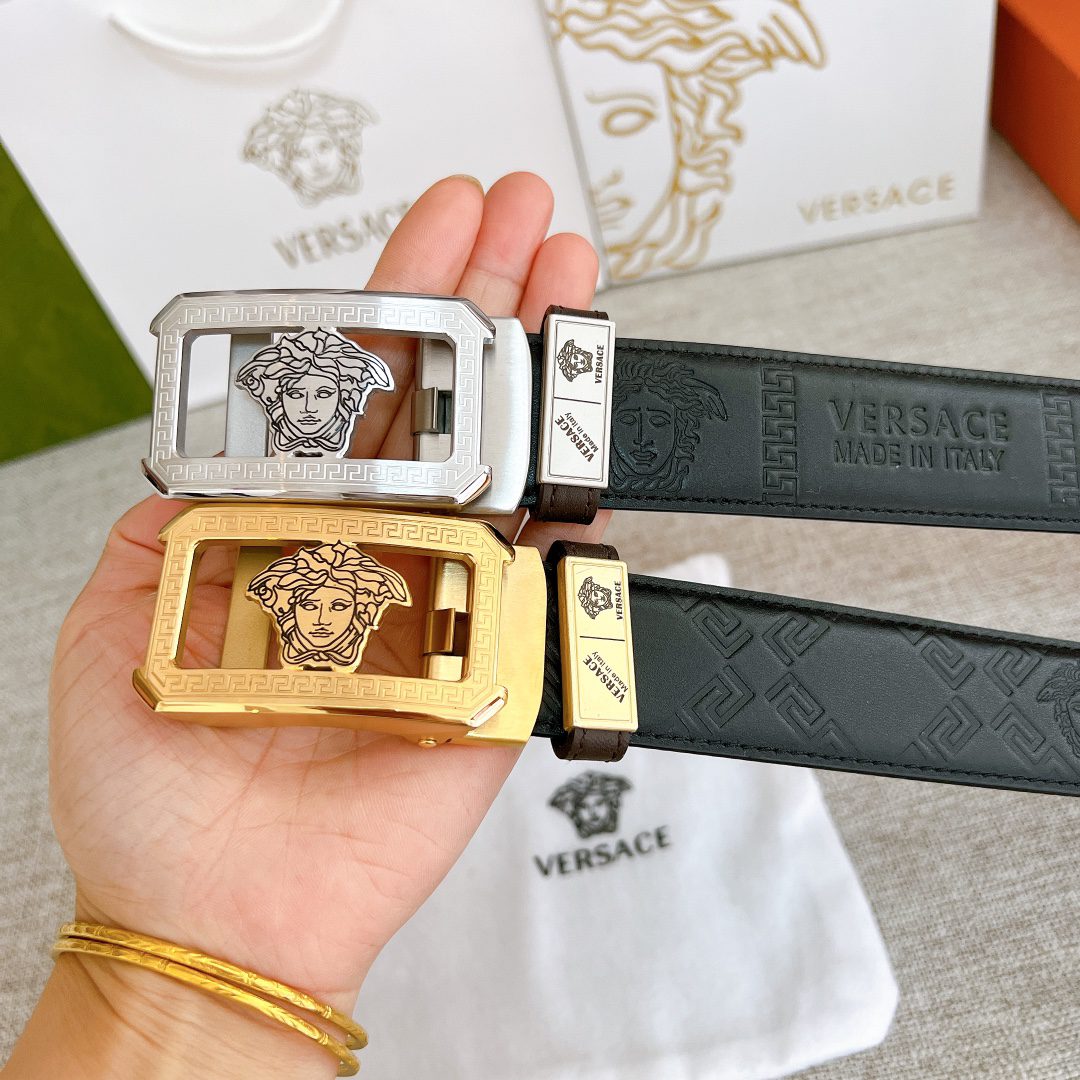 Belt Versace automatic strap with steel buckle, this Greca embossed belt features a striking Medusa head