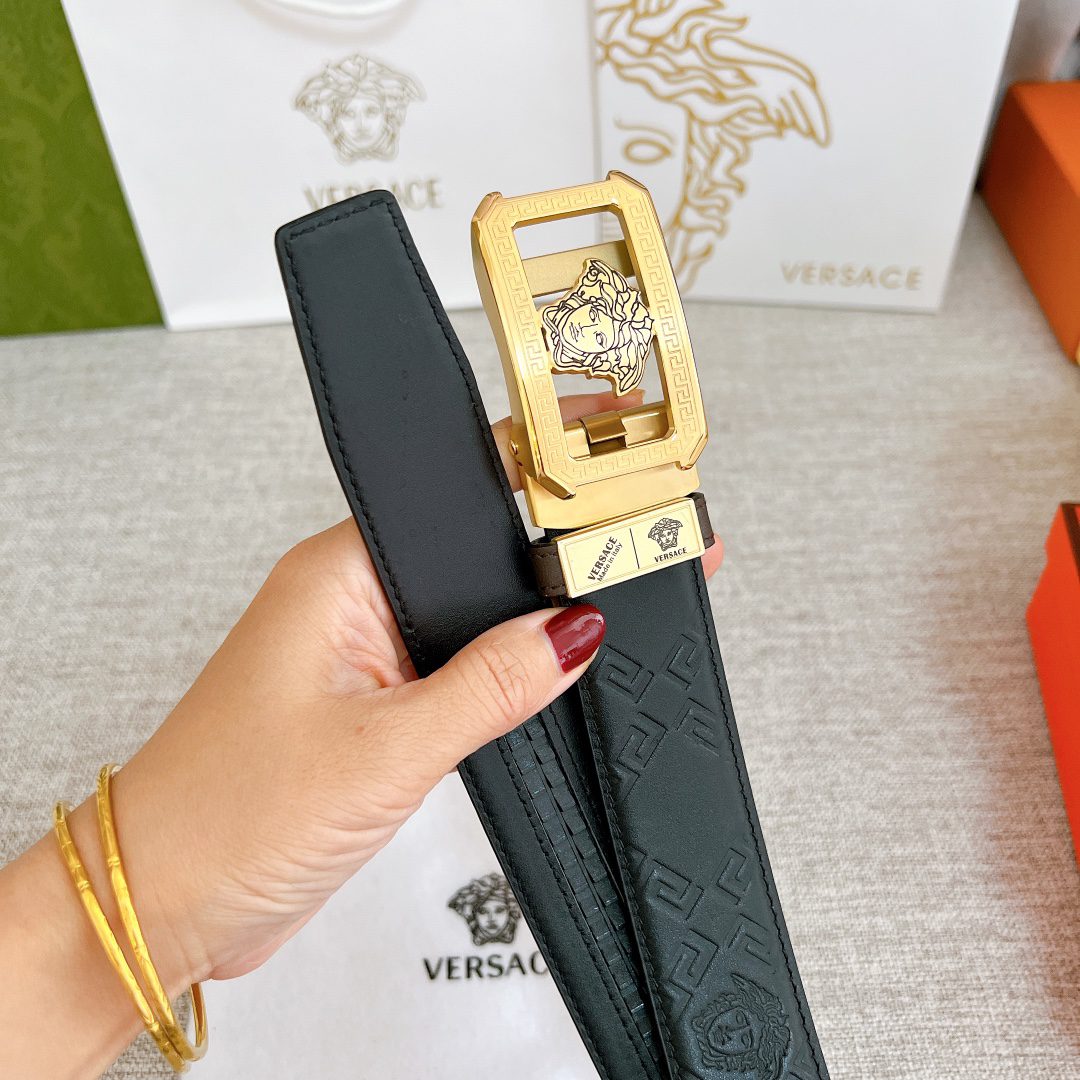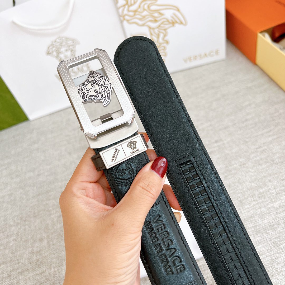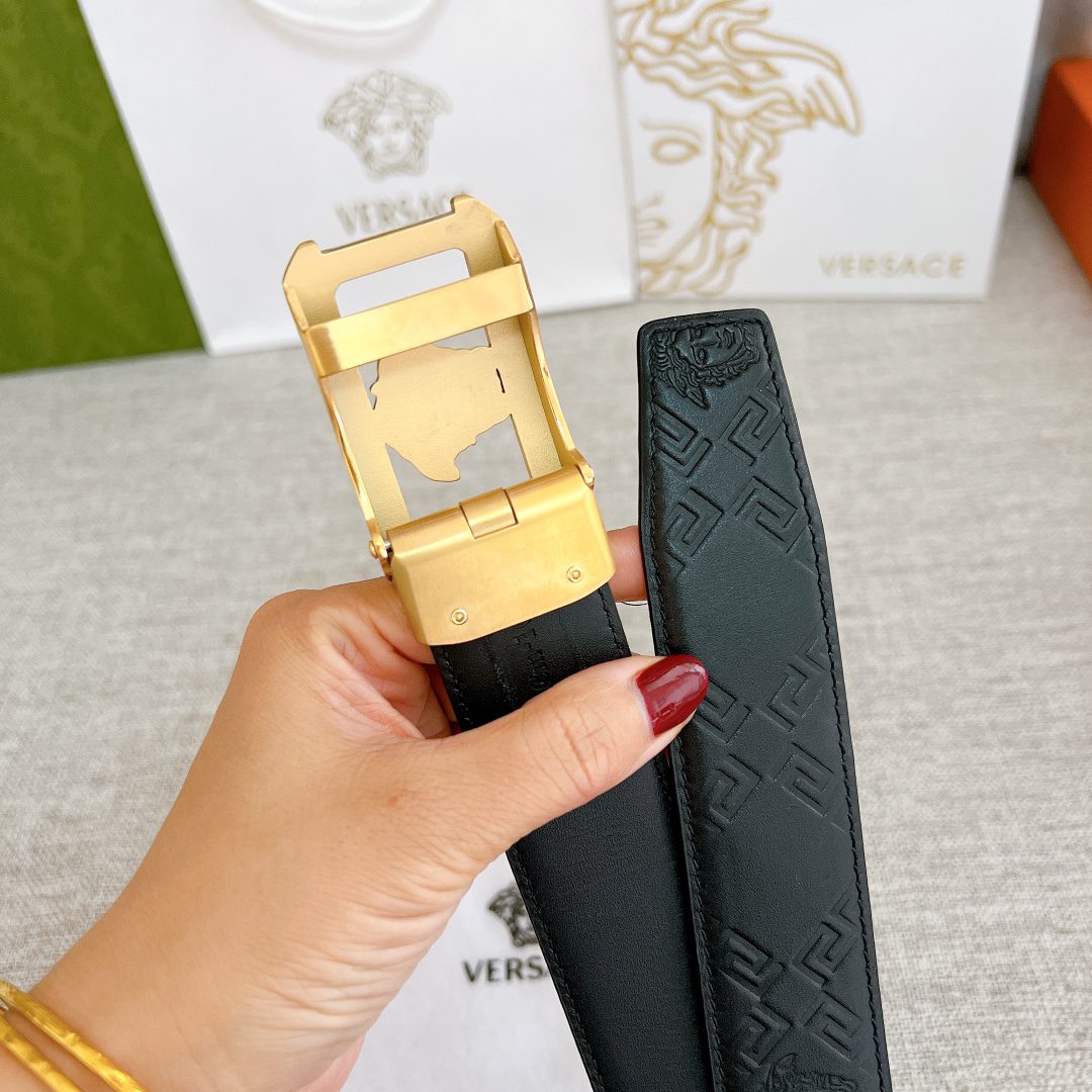 Versace automatic belt with steel buckle, this Greek key embossed belt is equipped with an eye-catching Medusa head buckle, which