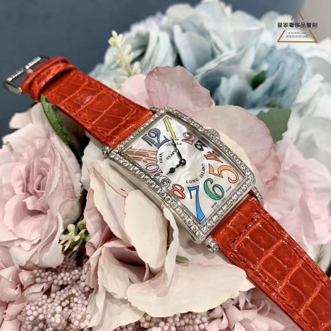 Frank Muller LONG ISLAND 952QZ series literal: arched mother-of-pearl face, with colorful enamel Arabic numeral time scales, using high-grade mother-of-pearl
