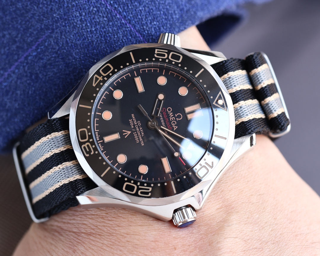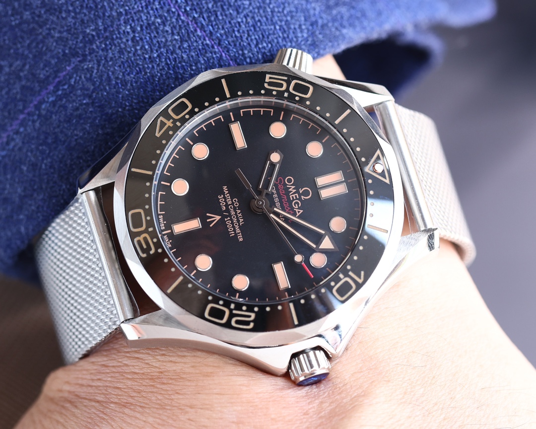 The 007 version of the Seamaster series watch has a titanium case with a width of 42 mm. The black