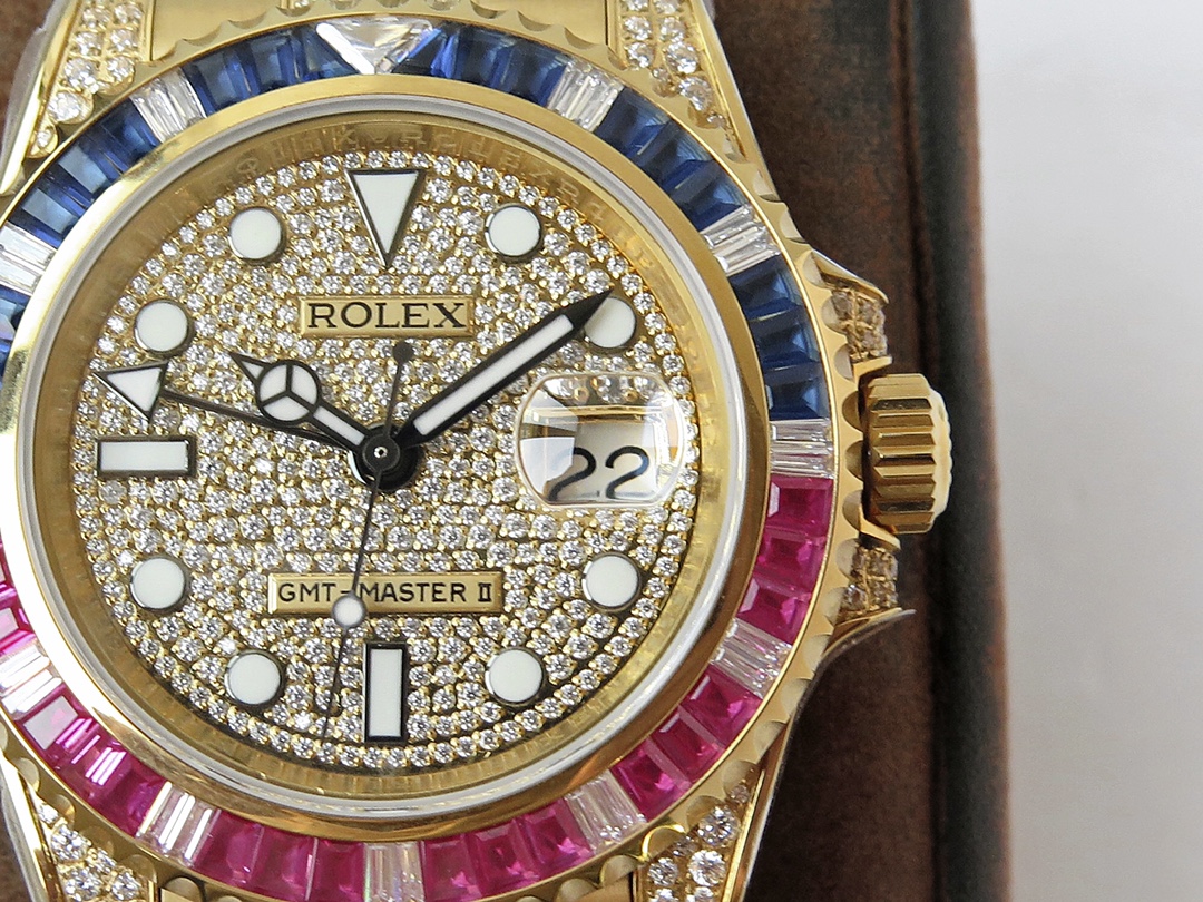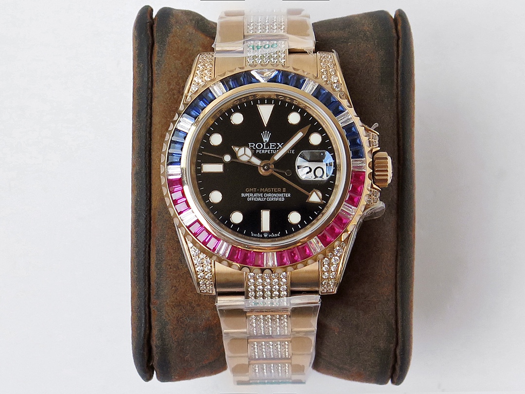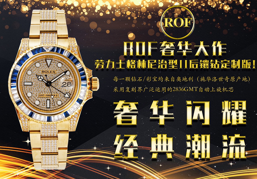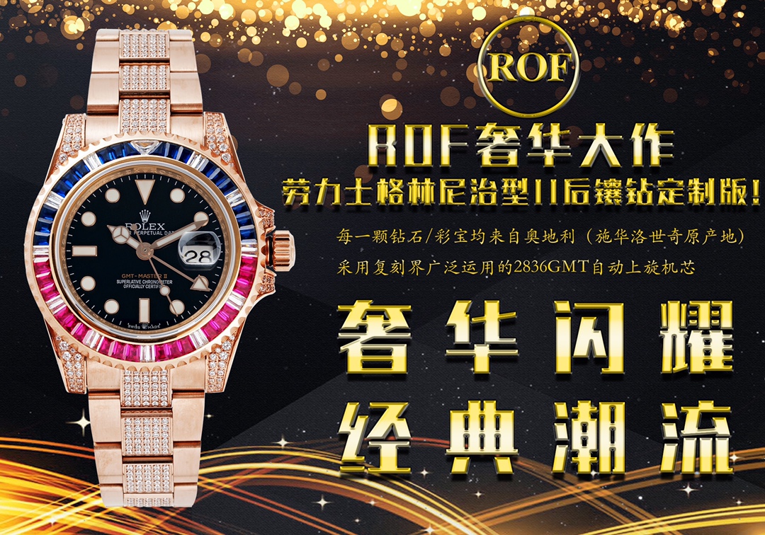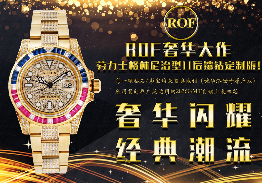 ROF’s luxury masterpiece, a customized version of the Rolex GMT Master II set with diamonds on the back! It is luxurious and sparkling, and it is also classic and trendy.