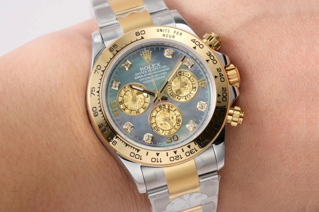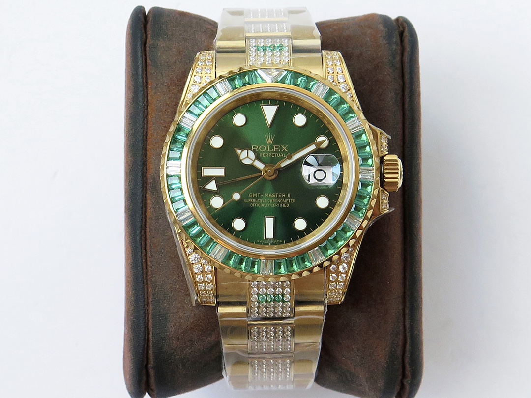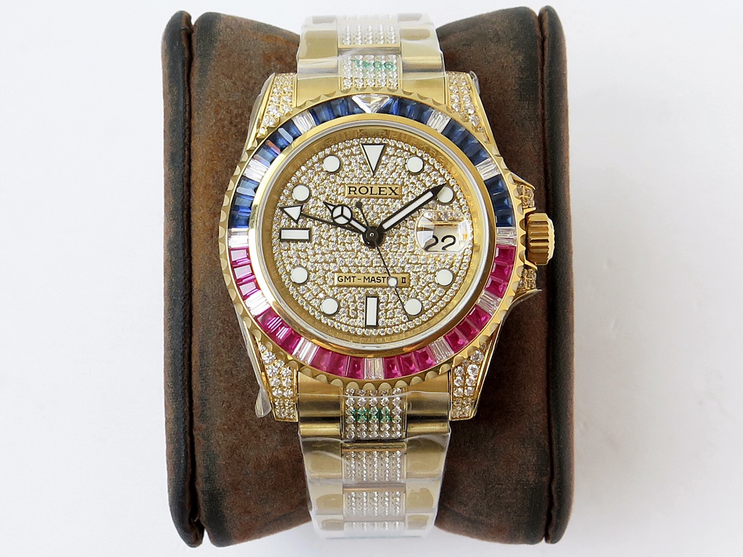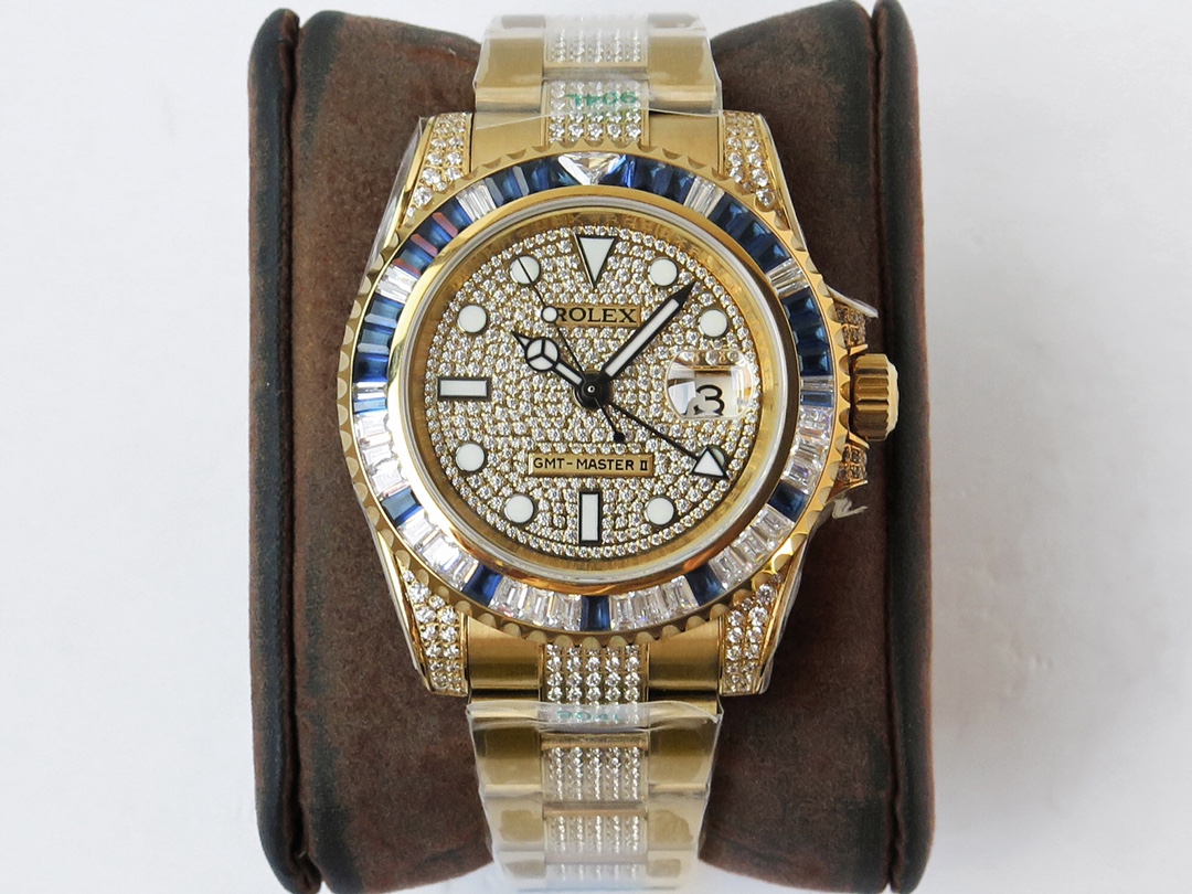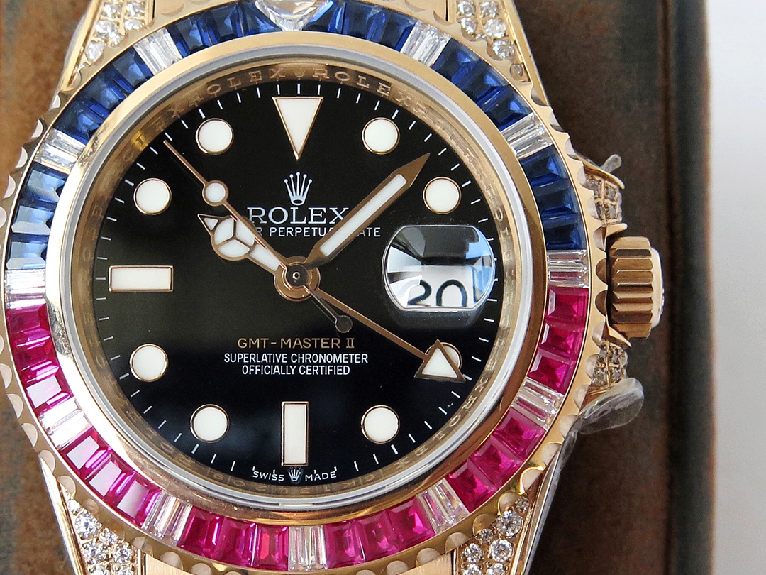 ROF’s luxury masterpiece, a customized version of the Rolex GMT Master II set with diamonds on the back! It is luxurious and sparkling, and it is also classic and trendy.