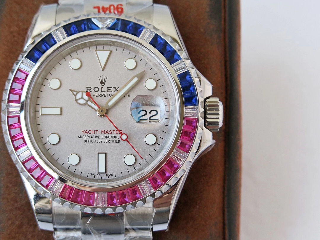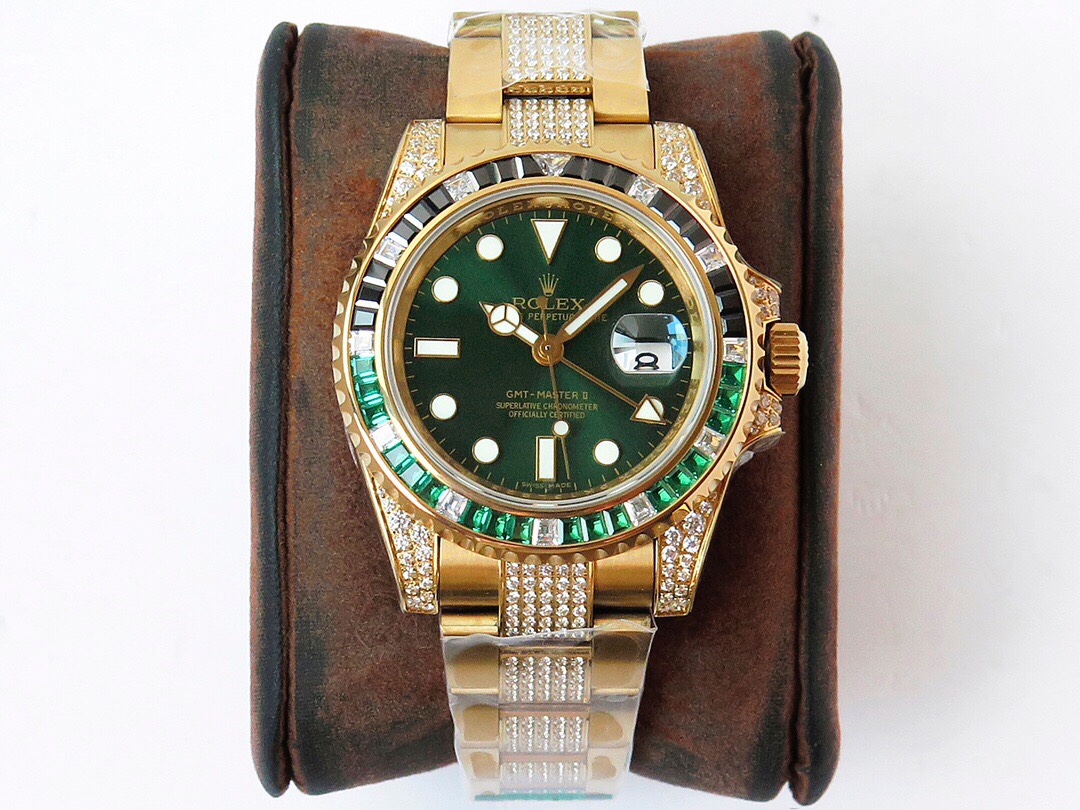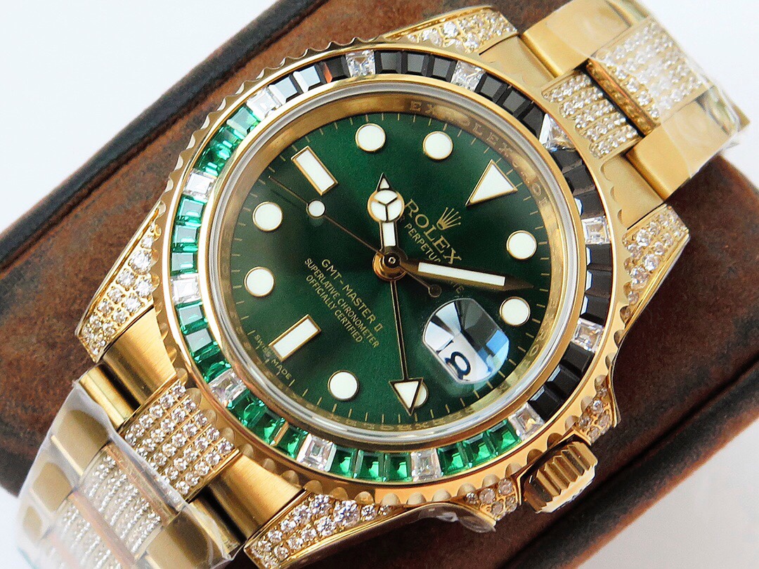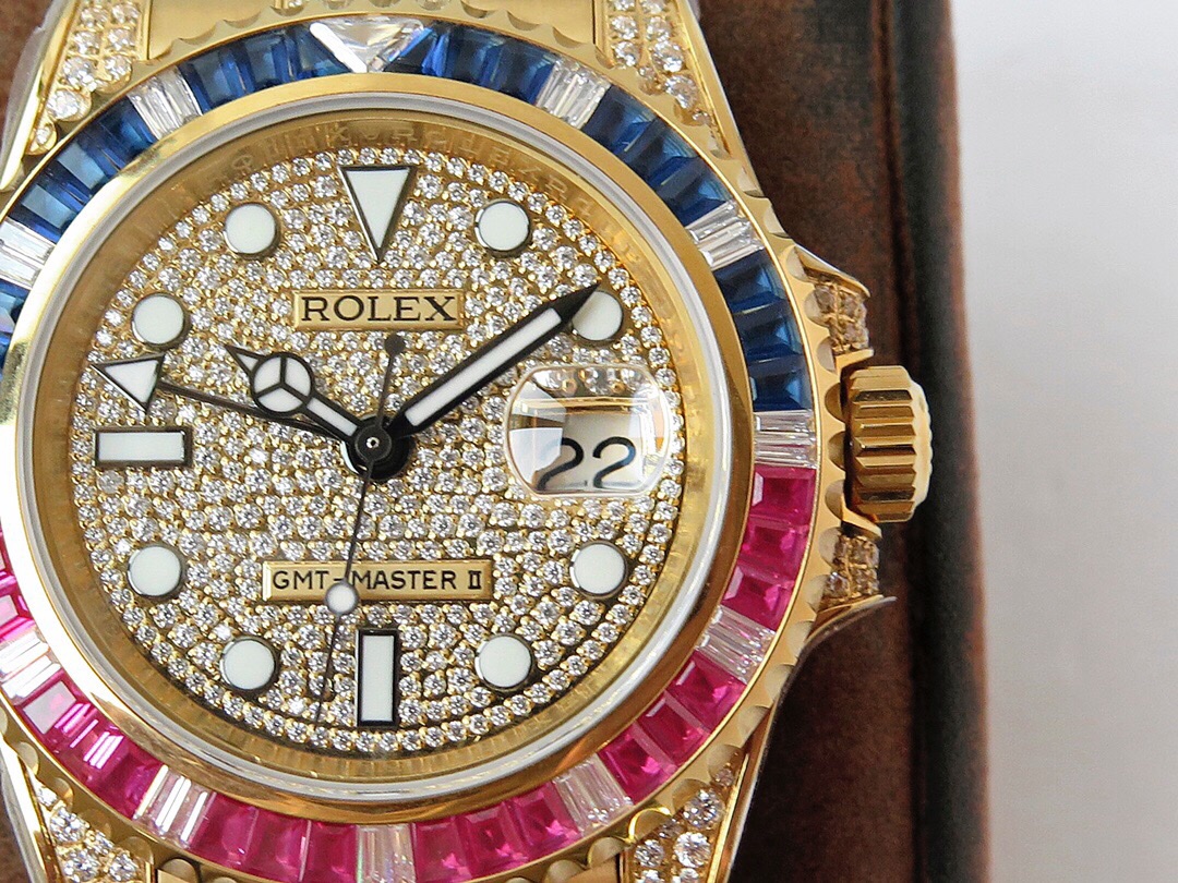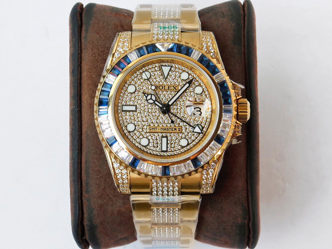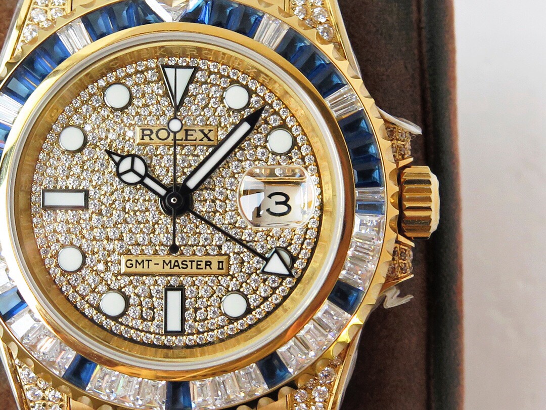 ROF’s luxury masterpiece, a customized version of the Rolex GMT Master II set with diamonds on the back! It is luxurious and sparkling, and it is also classic and trendy.