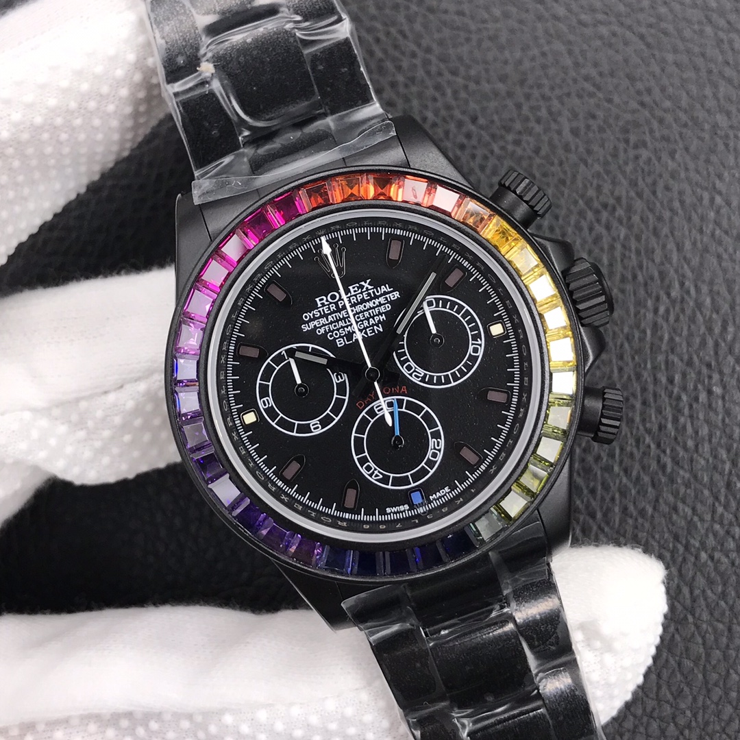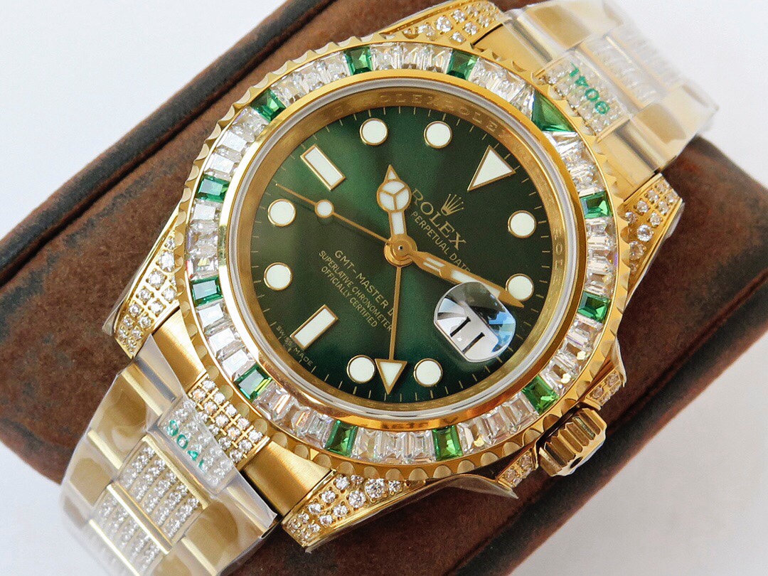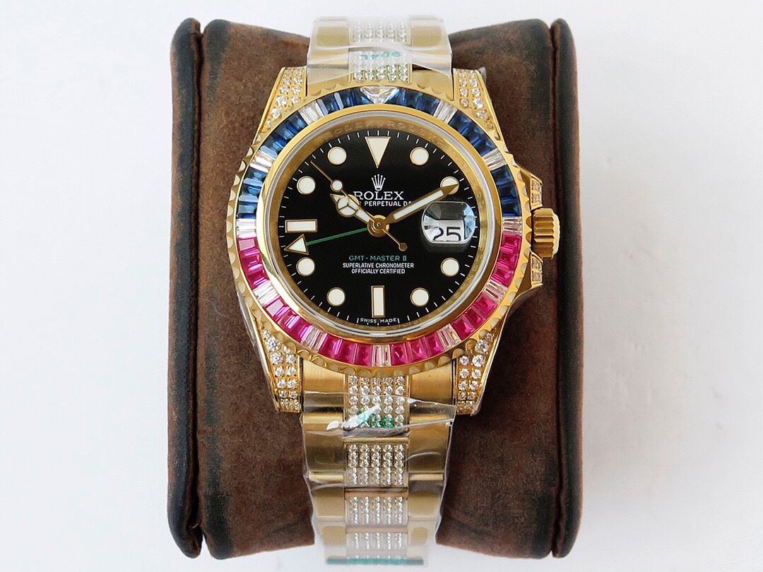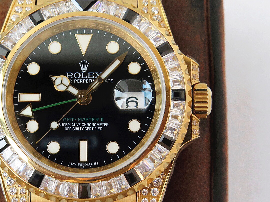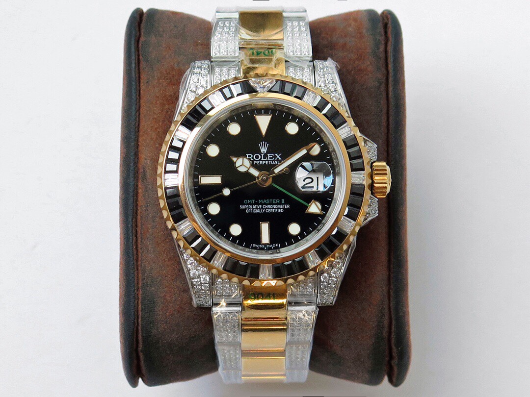 ROF’s luxury masterpiece, a customized version of the Rolex GMT Master II set with diamonds on the back! It is luxurious and sparkling, and it is also classic and trendy.