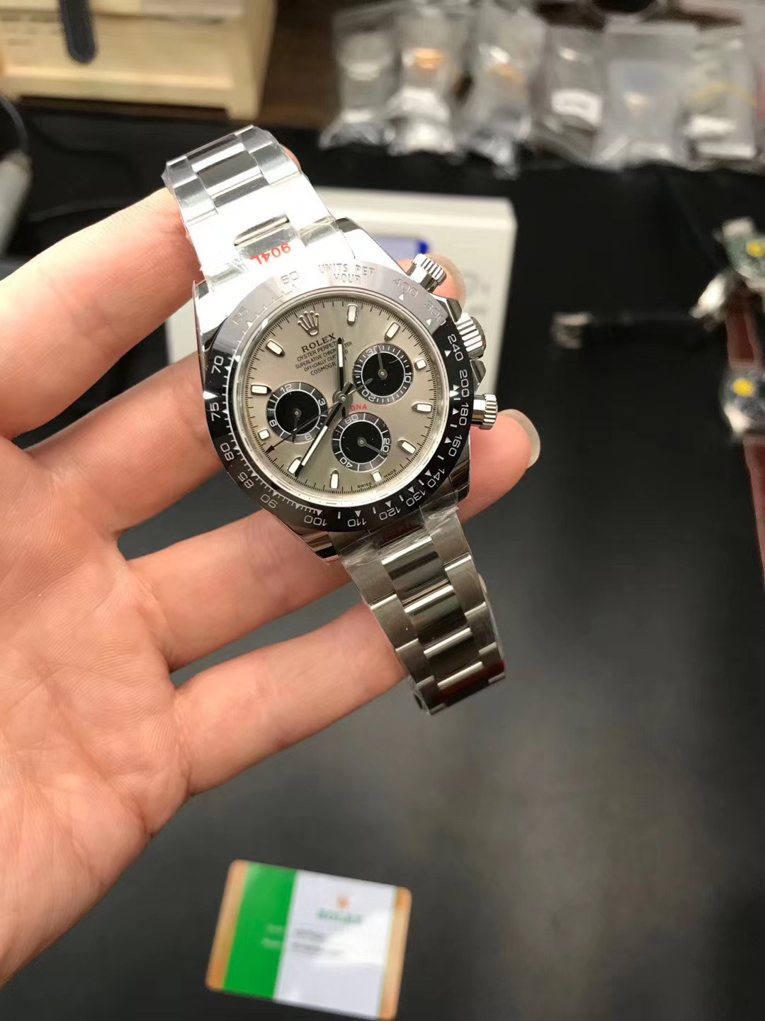 The latest version of the Rolex Daytona steel band with gray surface, ceramic ring, one watch, one card and one