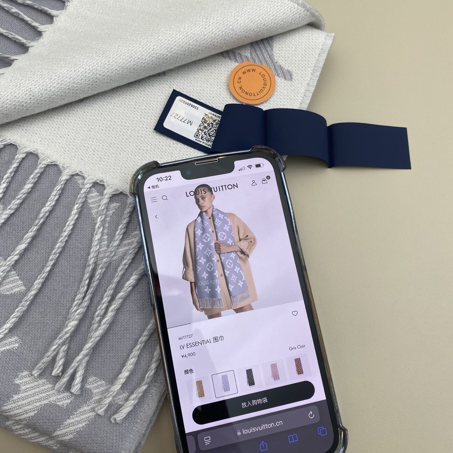𝐋𝐕 Jacquard textured letter scarf 0% sheep wool LV ESSENTIAL scarf lengthens the distance between elements in the classic Monogram pattern, presenting a refreshing look. Sheep wool brings a soft and warm feel, and the Louis Vuitton logo and fringed trim complete the look, adding a casual touch to the Reykjavik and Logomania scarves. The QR code at the bottom of the label has a built-in chip. Professional dry cleaning recommended.