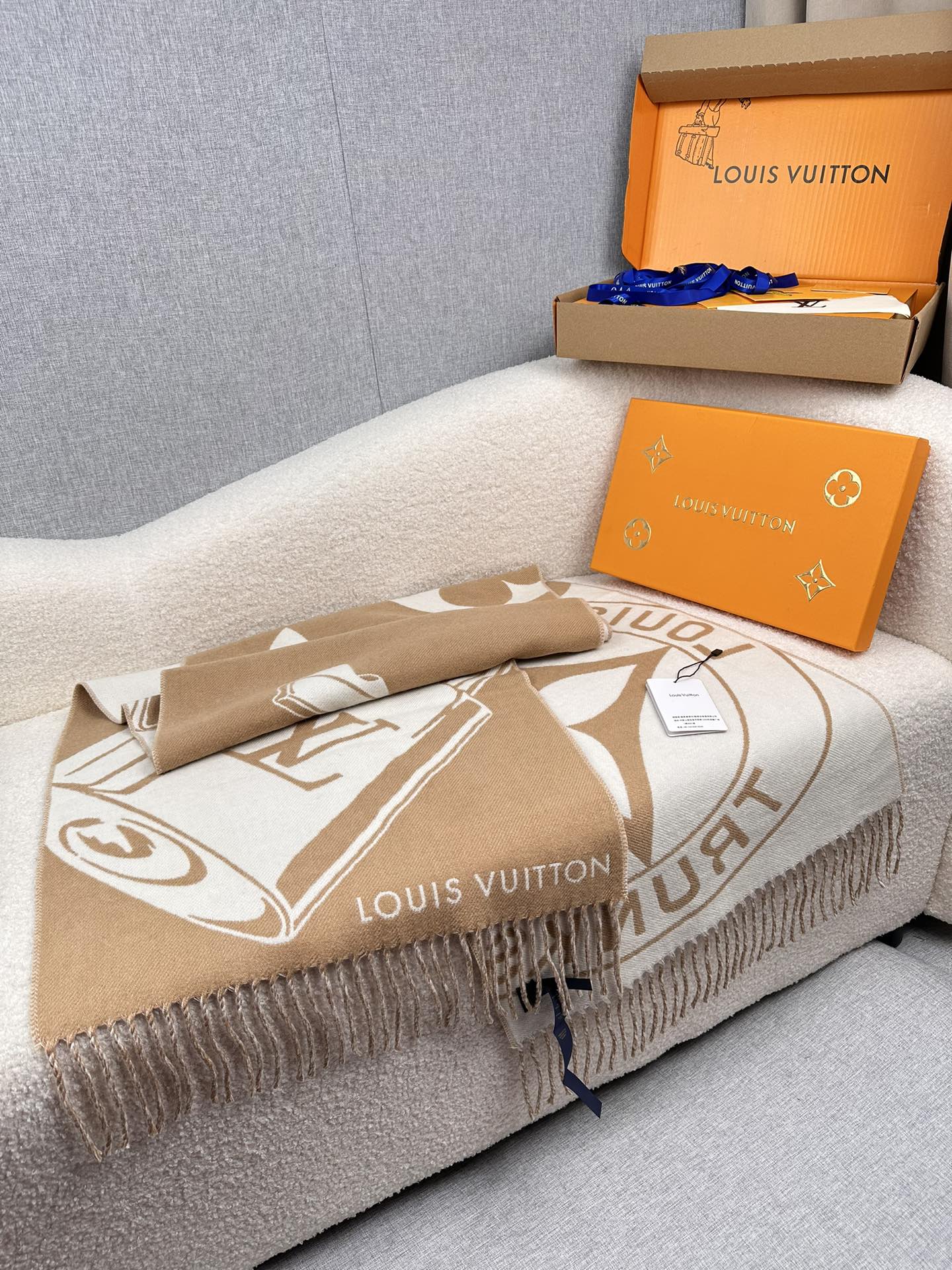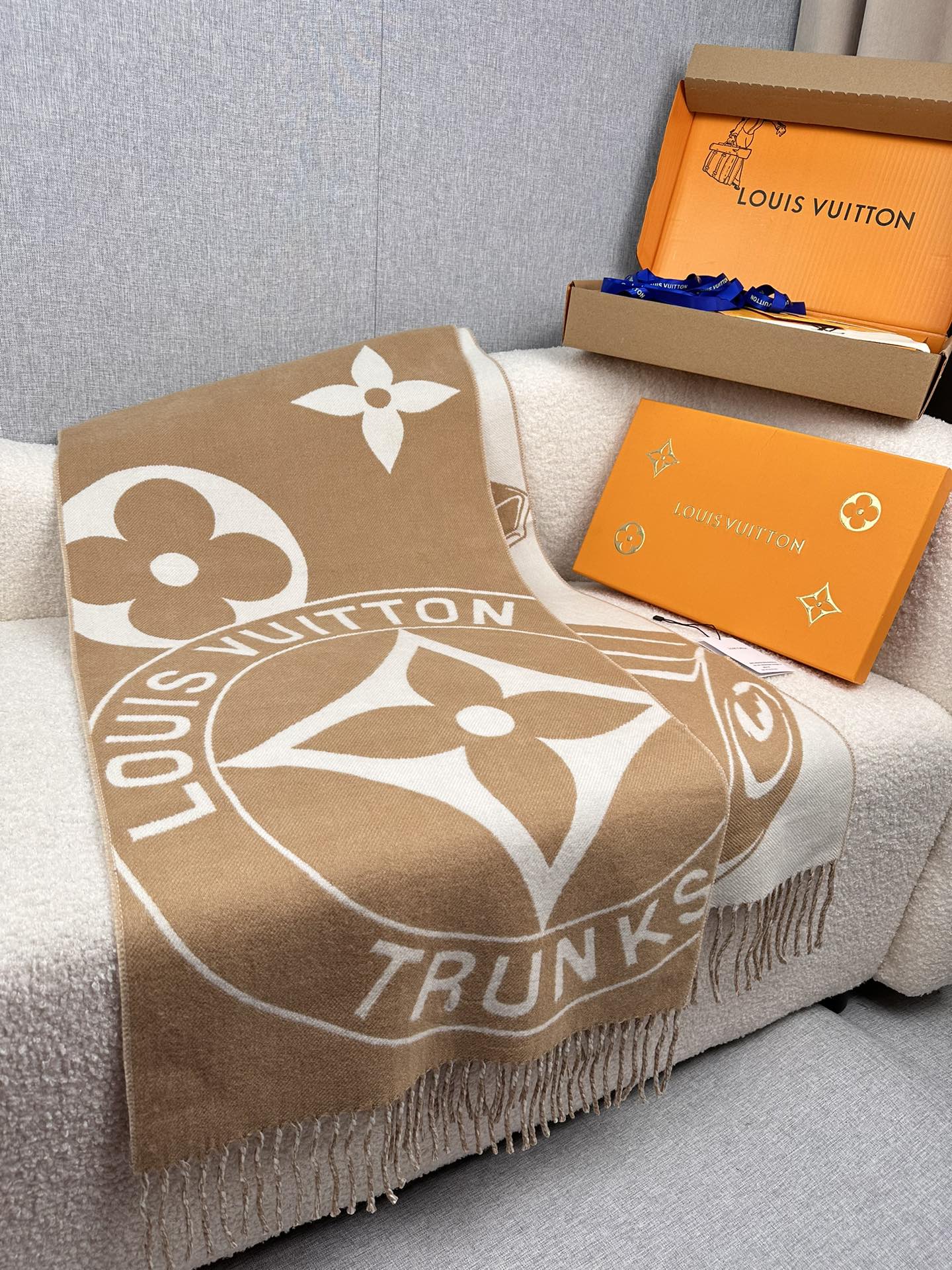 🧣Top version🧣 ¥.00. L family. The Lock And Keys scarf is made of warm plush blended knitted fabric. One side depicts the LV padlock and key pattern, and the Louis Vuitton Trunks medallion appears when reversed, recalling the brand’s trunk-making heritage with a playful touch. 45 x 2% sheep wool, 40% cashmere Padlock and key pattern Louis Vuitton trunk and Monogram floral fringe trim