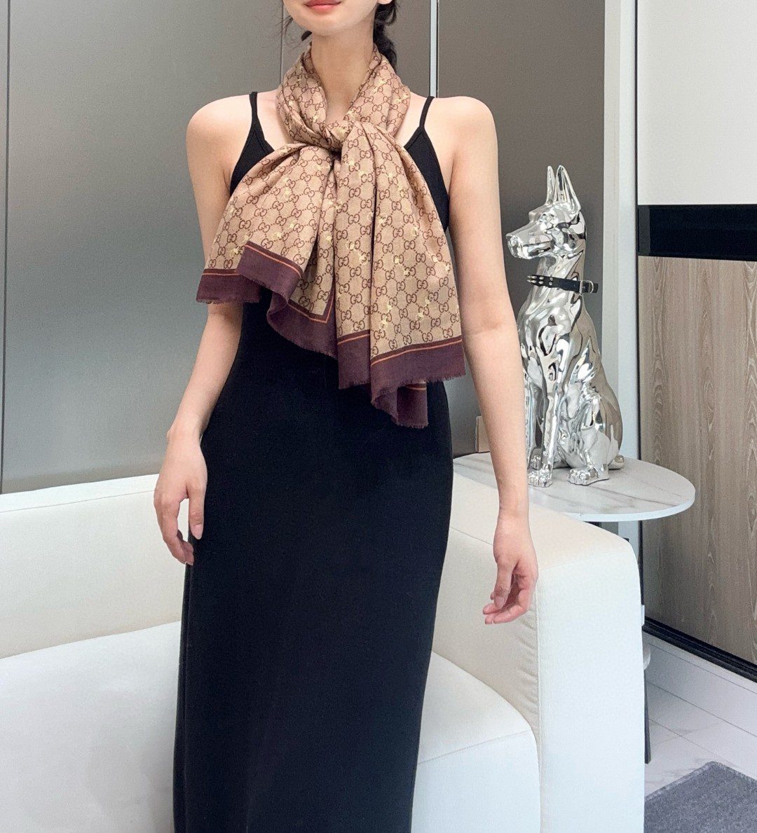 🧣Top version🧣 0 [GG Horsebit Cashmere Square Scarf] Cashmere square scarf, using the classic GG pattern with yellow horsebit print and solid color trim, showing a generous and elegant temperament. The GG pattern pays tribute to the extraordinary experience of the brand’s founder, Guccio Gucci, while the horsebit pattern highlights the brand’s equestrian roots. Beige and ebony GG print with overprinted laminated yellow horsebit print 0% cashmere cm