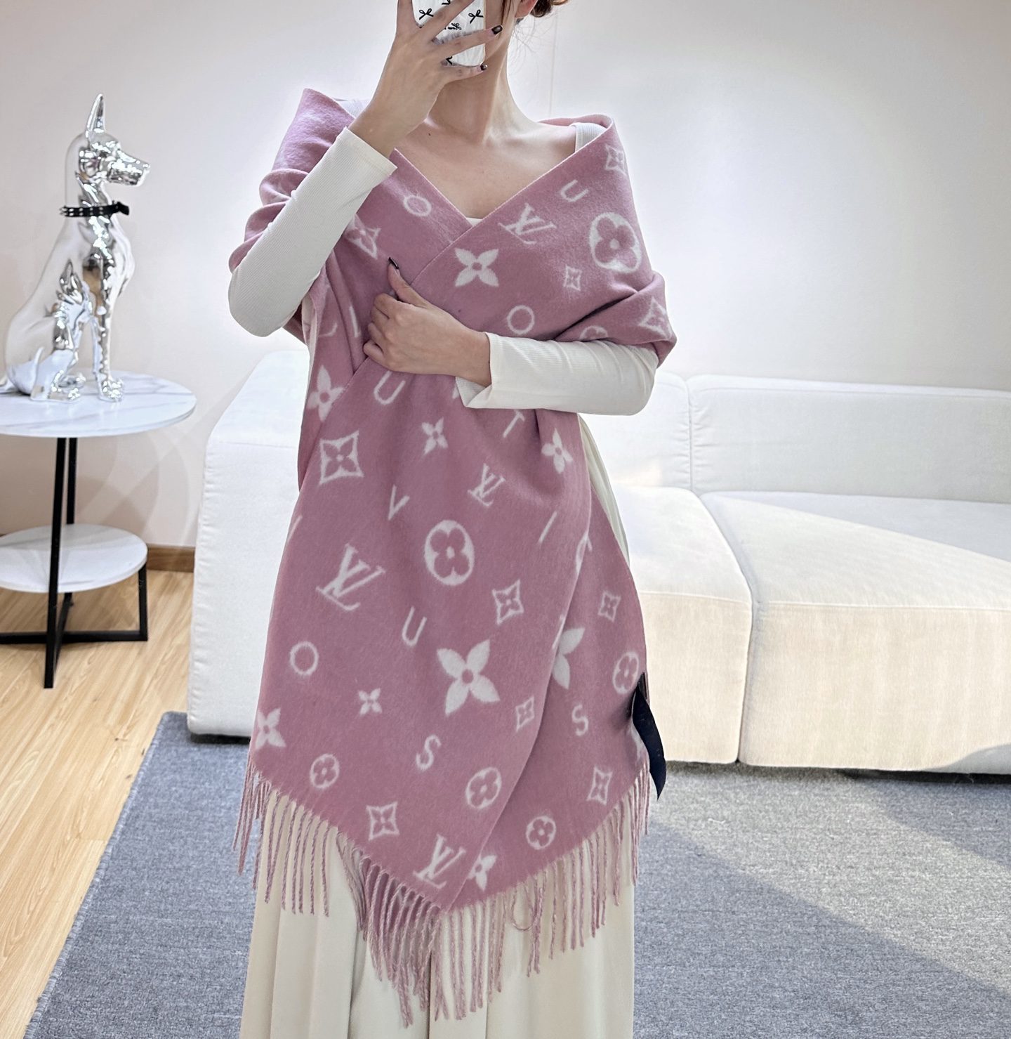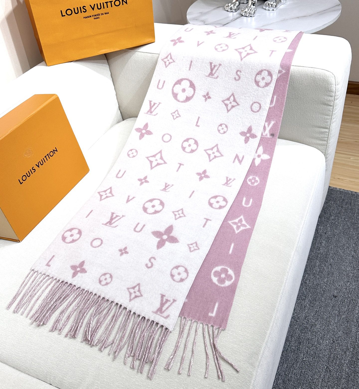 🧣Top version🧣 0 Reykjavik 2.0 scarf is made of soft cashmere and marked with Monogram flowers and LV letters, with a single letter of the brand name embellished between them, renewing the classic with a modern style. The elongated design fits around the neck and can also be used as a balaclava. 220 x 40 cm (excluding tassels), 0% cashmere Monogram pattern tassel trim