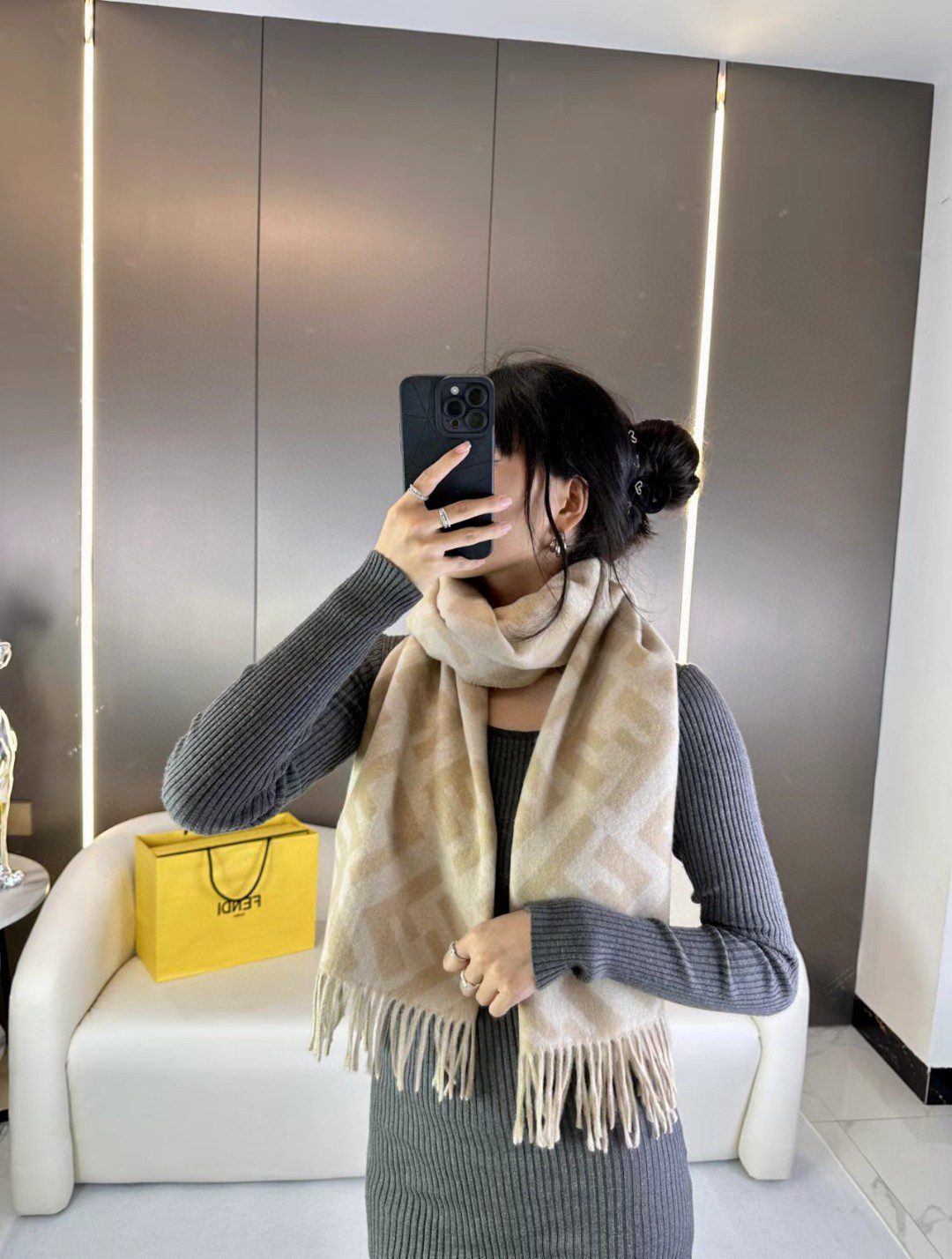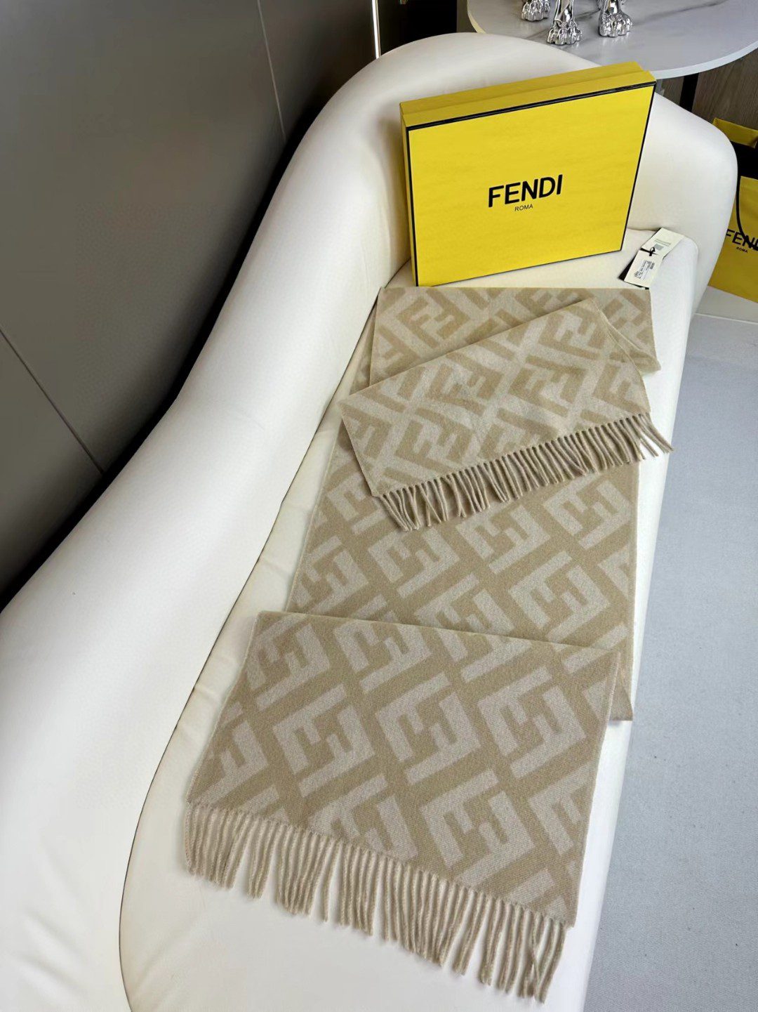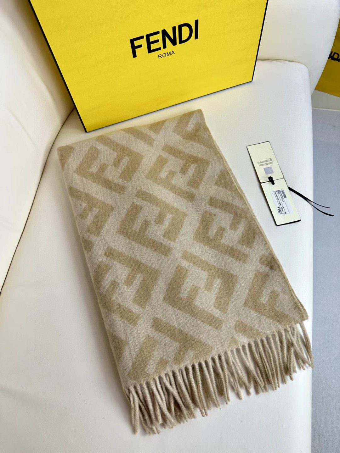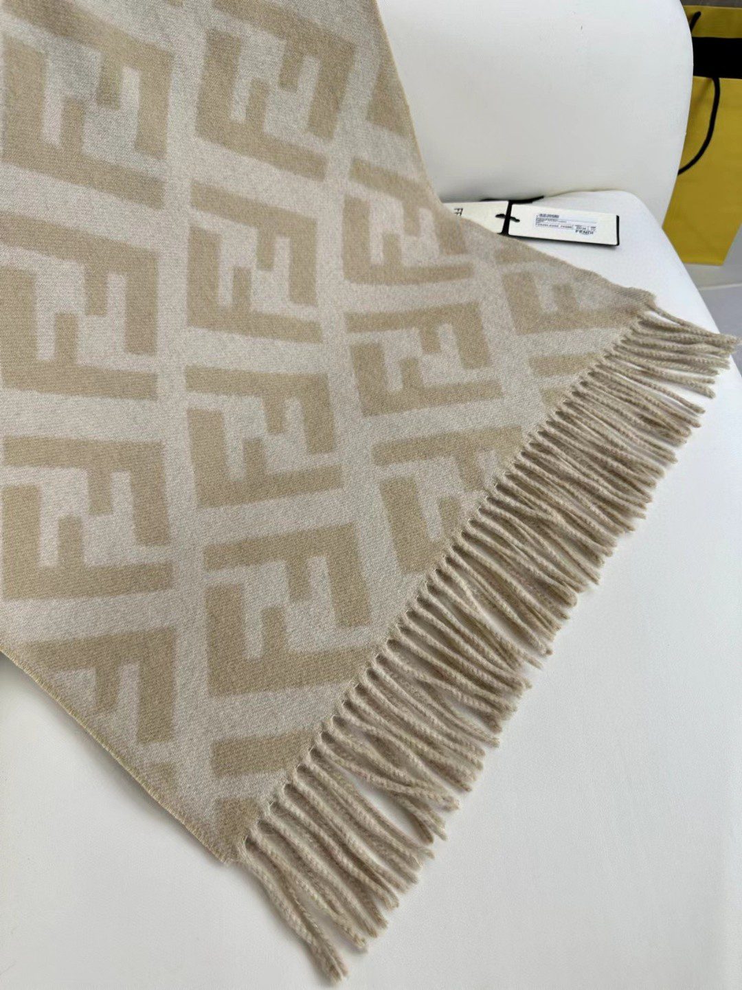 🧣Top version🧣 .00 Fabric: Cashmere Size: 45 Color: Brown, red, gray, milk tea The long tassel scarf is the first choice for fashionistas. Made of brown cashmere and wool. The jacquard texture reproduces the tonal FF pattern.