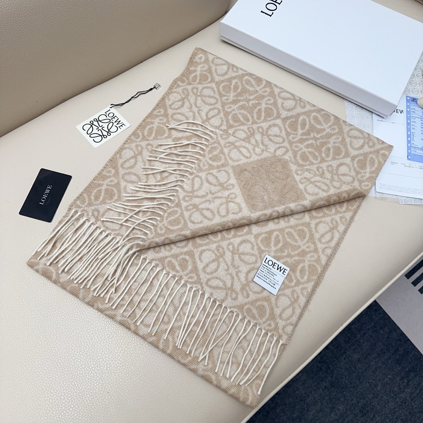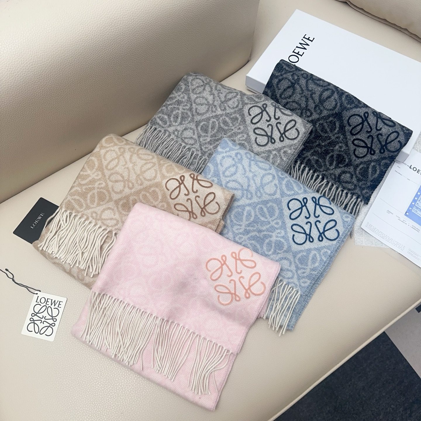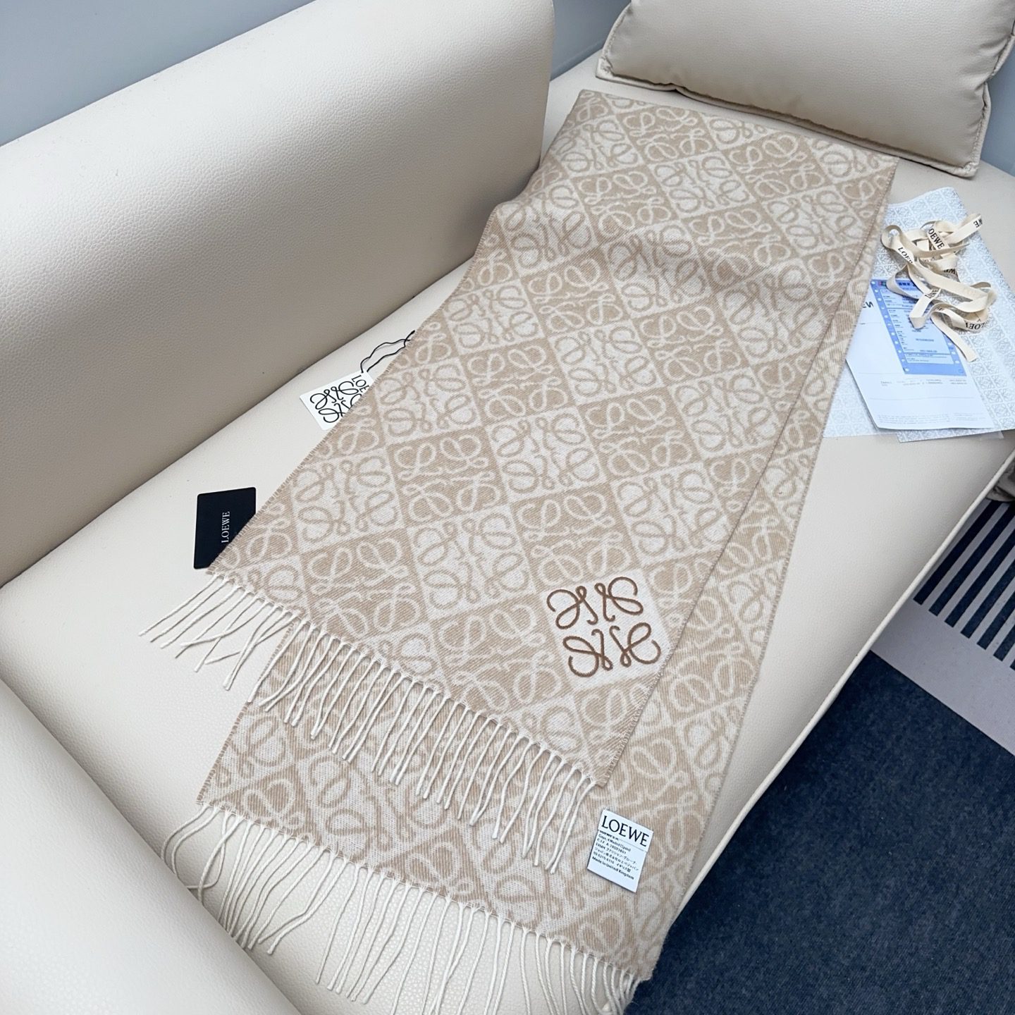 🧣Top version🧣 LOEWE2025 latest and hottest scarf, double-sided wool and cashmere scarf, embellished with two-color plaid Anagram jacquard pattern. This milk tea color scarf is known to be out of stock, and the effect on the body is really incredible! The matching flocking label has arrived.