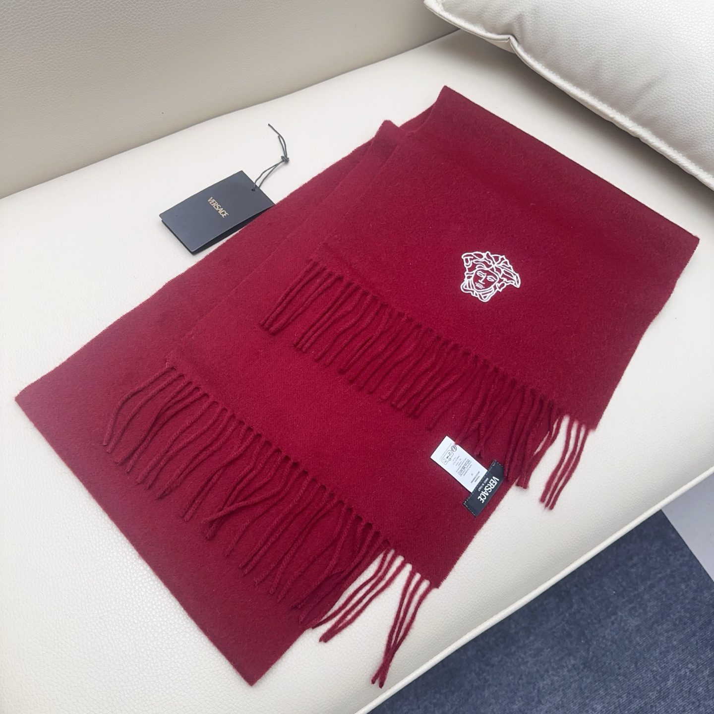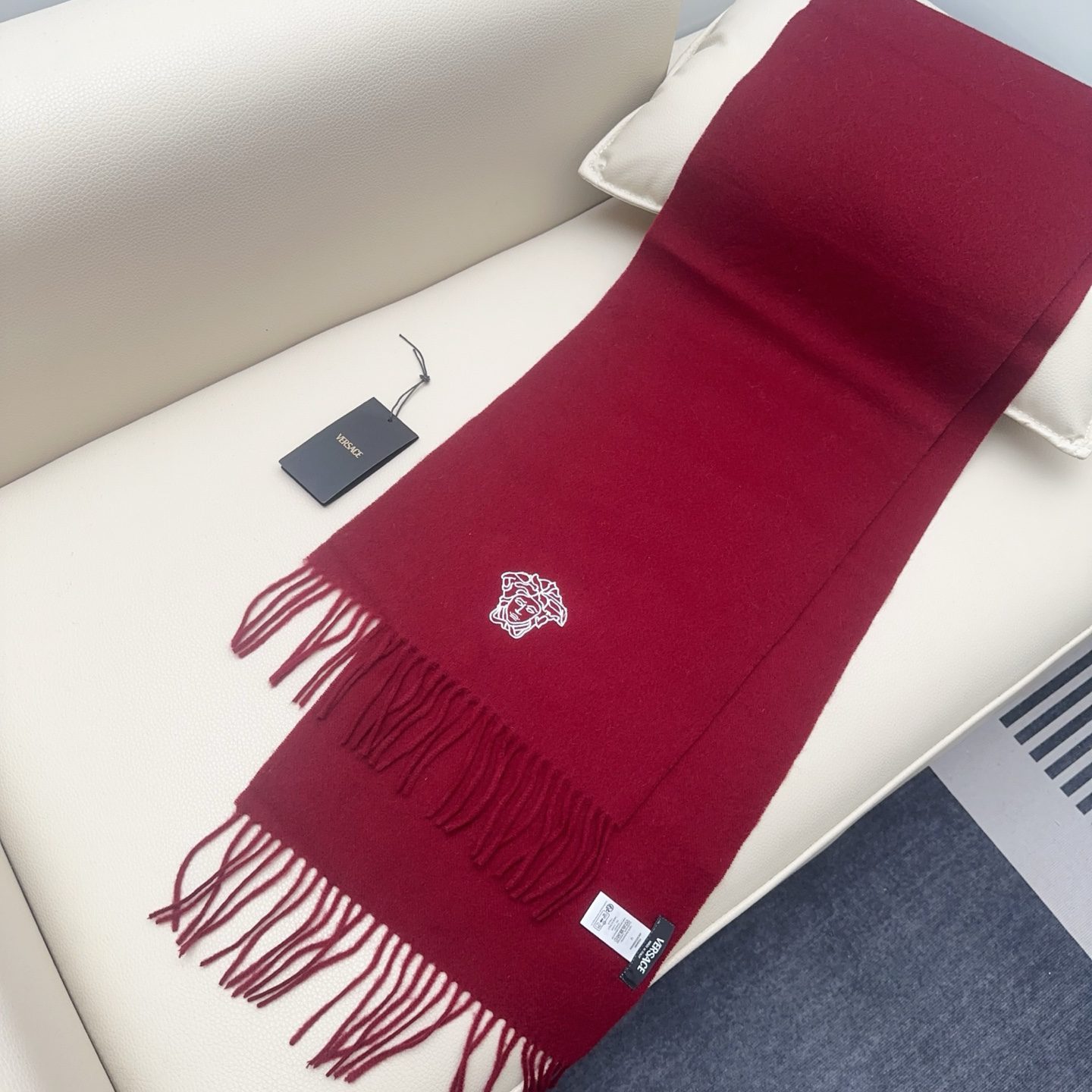 🧣Top version🧣Versace classic Medusa scarf, made of wool blended material, soft and warm, a must-have for autumn and winter! The central Medusa embroidery is super recognizable and full of luxury. The tassel design on both ends is fashionable and versatile, and can be easily worn in both casual and formal occasions.