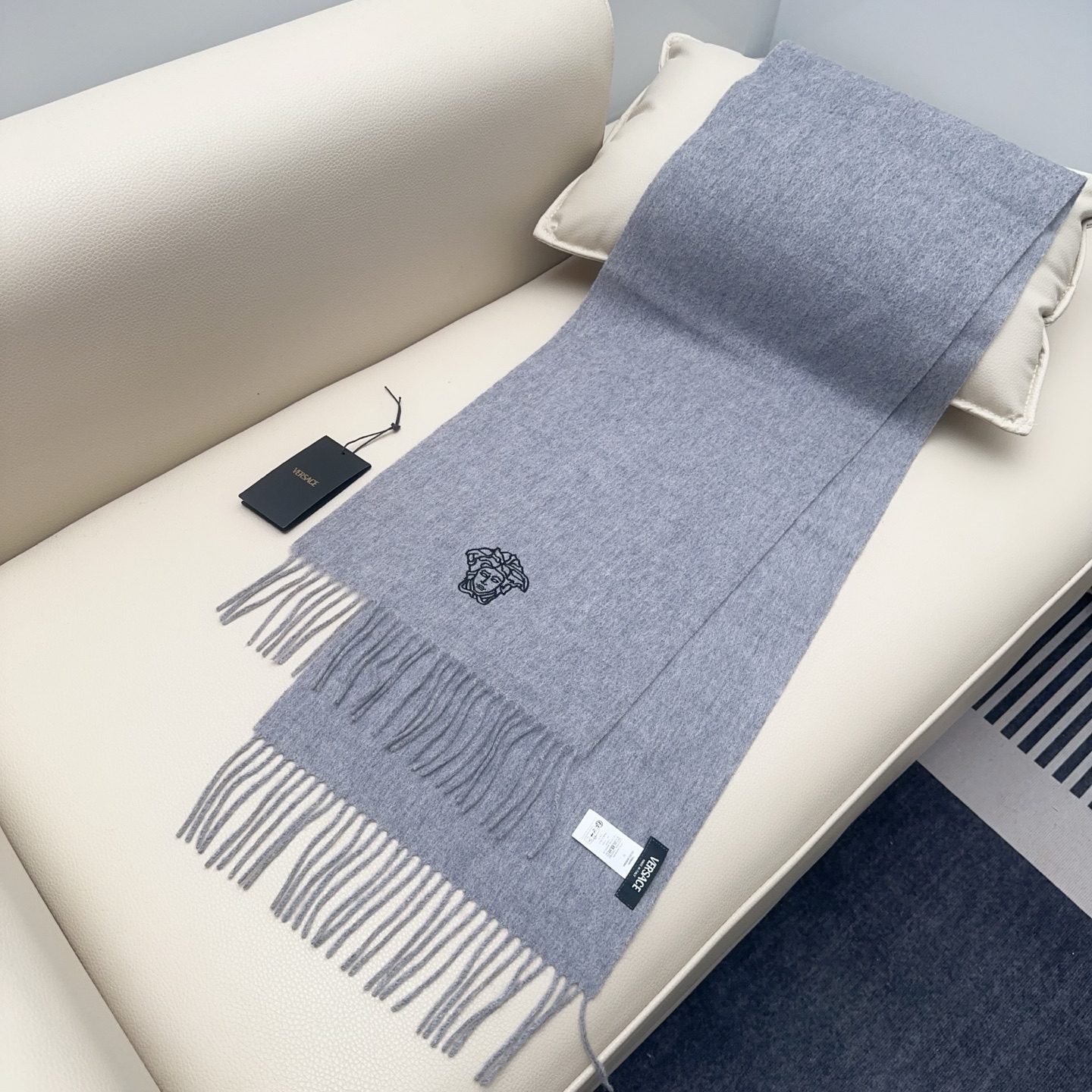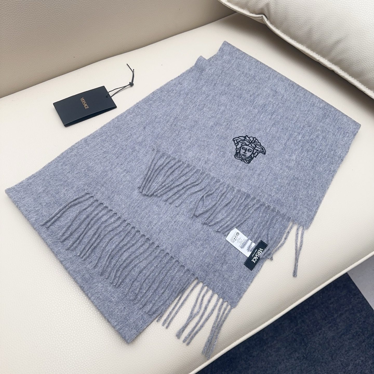 🧣Top version🧣Versace classic Medusa scarf, made of wool blended material, soft and warm, a must-have for autumn and winter! The central Medusa embroidery is super recognizable and full of luxury. The tassel design on both ends is fashionable and versatile, and can be easily worn in both casual and formal occasions.