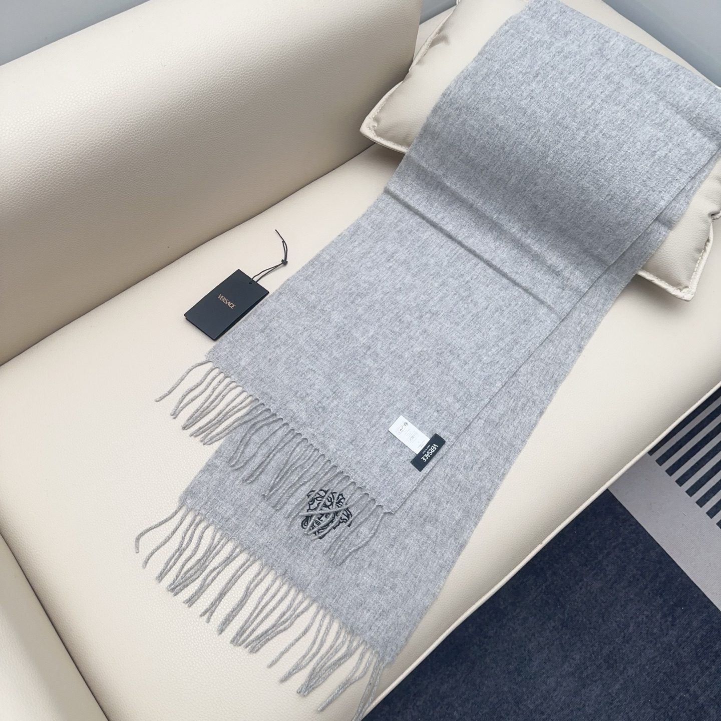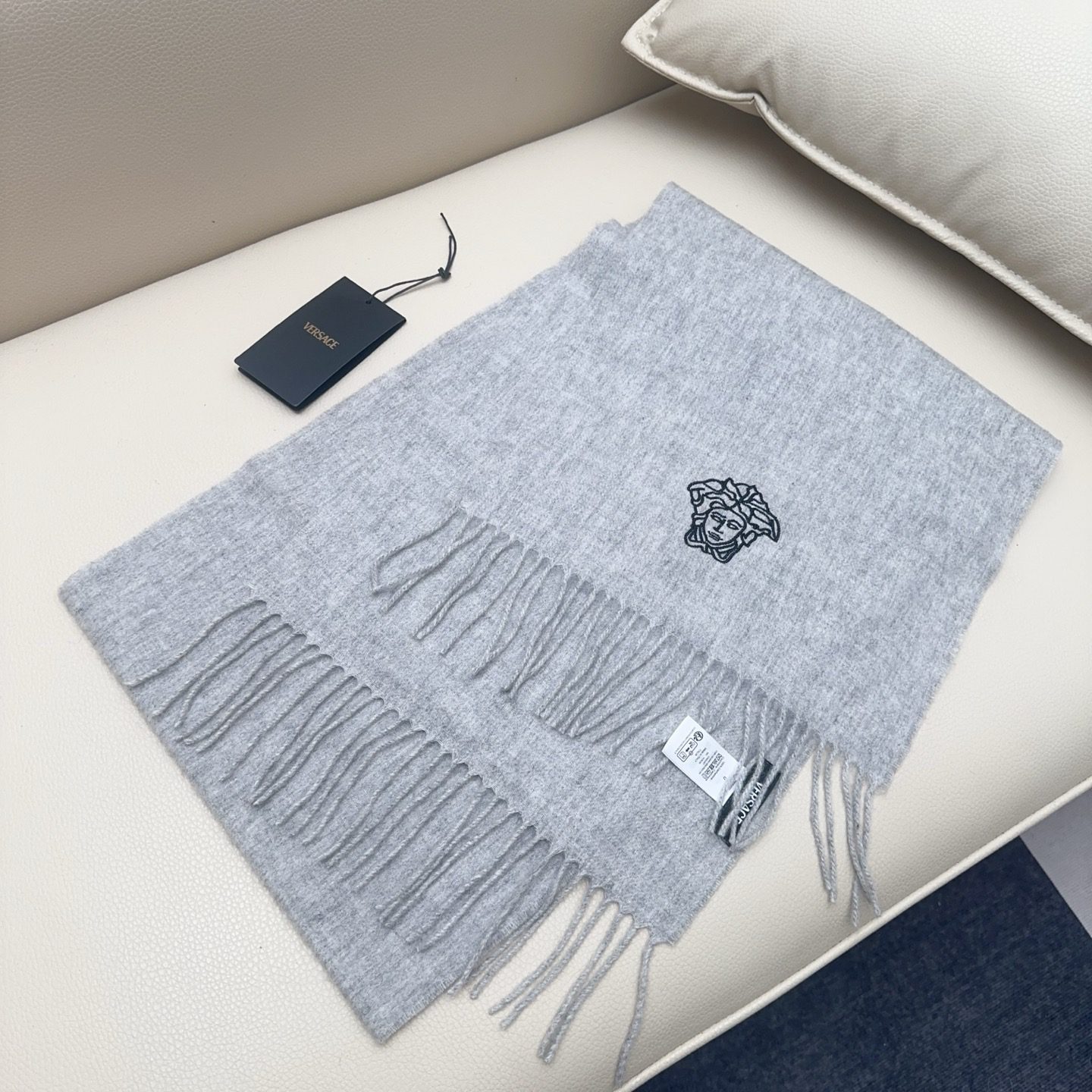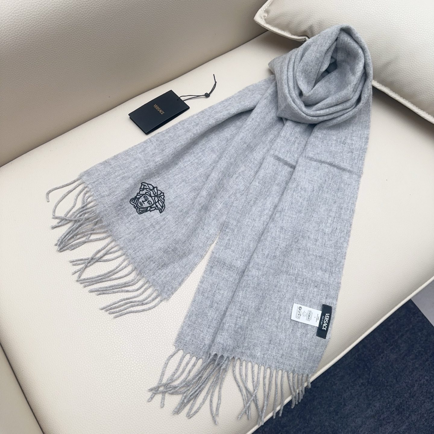 🧣Top version🧣Versace classic Medusa scarf, made of wool blended material, soft and warm, a must-have for autumn and winter! The central Medusa embroidery is super recognizable and full of luxury. The tassel design on both ends is fashionable and versatile, and can be easily worn in both casual and formal occasions.