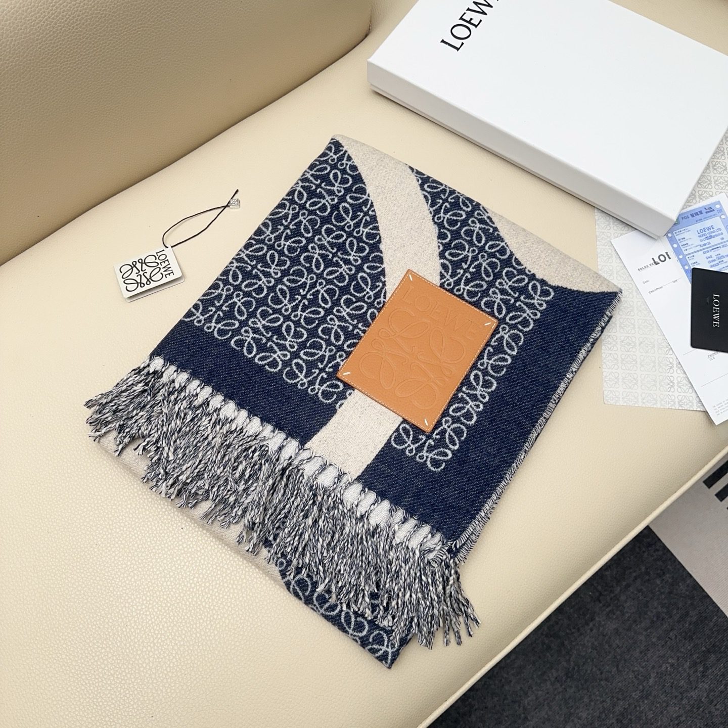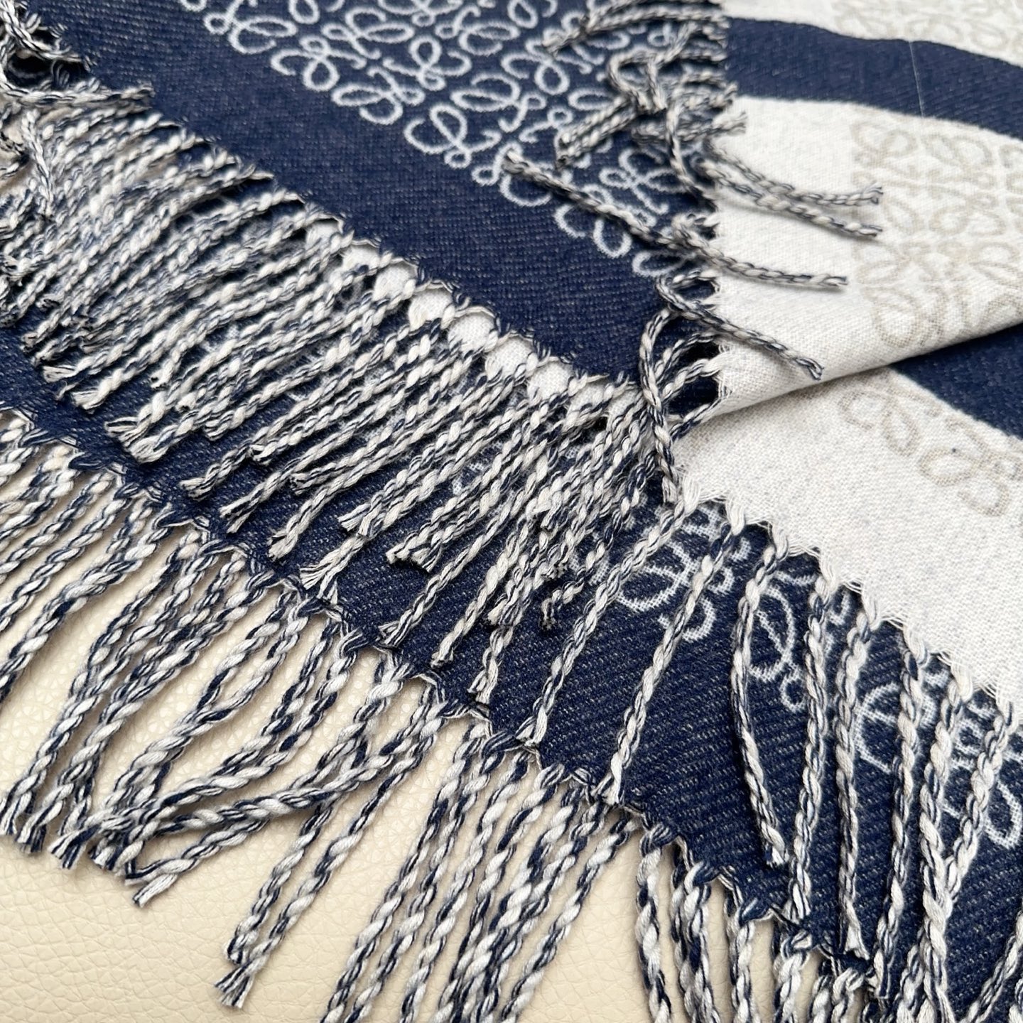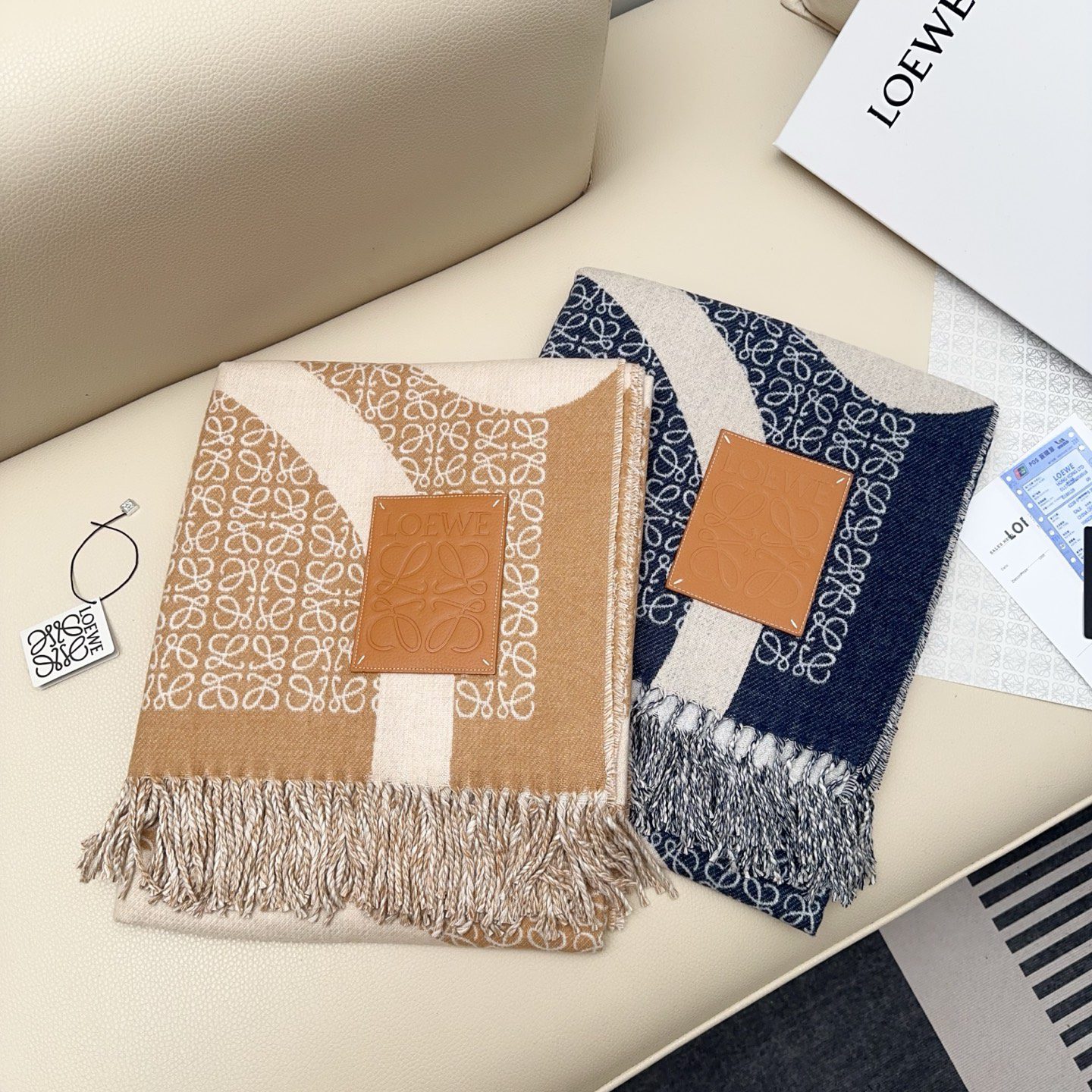 🧣Top version🧣The latest model in 24 years, Khaki Green milk tea camel two-tone wool jacquard blanket shawl, decorated with repeating Anagram pattern, contrasting LOEWE L pattern and fringed edges. Proper 24-year-old C-level scarf🧣Super rare Loewe scarf, big logo, and very big. It can be used as a blanket, shawl, or scarf. It is super comfortable, equipped with leather logo, gentle and noble, perfect for autumn and winter. Material: pure wool, specifications: ×cm tassel size 2xcm, cow leather LOEWE Anagram embossed patch.