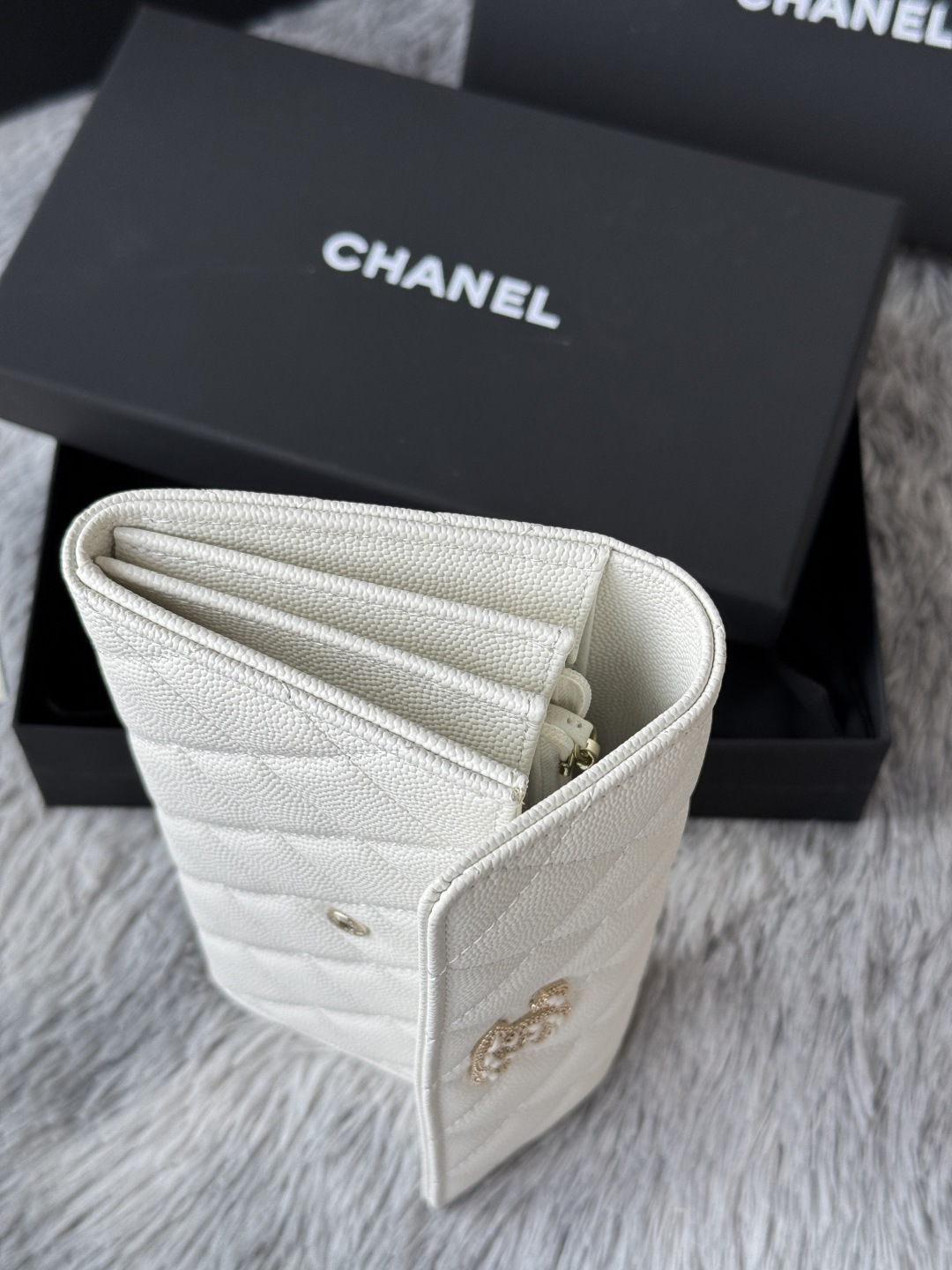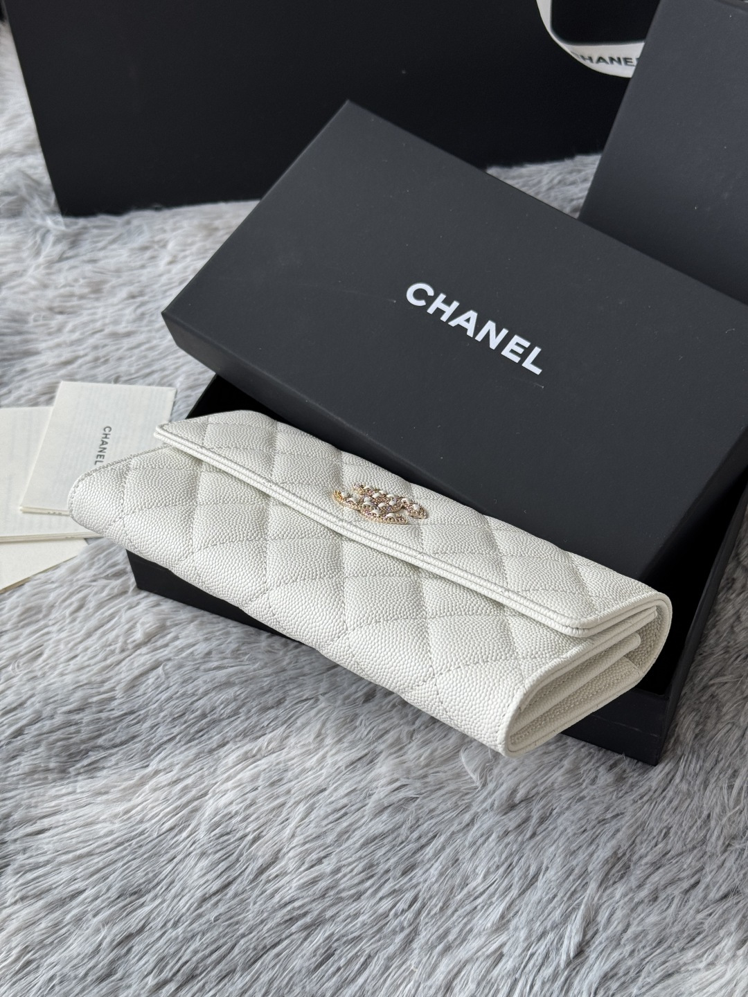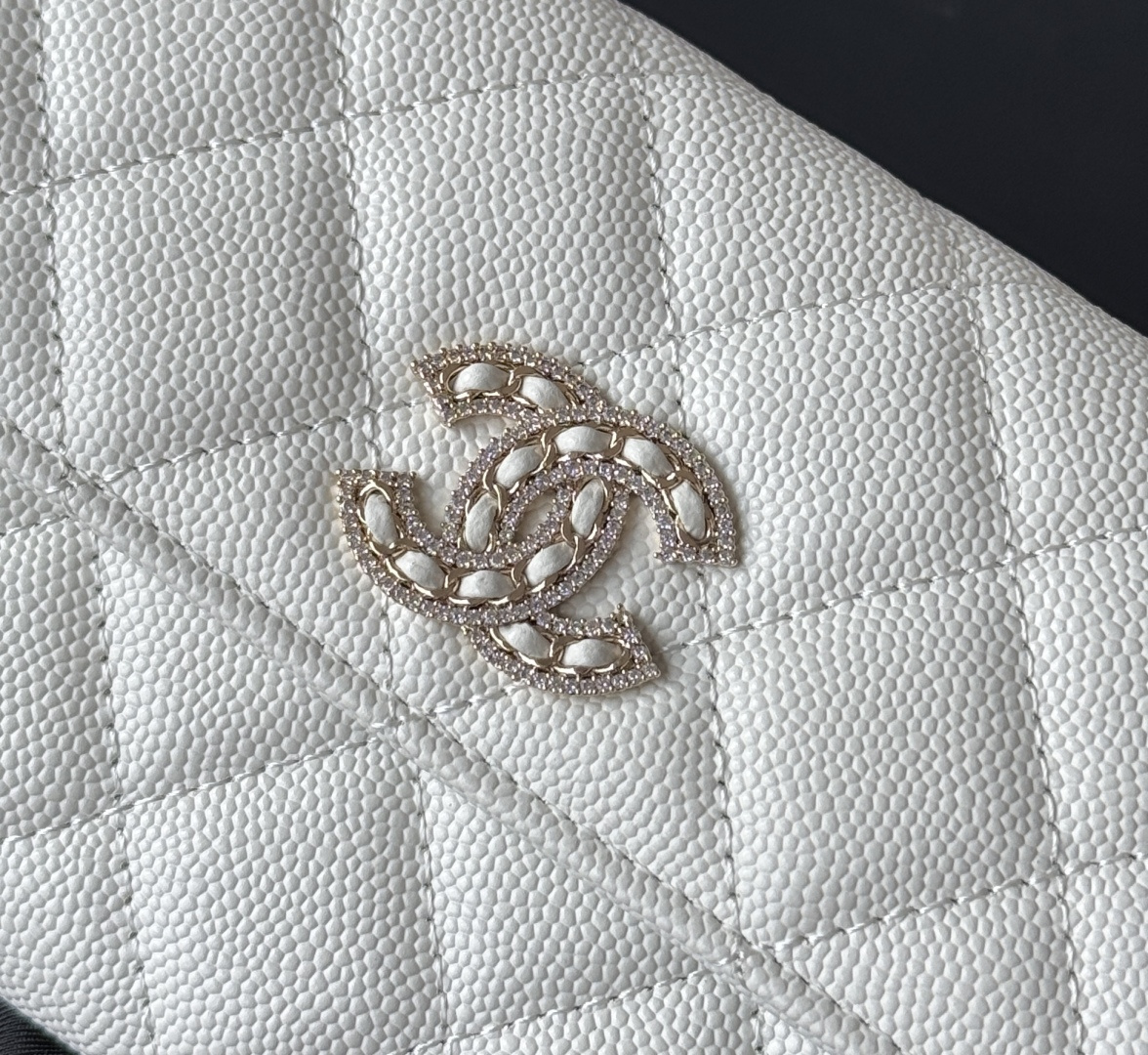 0 CHANEL. The two-fold wallet with long clip flap has arrived. The caviar first-layer cowhide is matched with the new luogo. It is also made of leather and is surrounded by diamonds. The design details are so beautiful. Model No. Ap2740B, size .5cm.
