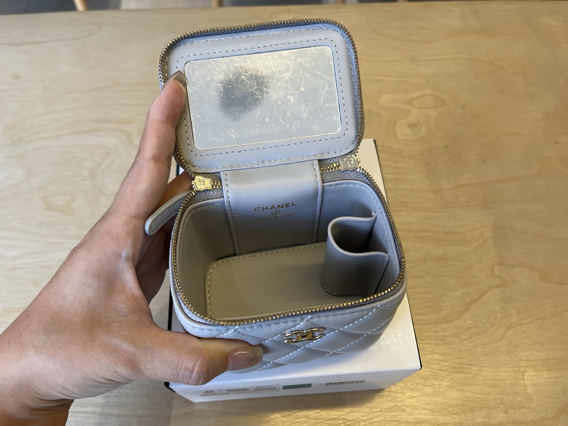 650 A68092 CHANEL2022 Large classic portable chain box with light gold buckle is nice. It is really practical and equipped with a small mirror. It is so considerate. The double C logo on the bottom makes me fall in love instantly when I see it. It is really cute and the upper body is also very cool! Size: 7cm