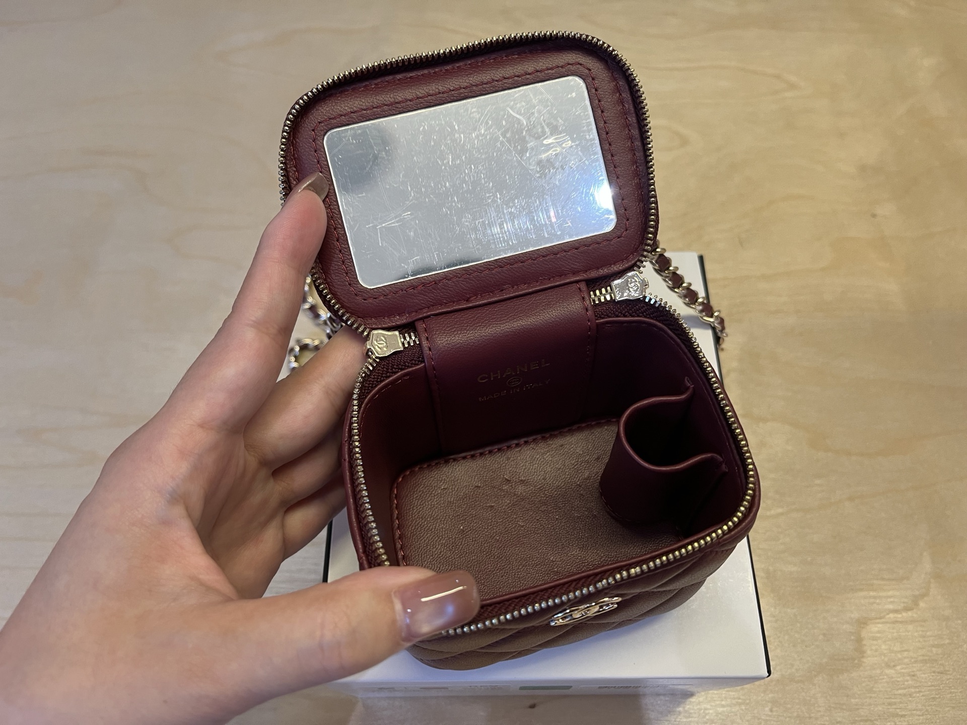 650 A68092 CHANEL2022 Large classic portable chain box with light gold buckle is nice. It is really practical and equipped with a small mirror. It is so considerate. The double C logo on the bottom makes me fall in love instantly when I see it. It is really cute and the upper body is also very cool! Size: 7cm