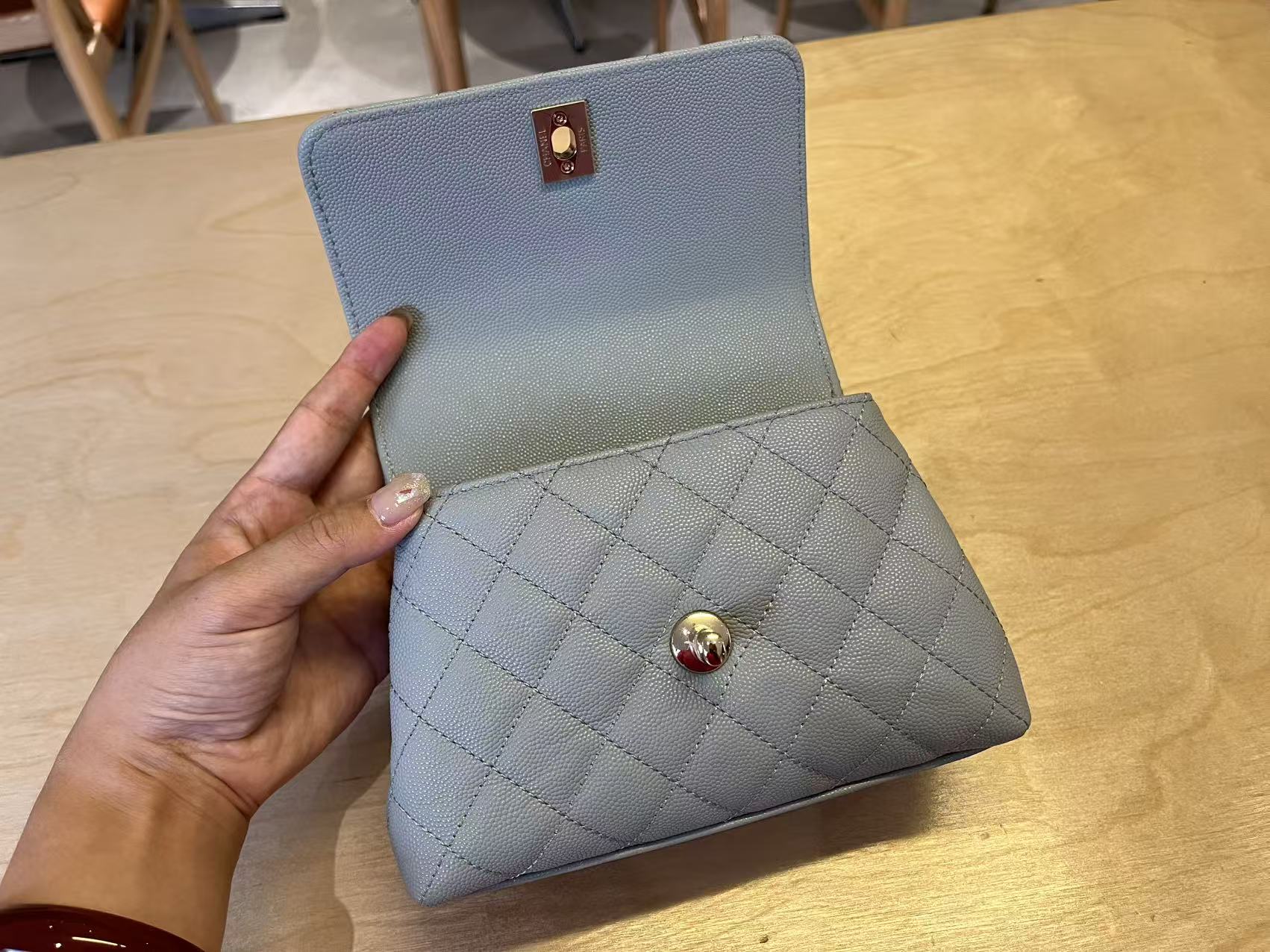680 AS222k light gold rim lining. This season’s cocohandle is full leather inside. Chip hardware. Imported small ball pattern cowhide hand-held flap bag. New version of the classic king fried 𝑠 𝑧𝑒: cm