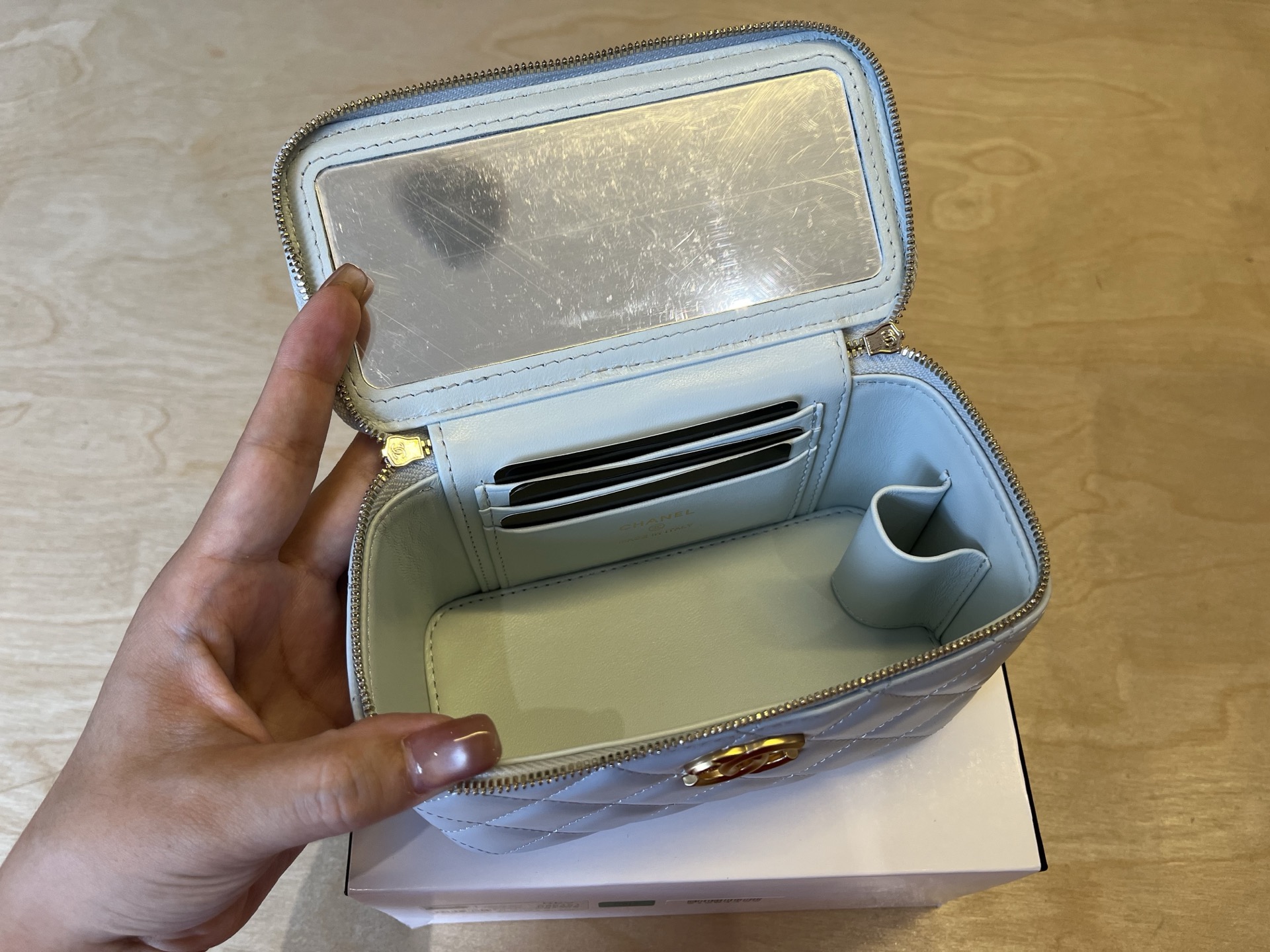700 A965 spring and summer new version, imported waxed cowhide, double gold ball makeup box, long box storage bag, size: cm