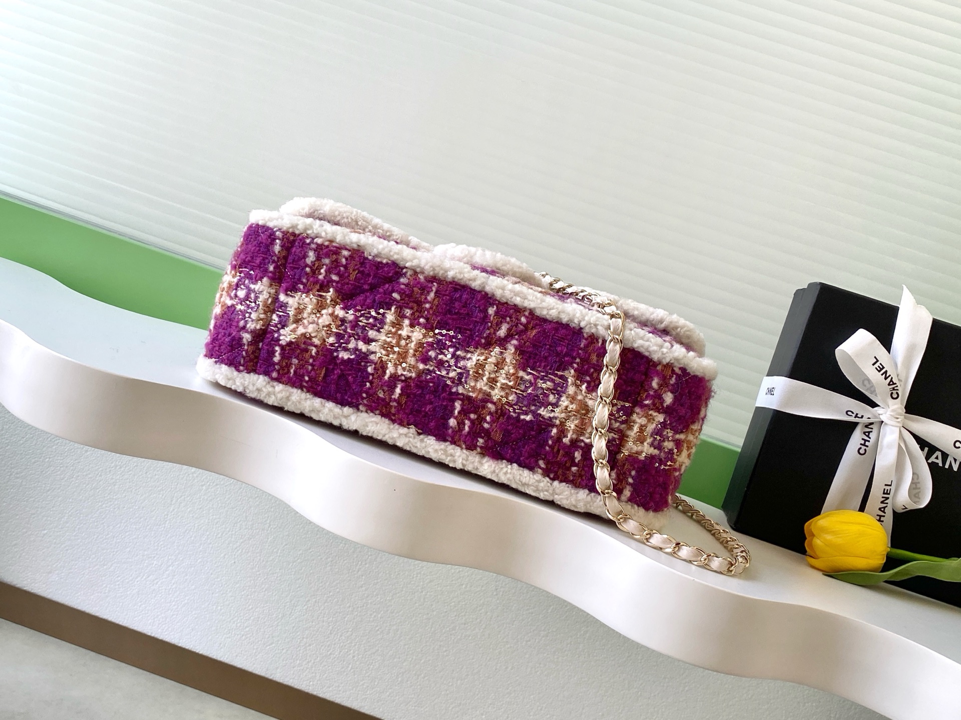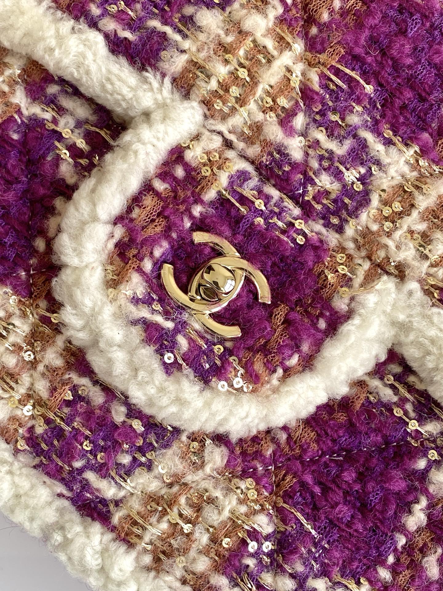 The 750 25N tweed CF bag is a limited edition of the 2025_26 COCO NEIGE ski series. It is made of purple-red tweed material + white fur piping and a classic double-C metal buckle. It is elegant, retro and highly recognizable. The chain shoulder strap can be carried by hand or cross-body, practical and fashionable! Tweed is soft and layered, and it looks great when worn with a sweater and coat in winter. The ski series is only released once a year and has perfect collection value. A must-have for fashion lovers! Style No. AS5687 Size 2
