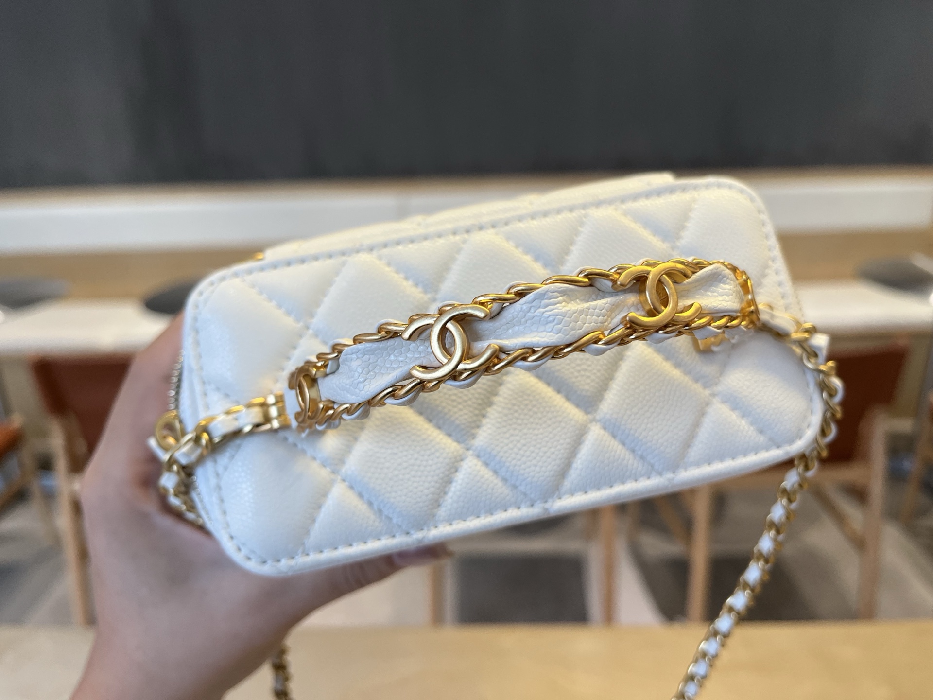 750 A965B double C logo handle cosmetic case. Exquisite handle design is more fashionable. Grained cowhide with metal retro hardware. The texture is wear-resistant and durable. Classic design style. Versatile and practical. Really exquisite. Good appearance. Compact. I love this cosmetic bag more and more. It looks beautiful when I carry it with me. It can make you look stunning when paired with any clothes. This season’s new products are very surprising. Size: cm