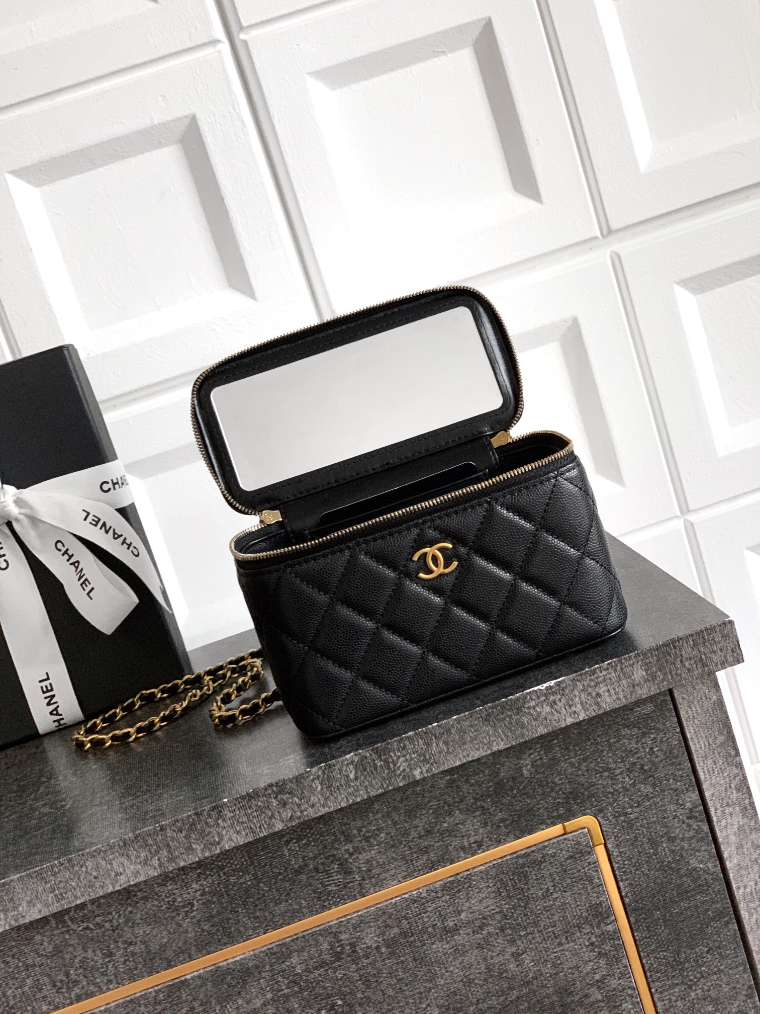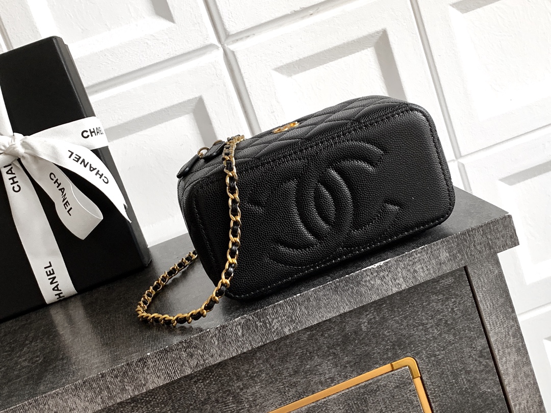780 OHANEL25b black gold leather chain handle long box bag! Classic cosmetic box series ️ adjustable chain 8 designs, multiple carrying methods and multiple styles coexist! The three-dimensional shape of the bag is super cool, with retro hardware and a cool feel! The interior is light gray, comes with a makeup mirror, and has a large capacity! It is suitable for mobile phones and small cosmetic items! Advanced handicraft workshop VANITY series “double C adjustment buckle” makeup box, 9.5xx8cm