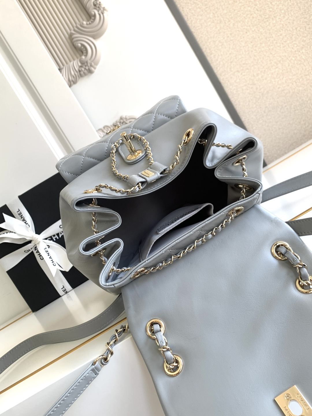 800 CHEANL AS0 purchased 22C brand new dumaylp large backpack [smile] Although it is said to be large, it is not big at all [color] [color] Super practical! Large capacity [strong] [strong] Exclusive original sheepskin! Exclusive original genuine sheepskin [Celebrate][Celebrate] Genuine 24K all-steel champagne color hardware Size: 22x25xcm