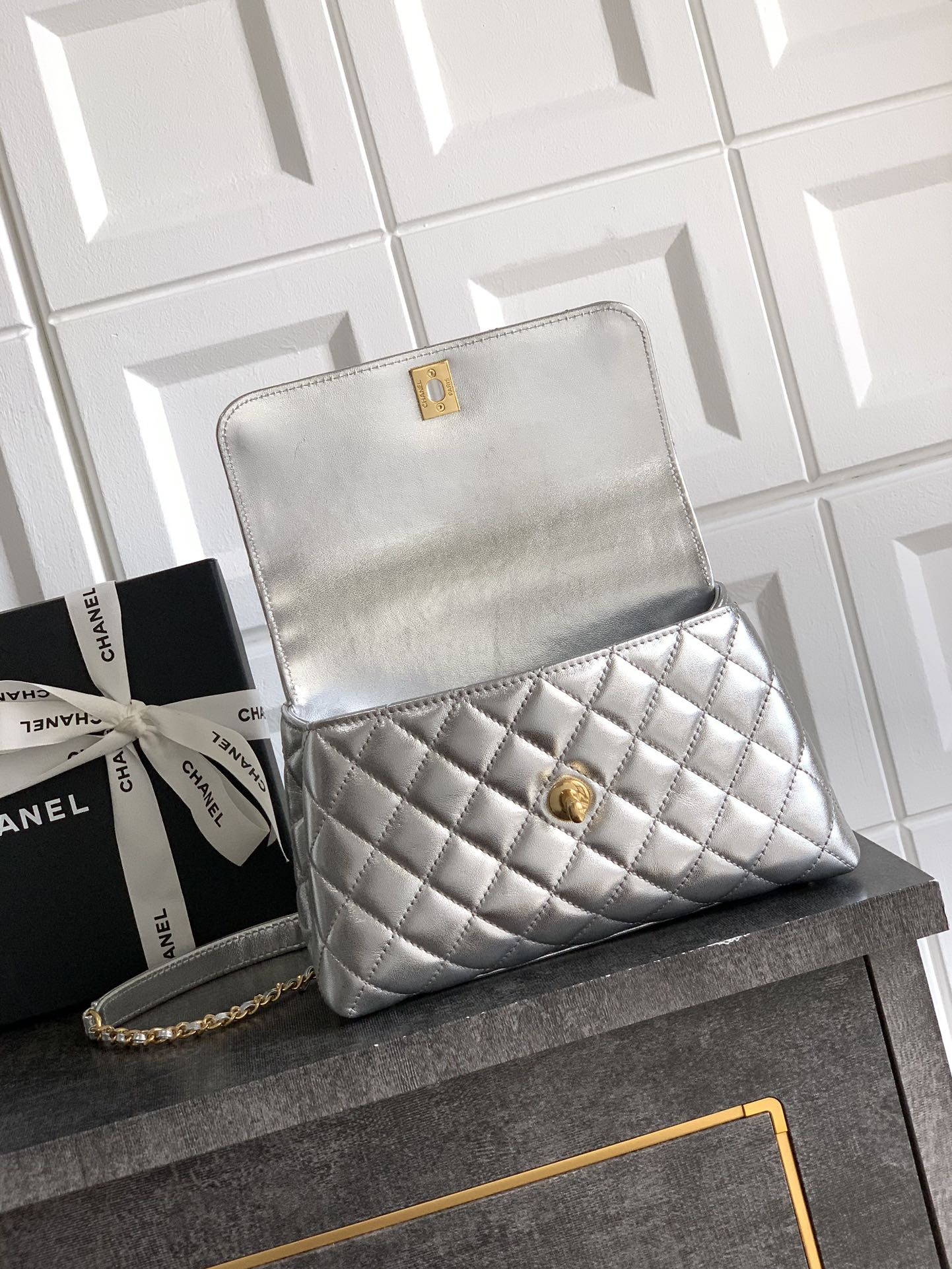 Home BAG Women's Bags Chanel Bag Chanel Platinum Silver “A Gold Diamond Engraving