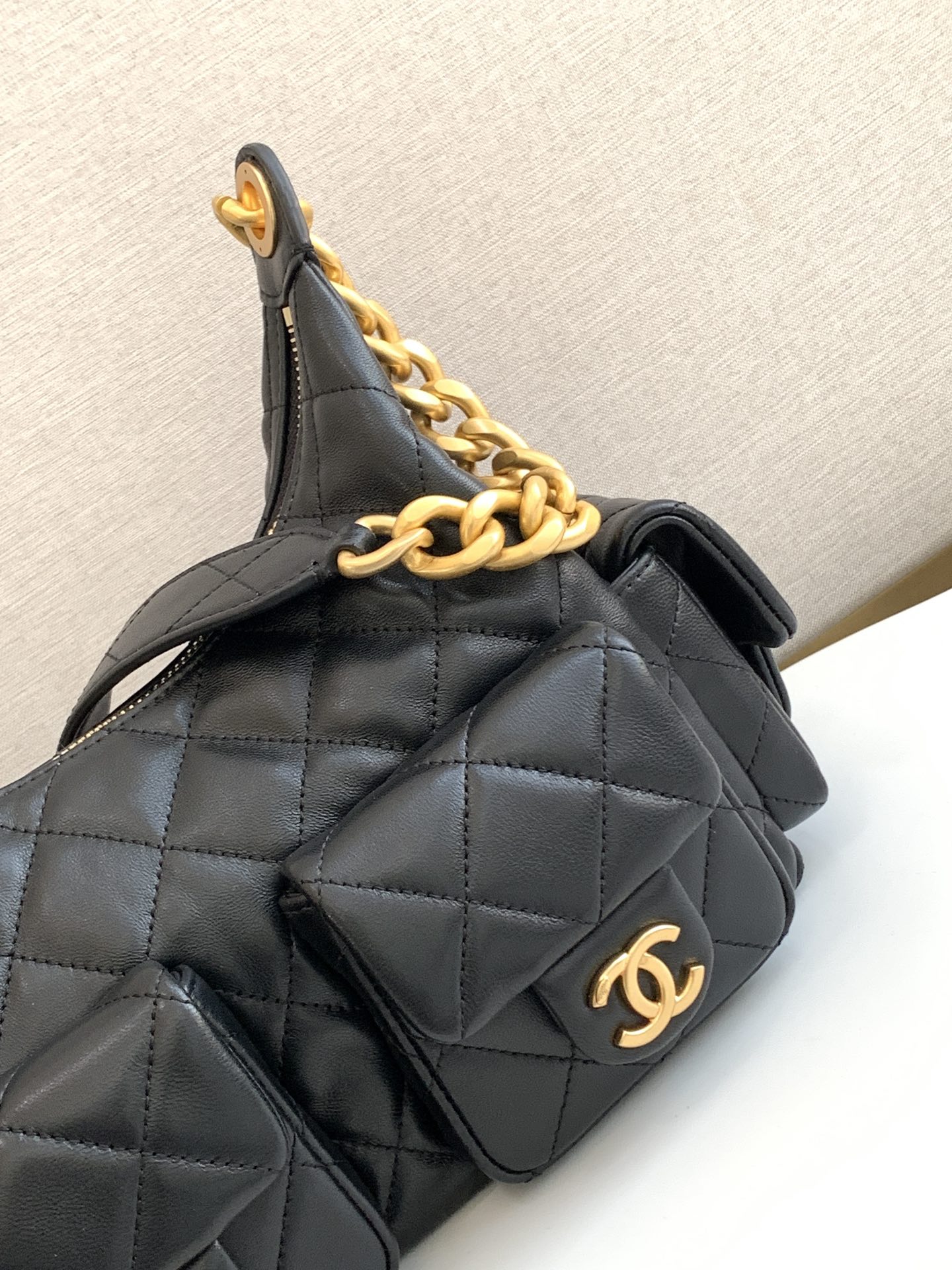 Bag Chanel 9 C’s popular black polished sheepskin bag. This bag is really unexpectedly light and beautiful in person.