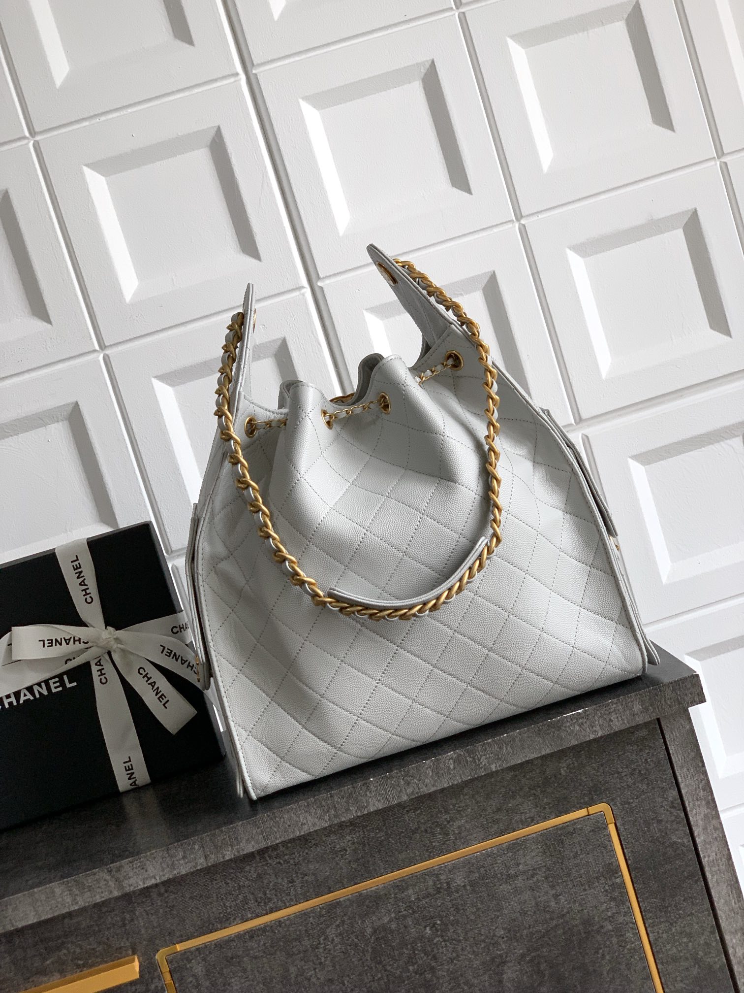 950 “Light Gray” large size! OHANEL Caviar 25s Hobo Bag Drawstring Bucket Bag Caviar Small √ This season’s hottest item, the eye-catching Hobo looks incredible! After the show was launched, it was extremely popular and named after 25bag, just like 22bag has been popular for many years! This 25bag is expected to be a hit in Yisi! The multi-pocket design simply adds a sense of casual laziness. The grainy texture of caviar is not so heavy but very delicate. √ The adjustable drawstring design with opening is very practical ~ it can directly transform into a bucket bag. The size is moderate and cool. It is a must-have item for girls. I love it!!
