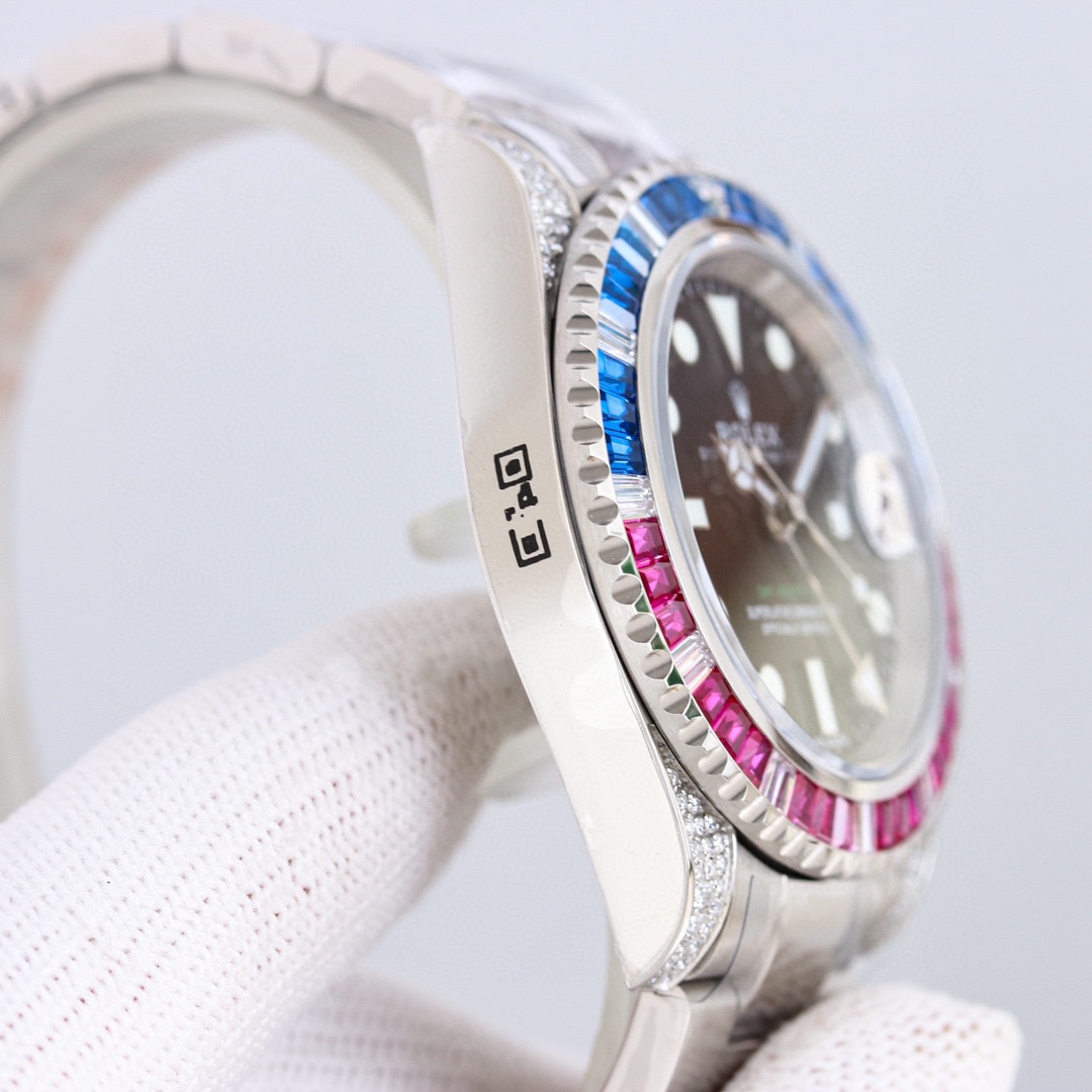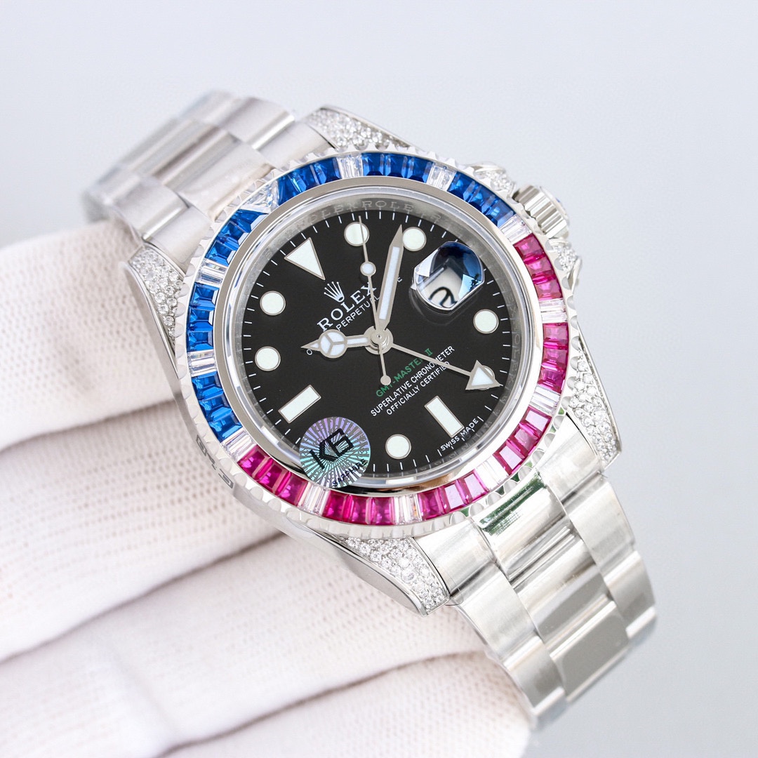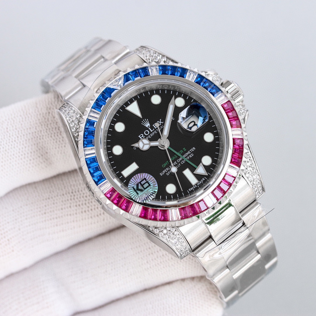 Customized version of GMT-Master II with diamonds on the back! It is the best choice for luxury, sparkle and classic trend! [Case] ​​Watch size 40mm. Every diamond and colored gem comes from Austria (the origin of Swarovski) and undergoes strict screening to ensure uniform color, size and fire, and is carefully set by a jewelry setter. The same movement as the case] adopts the replica movement 2836 modified (GMT) self-winding movement. The king of cost-effectiveness is here, please appreciate it from all watch friends.