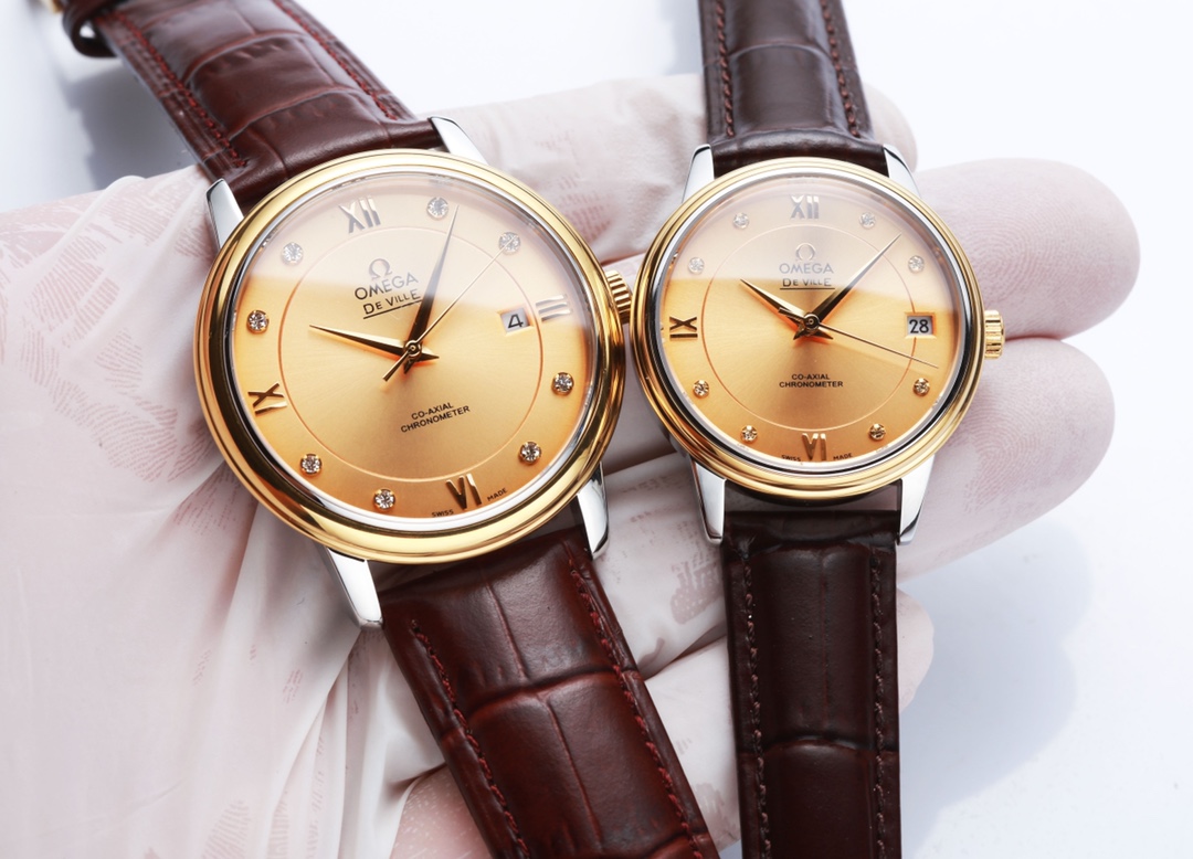 De Ville Series-Couple Watches! Genuine mold opening from the Taiwan factory, the lettering is the same as the original product, the curved hour dice is used, the hand-inlaid Swarovski rhinestone glass is upgraded to high-definition arched double-bright sapphire glass (clearer display, anti-scratch), and the back of the steel belt is also synchronized with the original laser product batch number! It took 9 months to make many corrections and upgrades to create .7mm! The style uses the original Citizen 82® movement. The zero-repair® quality style is paired with Italian cowhide to make the wrist more comfortable. The strap is engraved with the classic “OMEGA” logo on the buckle, which is generous and classy.