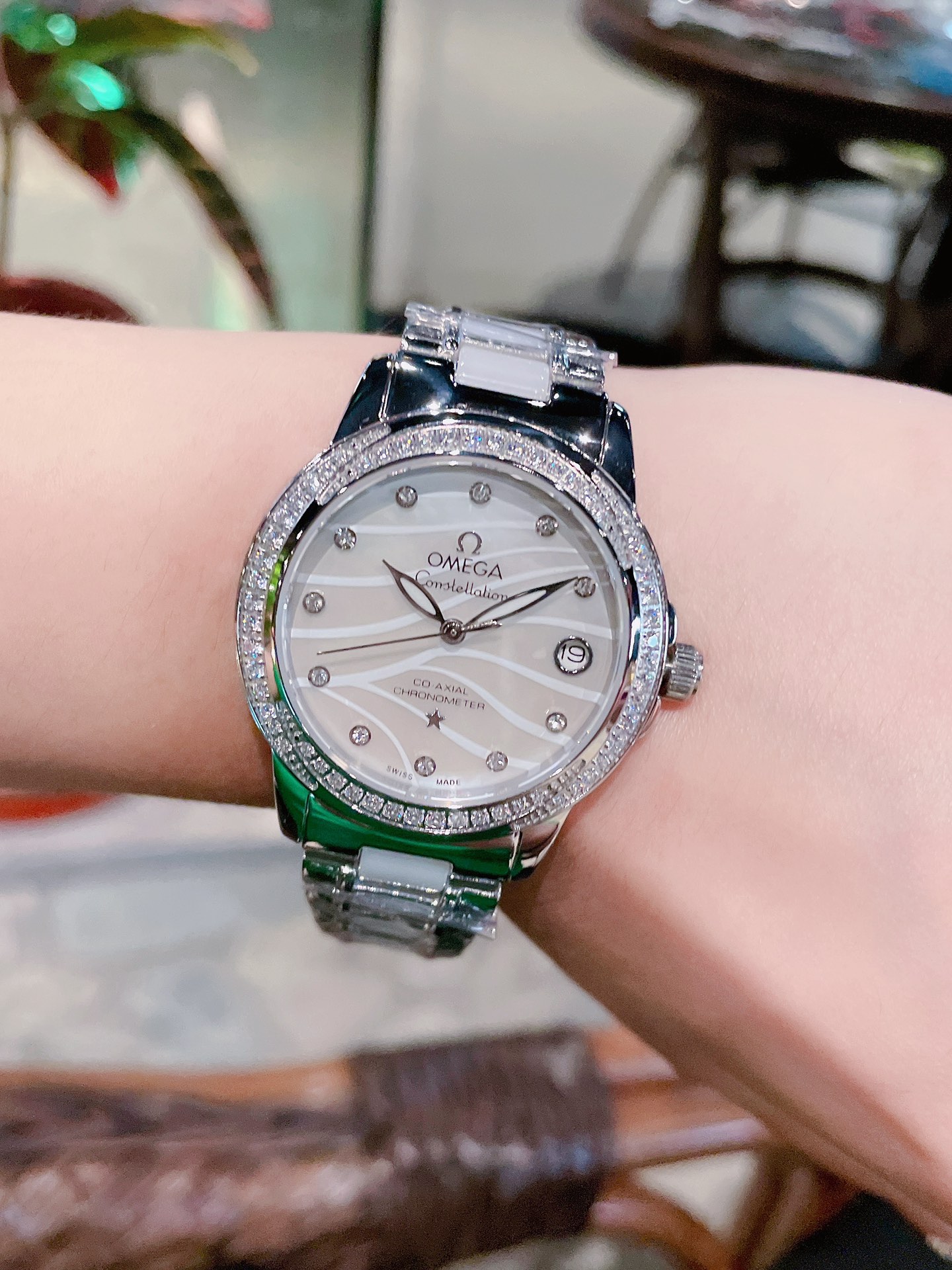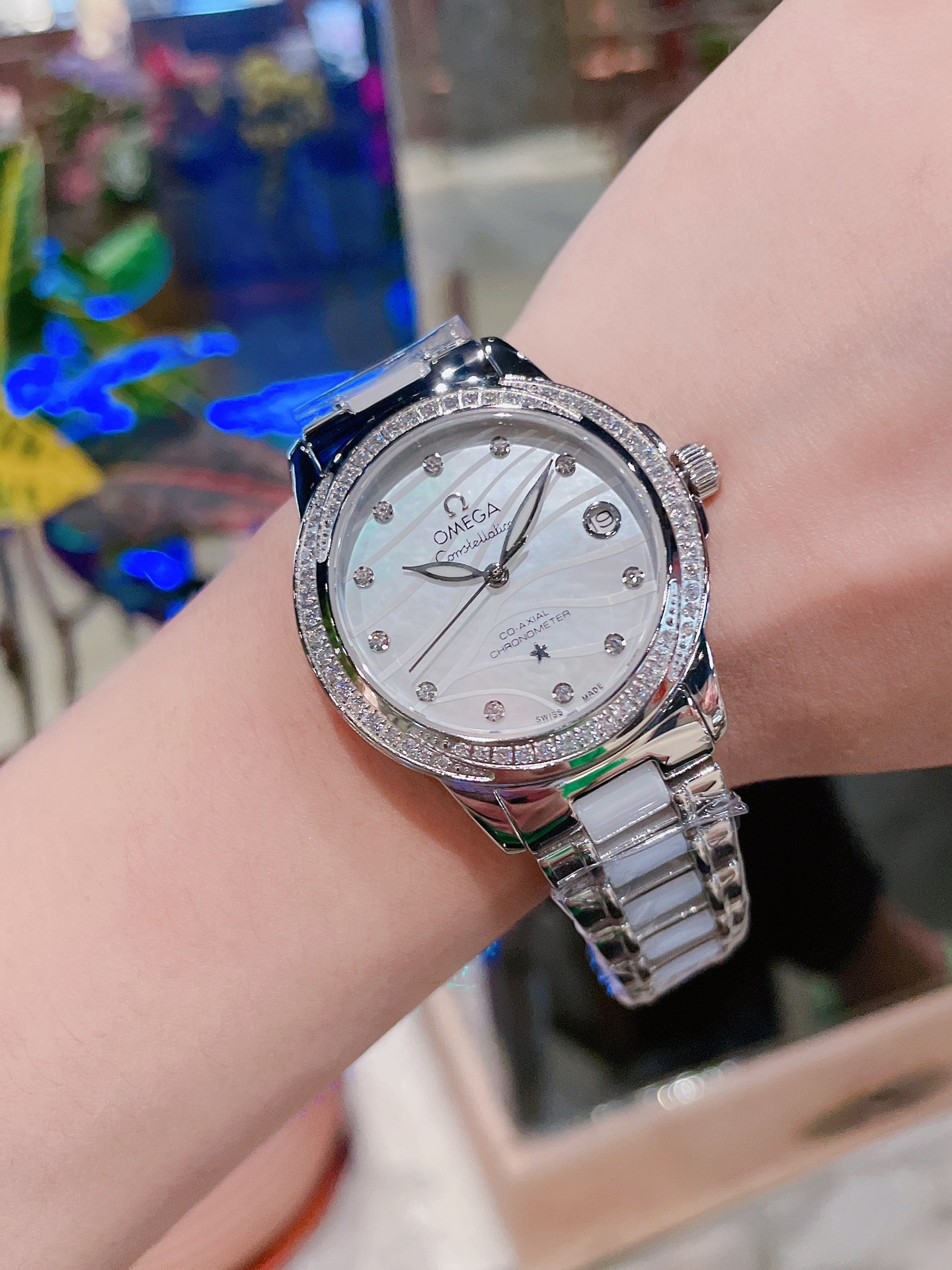 Omega Constellation Series 28mm Swiss Quartz Watch. The Roman scale on the ring and the observatory on the bottom cover