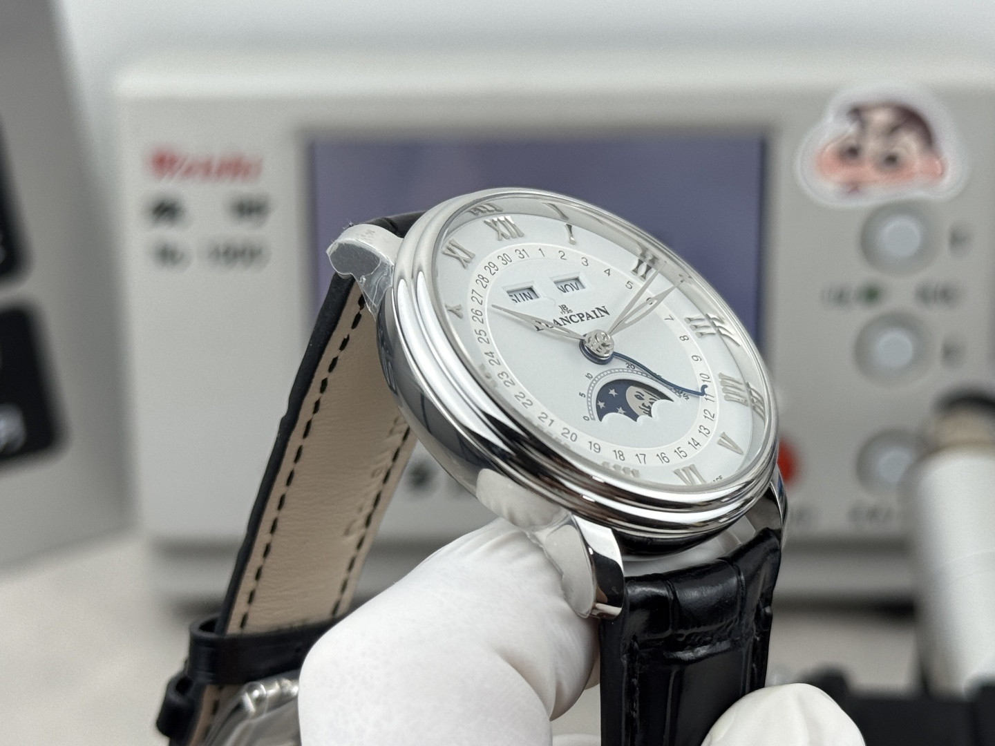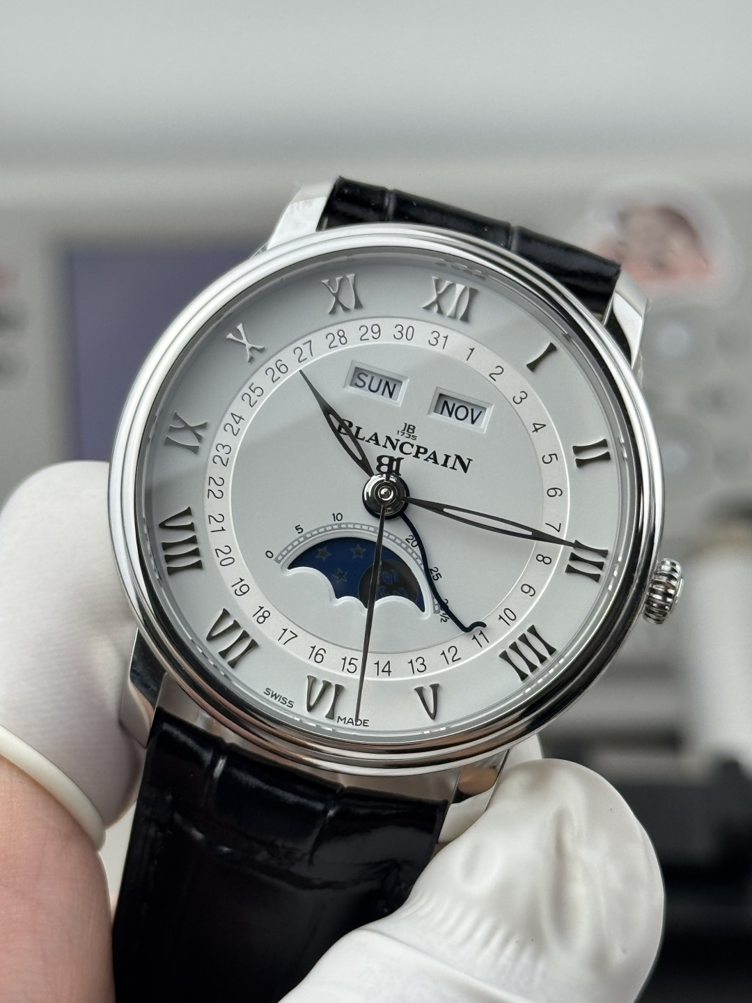 GR – Blancpain Classic Series 6654 Full Calendar Moon Phase Watch mm2️⃣Simple and elegant dial, concentric circle layout is clear and easy to read, outer Roman font three-dimensional time scale, inner circle calendar indication; 3️⃣Hollow willow leaf hand, logo large second hand, blue steel calendar The three needles perform their own duties, and the hour and four-way hidden adjustment buttons are cleverly integrated into the lugs, taking into account convenient operation and aesthetic balance. Blancpain’s moon phase face was once talked about by watch friends, and the playful little face has the same effect as the emoji expression.