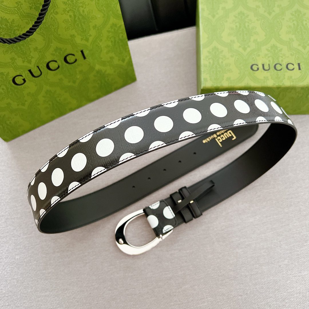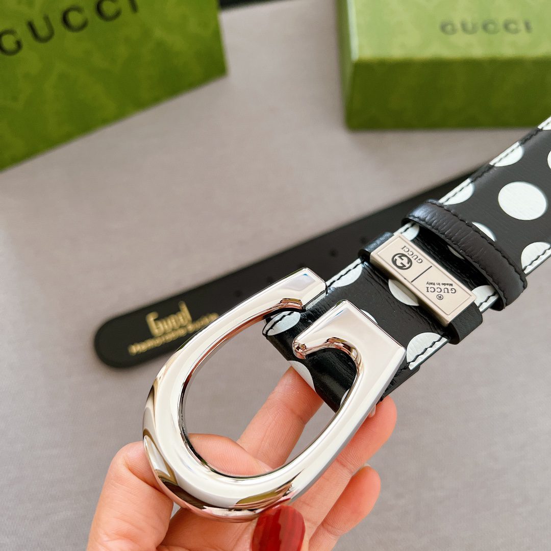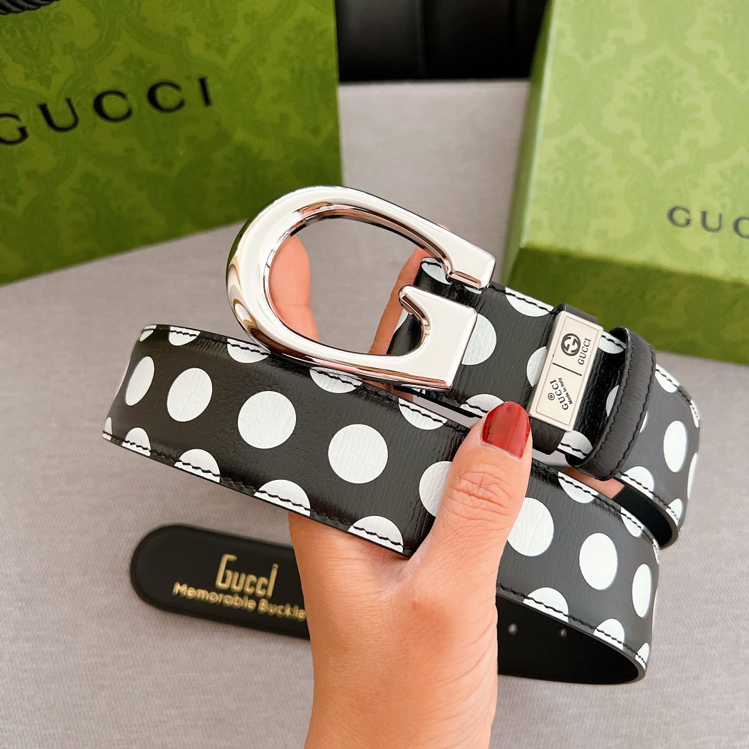 Gucci, 4.0cm wide, imported calfskin, new style echoes the interest and playful style of the “March of Love by Gucci” series of shows. This black and white leather belt features an all-over polka-dot print. The shiny gold-toned G buckle is a subtle tribute to the brand, adding charm to the entire designD