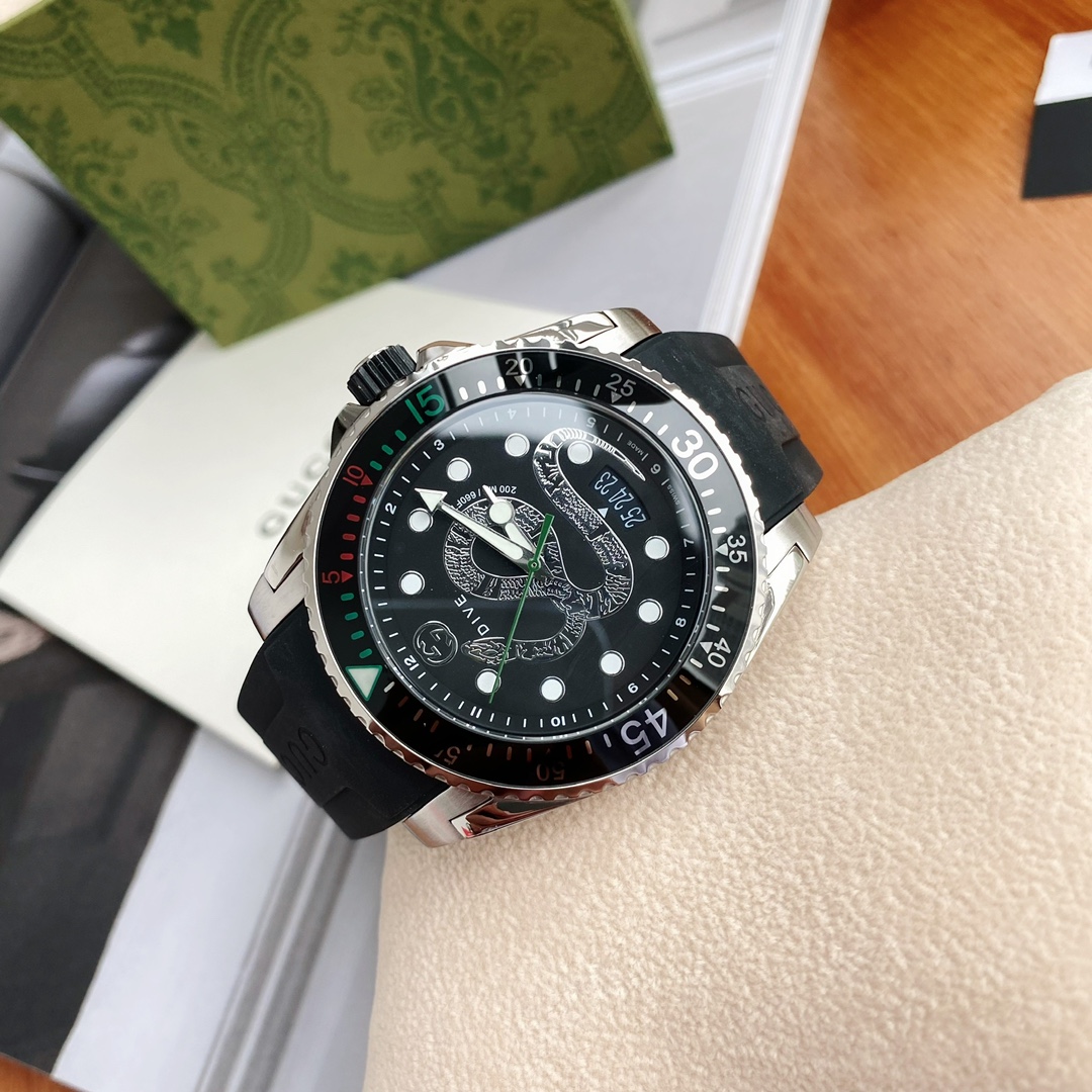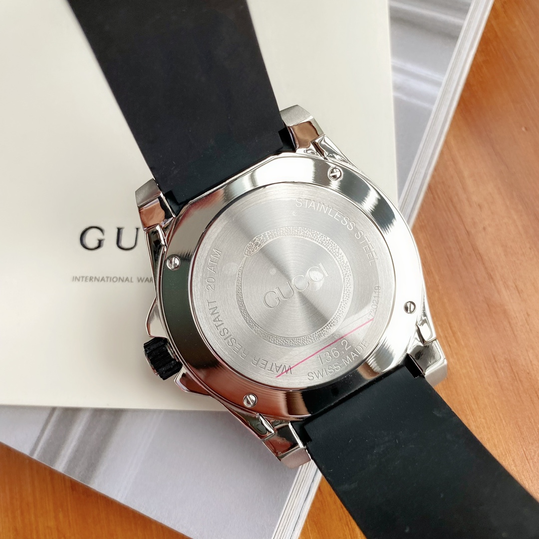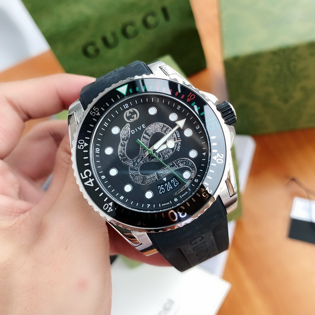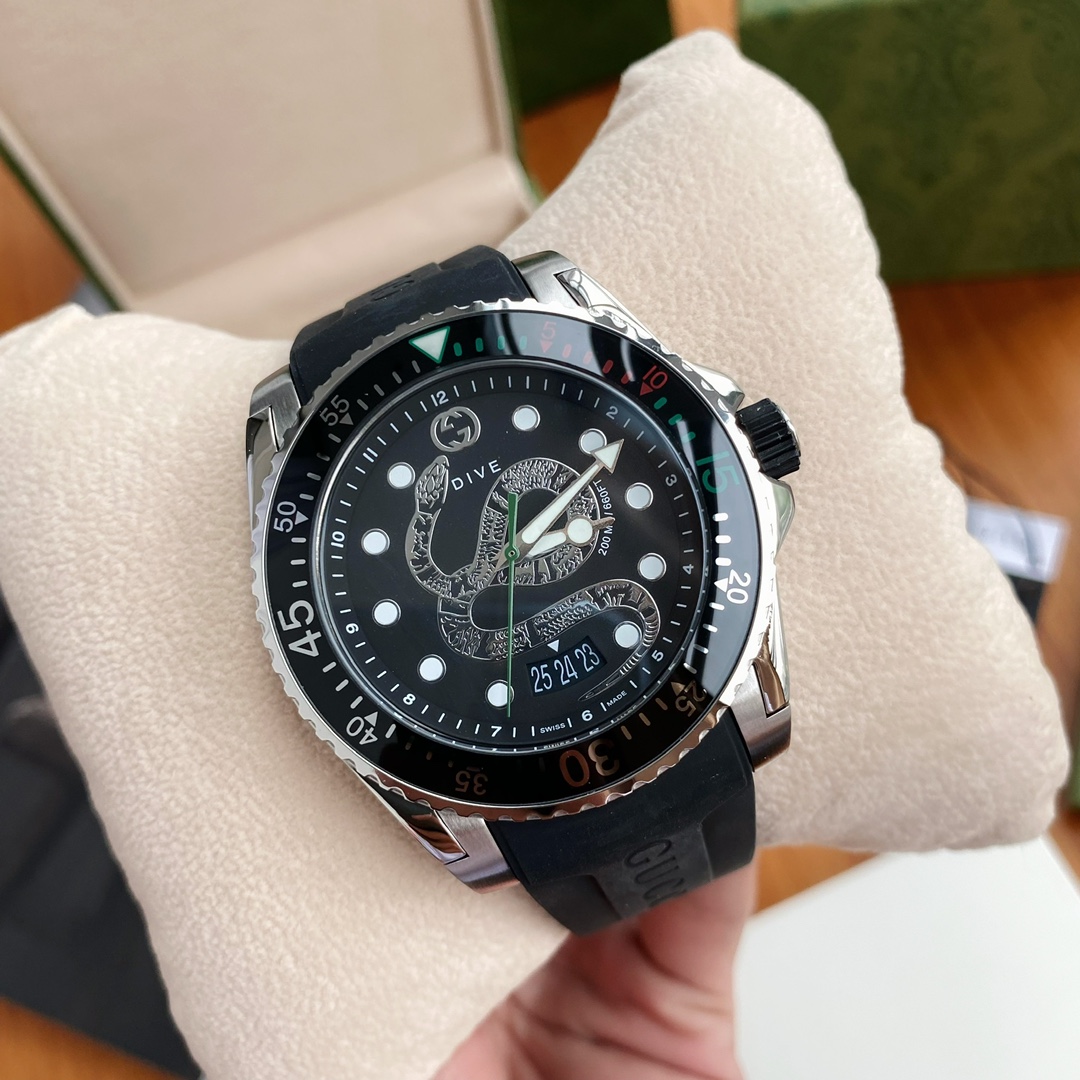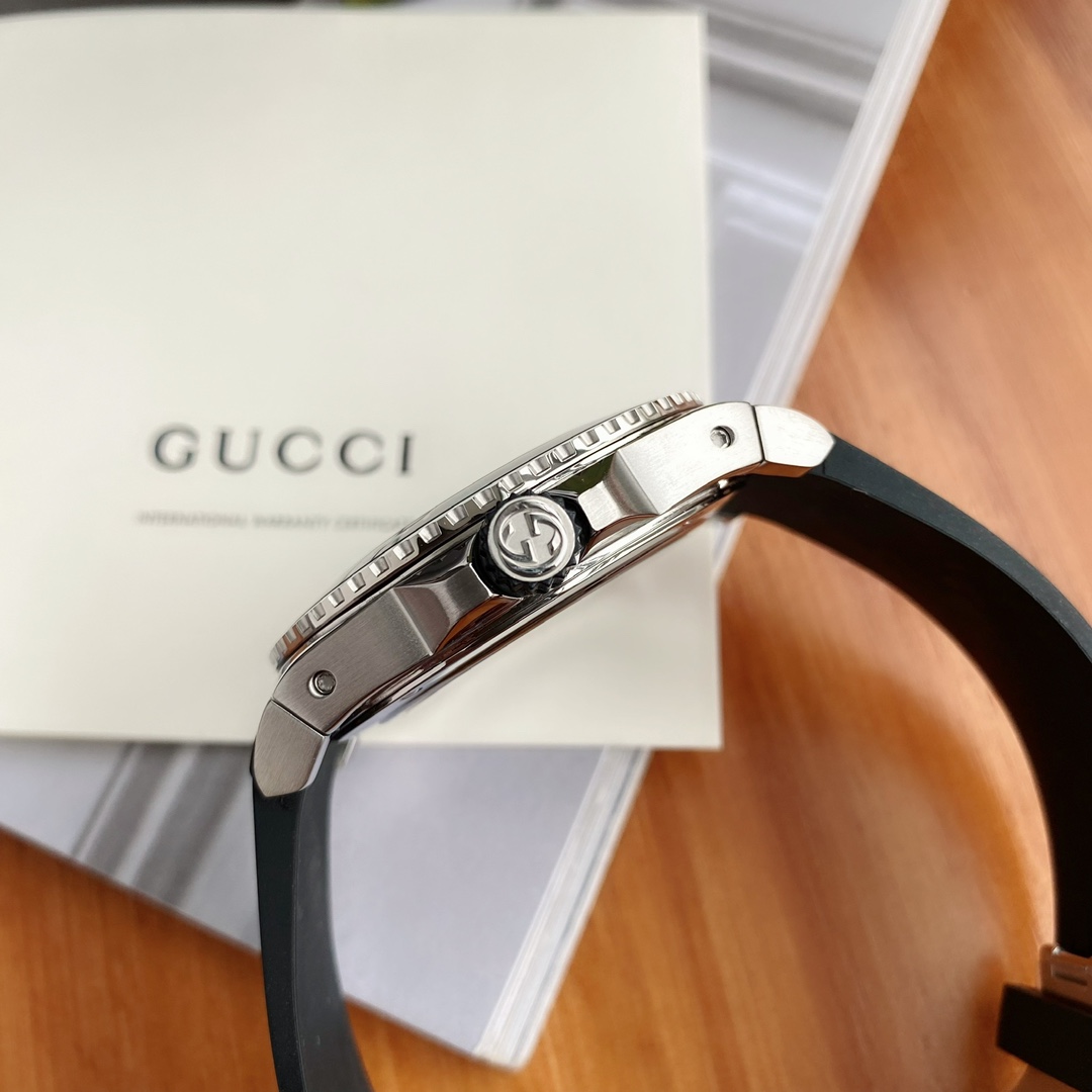 Gucci, 40 mm diameter, with the brand’s iconic “cat” pattern and luminous display as the dial. It is made of stainless steel, finished with satin brushing, and matched with a rubber strap that matches the color of the dial. The unidirectional rotating bezel of the dial is also decorated with fluorescent hour markers.