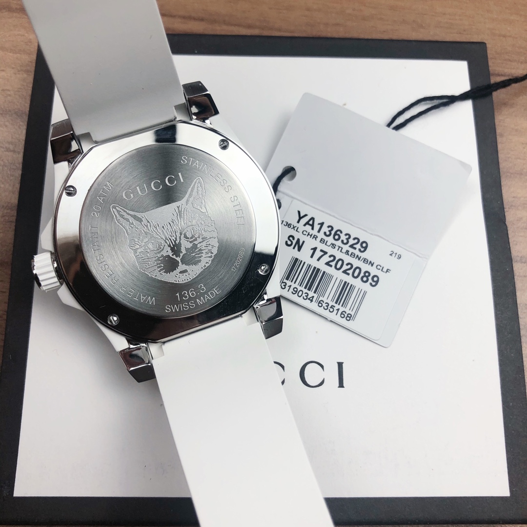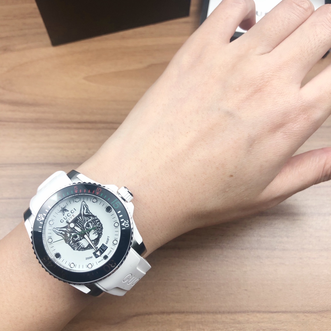 Gucci, 40 mm diameter, with the brand’s iconic “cat” pattern and luminous display as the dial. It is made of stainless steel, finished with satin brushing, and matched with a rubber strap that matches the color of the dial. The unidirectional rotating bezel of the dial is also decorated with fluorescent hour markers.