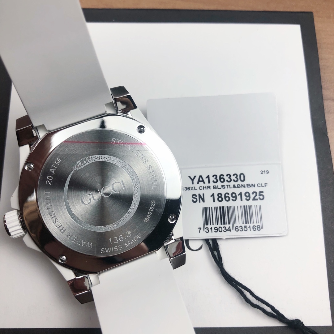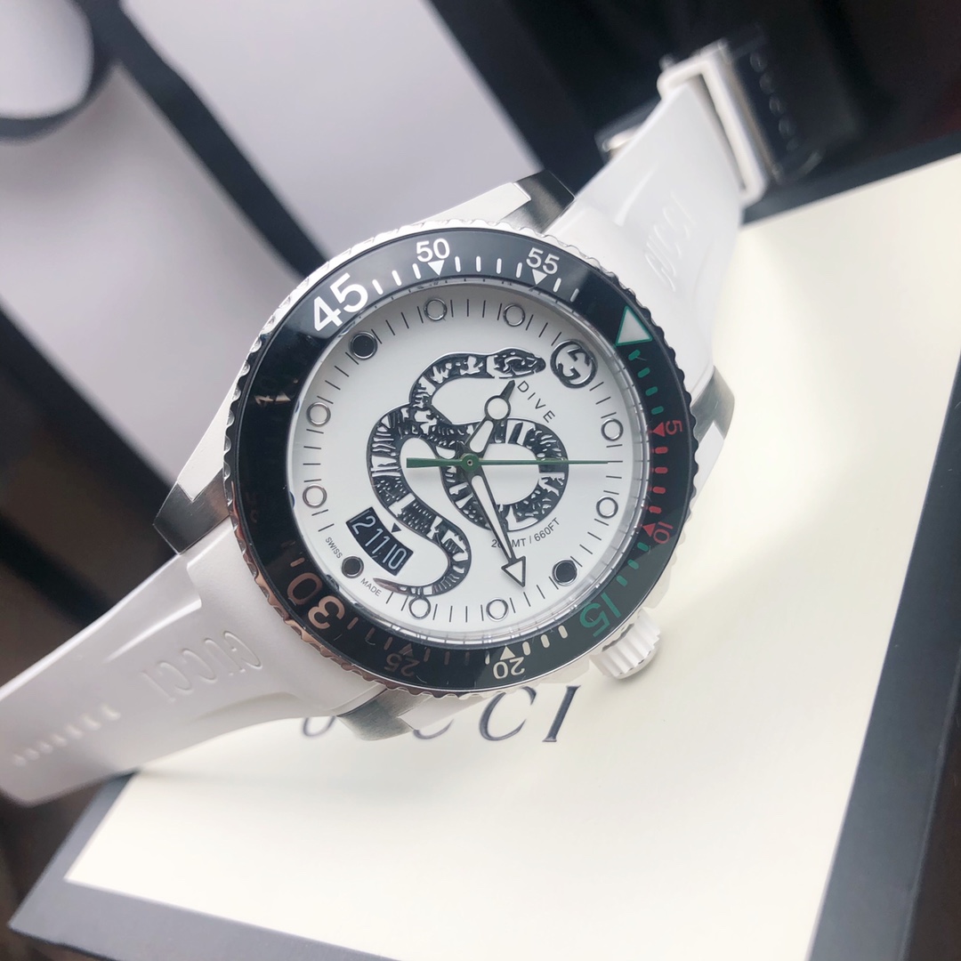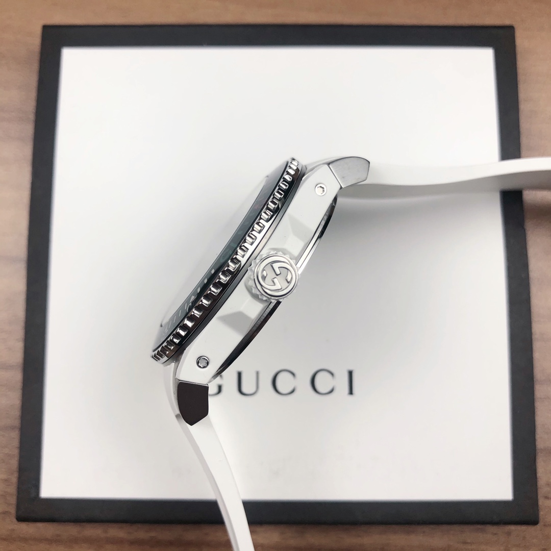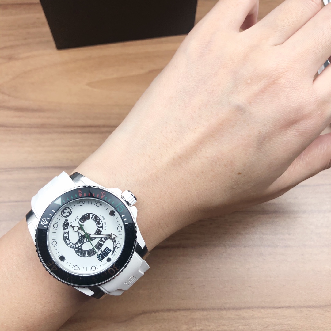Gucci, 40 mm diameter, with the brand’s iconic “cat” pattern and luminous display as the dial. Made of stainless steel, finished with satin brushing, and paired with a rubber strap that matches the color of the dial.
