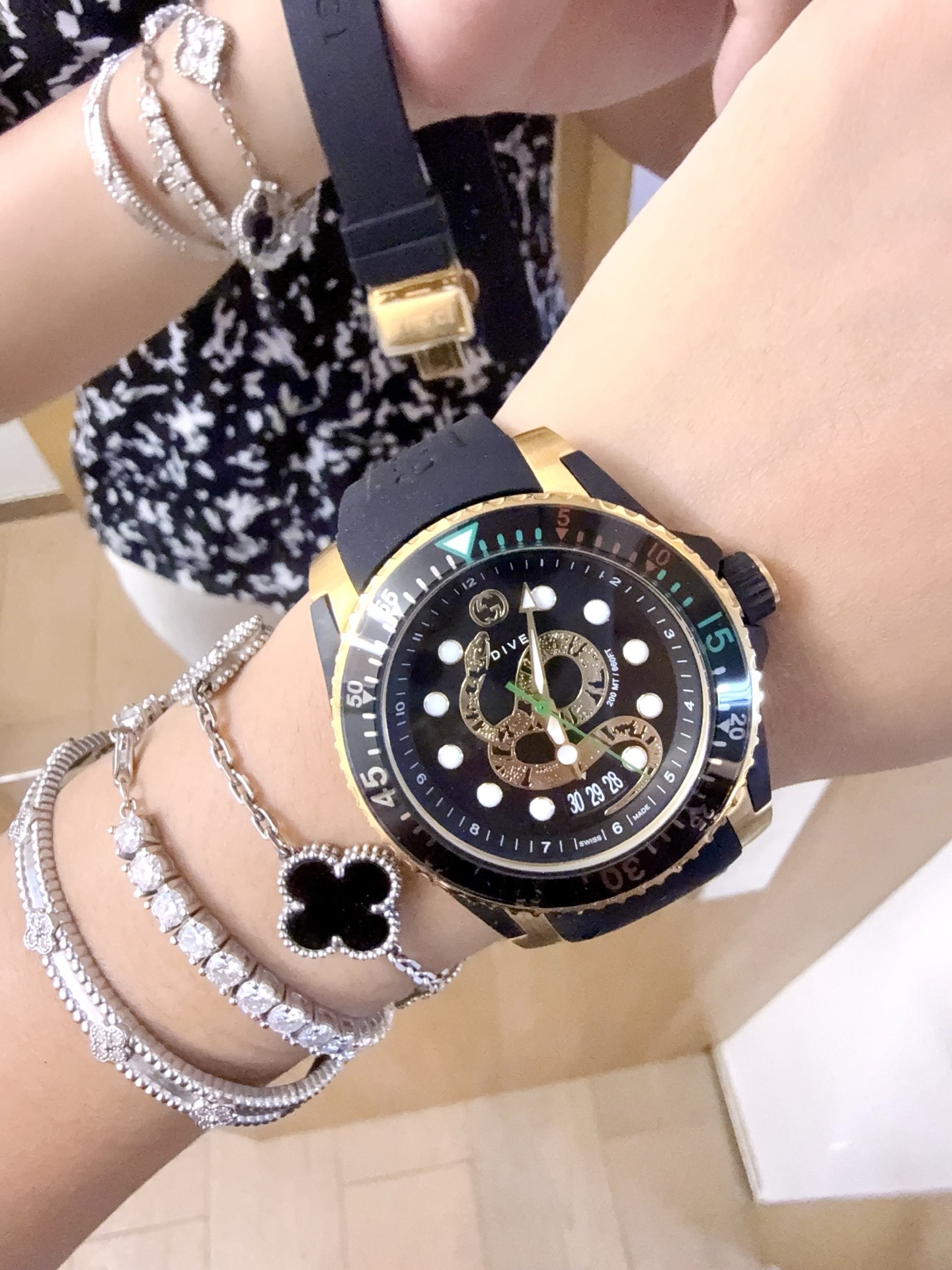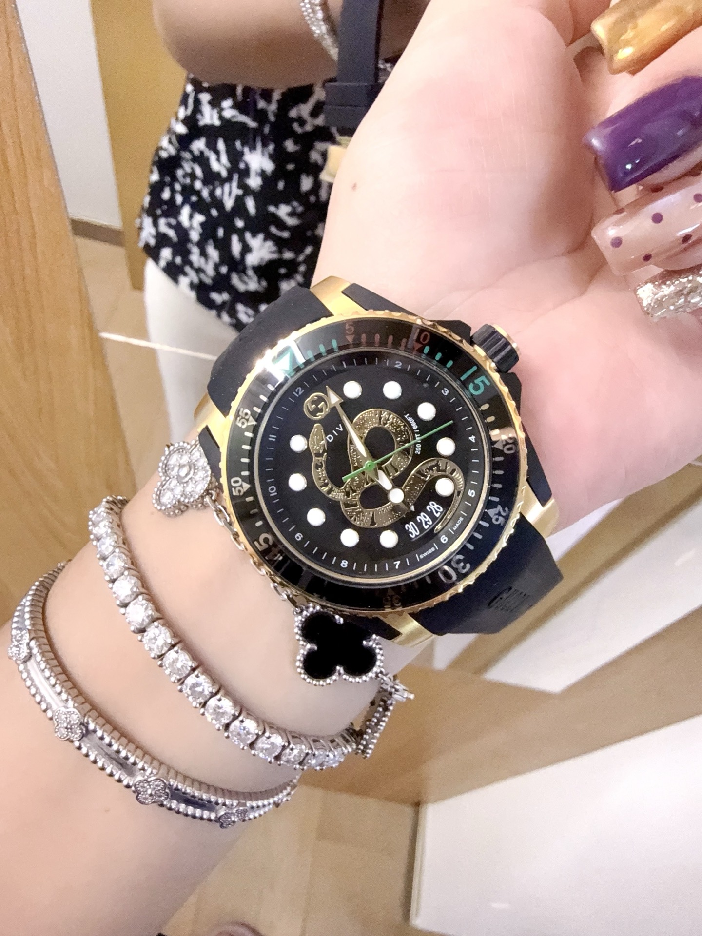 Gucci, 40 mm diameter, with the brand’s iconic “cat” pattern and luminous display as the dial. It is made of stainless steel, finished with satin brushing, and matched with a rubber strap that matches the color of the dial. The unidirectional rotating bezel of the dial is also decorated with fluorescent hour markers.