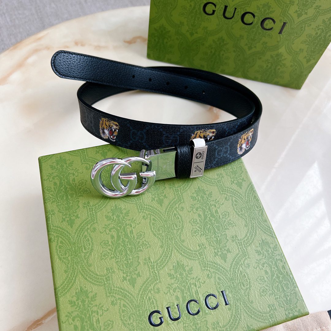 Gucci, width cm, new style reversible leather belt with print and pigskin texture. Accessories continue to lead the trend of Gucci’s new series, demonstrating outstanding quality with unique rich details and practical functions. The highly recognizable double G buckle element makes the entire belt more attractive D
